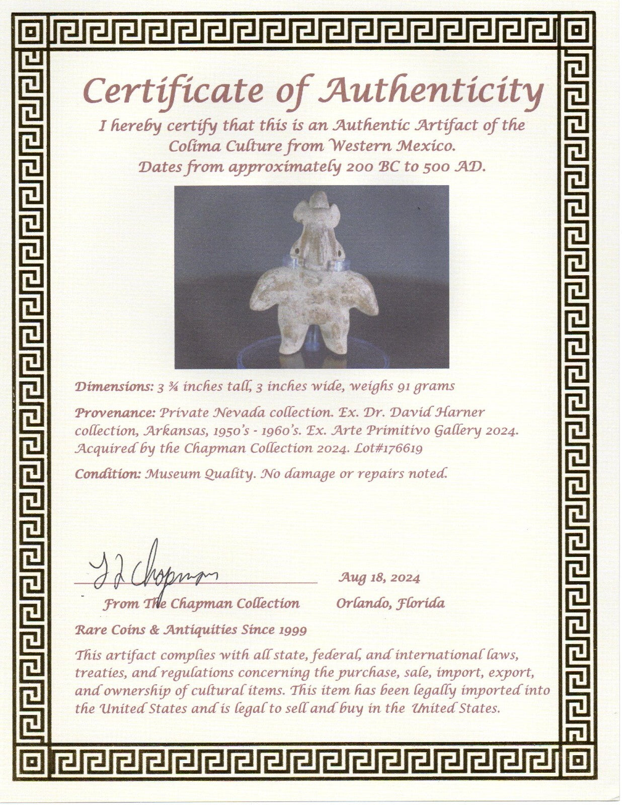Acquired from the world renowned Arte Primitivo Gallery in Downtown Manhattan, New York City. This is the most prestigious gallery of ancient artifacts in the United States. Artifacts from Arte Primitivo are the most sought after in the world. They are instantly recognized and respected by antiquities dealers and collectors alike as being the best of the best. Artifacts that are authenticated by Arte Primitivo instantly increase in value due to their expertise and decades of experience. They are the go to experts when it comes to ancient art. Provenance: Private Nevada collection. Ex. Dr. David Harner collection, Arkansas, 1950’s - 1960’s. Ex. Arte Primitivo Gallery 2024. Acquired by the Chapman Collection 2024. Lot#176619. Condition: Museum Quality.