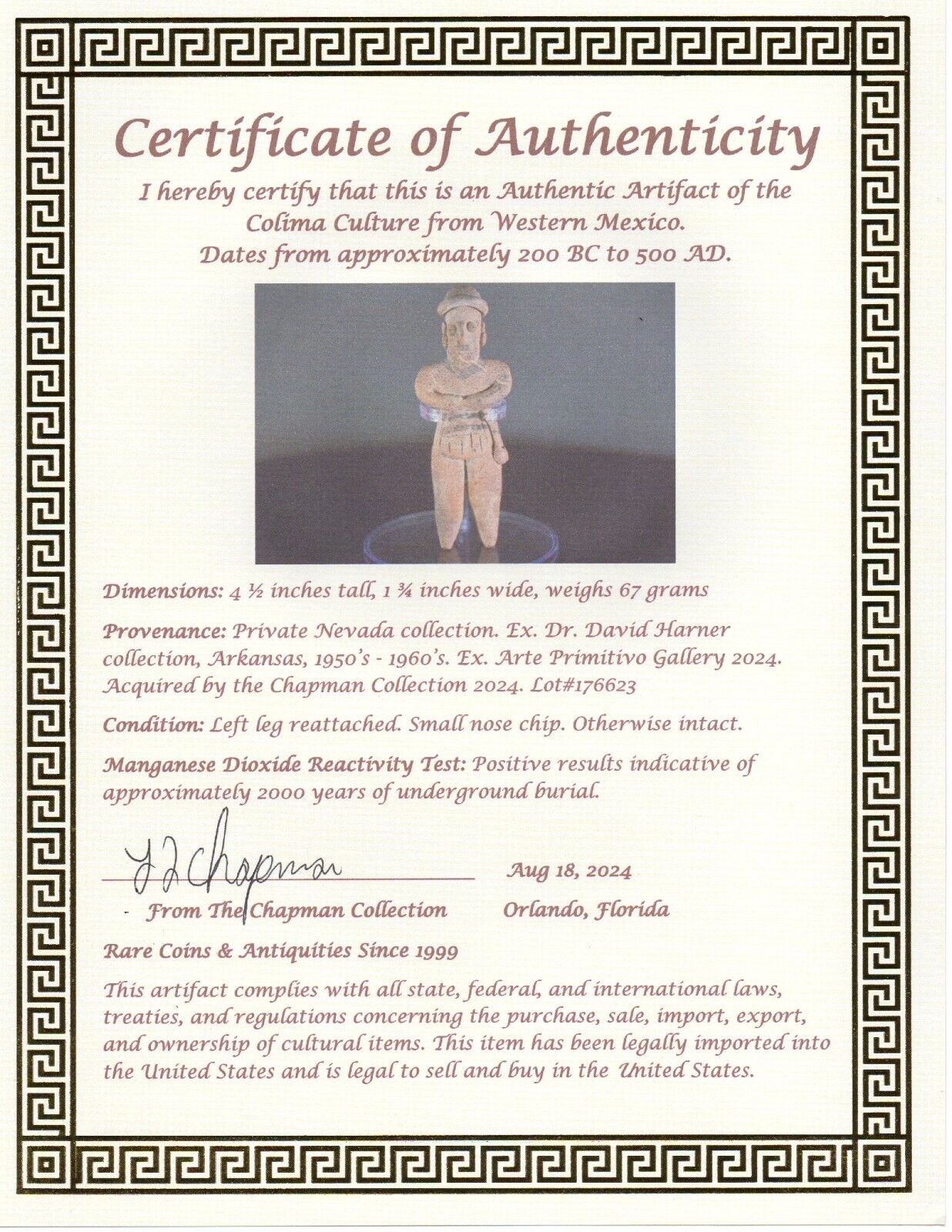 Acquired from the world renowned Arte Primitivo Gallery in Downtown Manhattan, New York City. This is the most prestigious gallery of ancient artifacts in the United States. Artifacts from Arte Primitivo are the most sought after in the world. They are instantly recognized and respected by antiquities dealers and collectors alike as being the best of the best. Artifacts that are authenticated by Arte Primitivo instantly increase in value due to their expertise and decades of experience. They are the go to experts when it comes to ancient art. Provenance: Private Nevada collection. Ex. Dr. David Harner collection, Arkansas, 1950’s - 1960’s. Ex. Arte Primitivo Gallery 2024. Acquired by the Chapman Collection 2024. Lot#176623. Condition: Museum Quality. Left leg reattached. Small nose chip. Otherwise intact.Manganese Dioxide Reactivity Test: Positive results indicative of approximately 2000 years of underground burial.