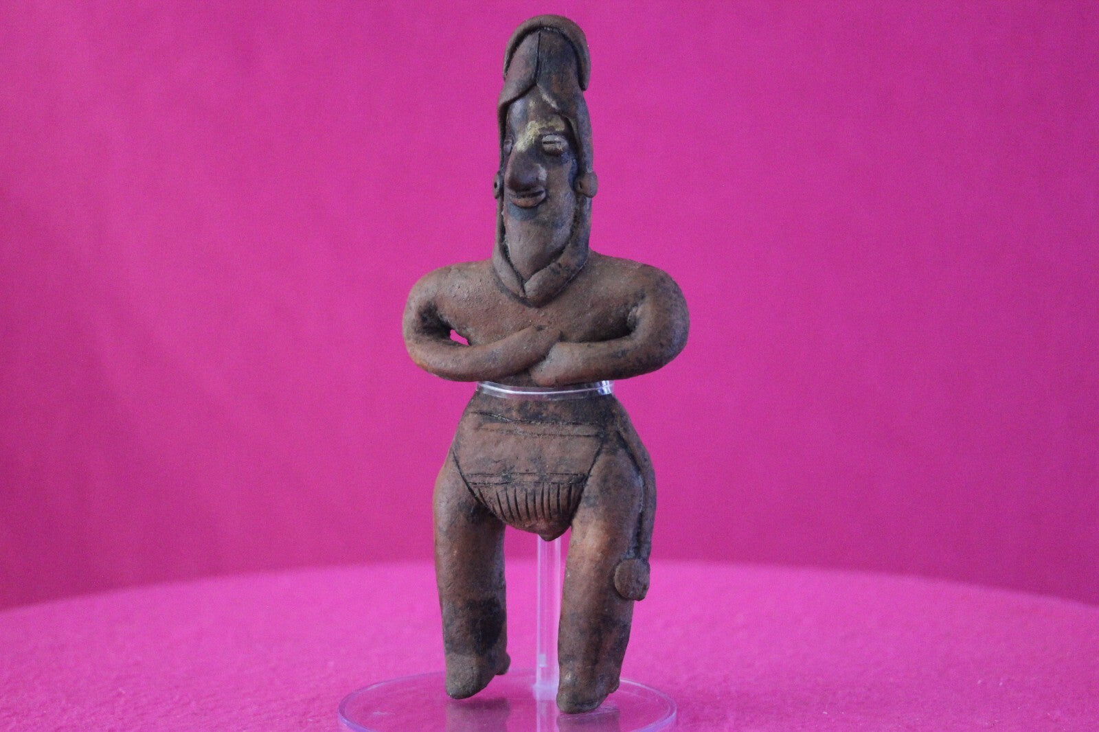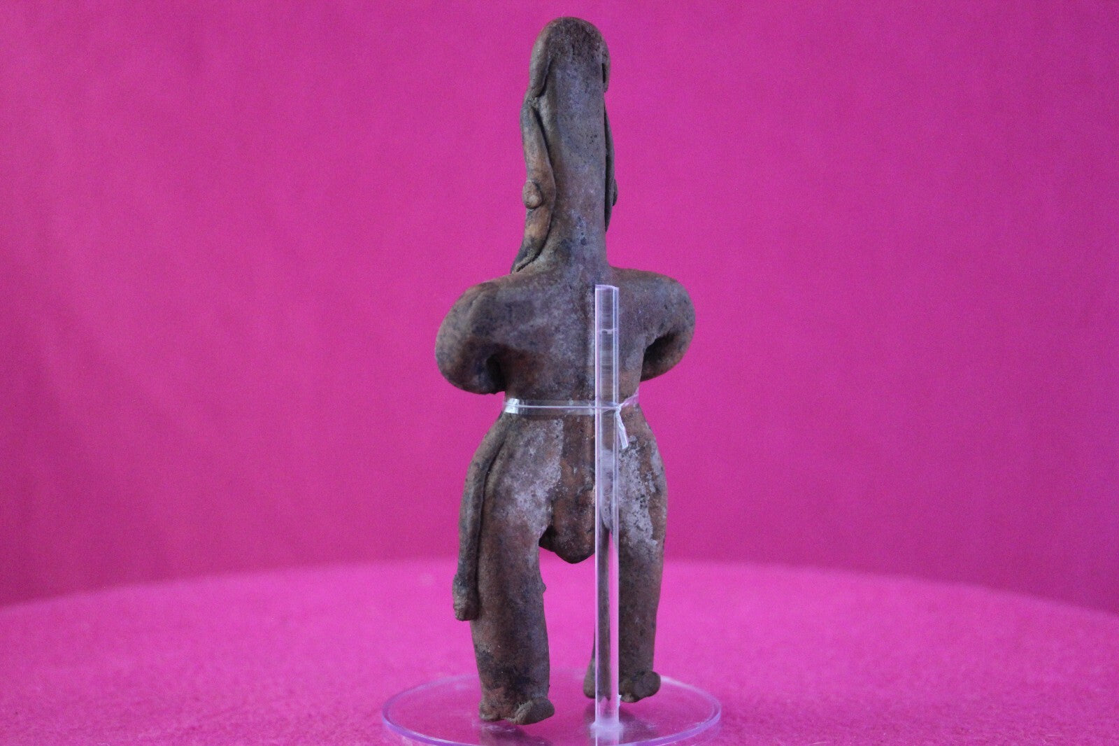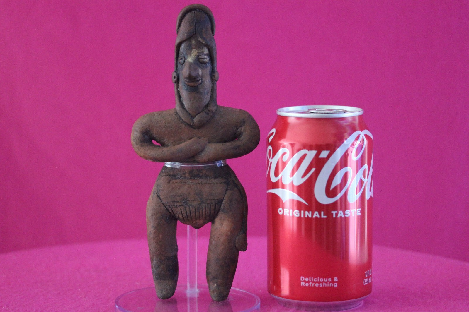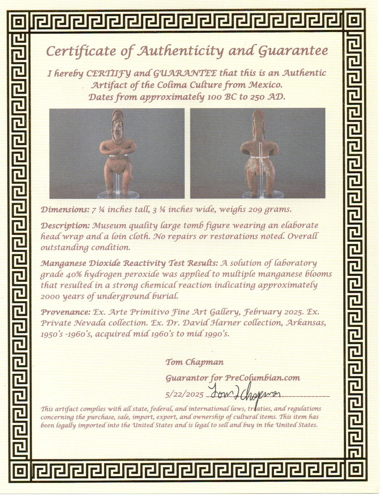 Dimensions: 7 ¼ inches tall, 3 ¼ inches wide, weighs 209 grams.Description: Museum quality large tomb figure wearing an elaborate head wrap and a loin cloth. No repairs or restorations noted. Overall outstanding condition.Manganese Dioxide Reactivity Test Results: A solution of laboratory grade 40% hydrogen peroxide was applied to multiple manganese blooms that resulted in a strong chemical reaction indicating approximately 2000 years of underground burial.Provenance: Ex. Arte Primitivo Fine Art Gallery, February 2025. Ex. Private Nevada collection. Ex. Dr. David Harner collection, Arkansas, 1950’s -1960’s, acquired mid 1960’s to mid 1990’s.
