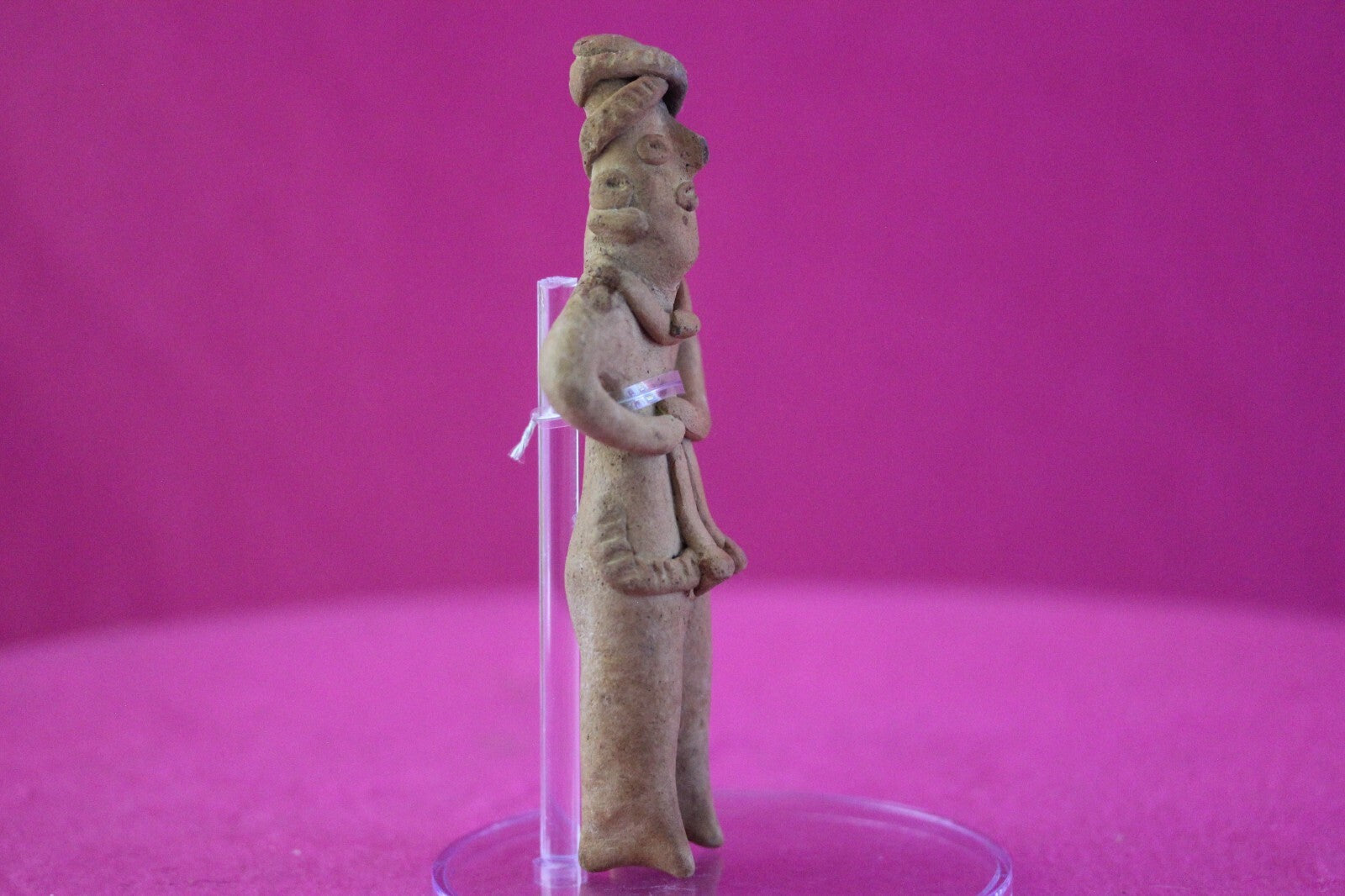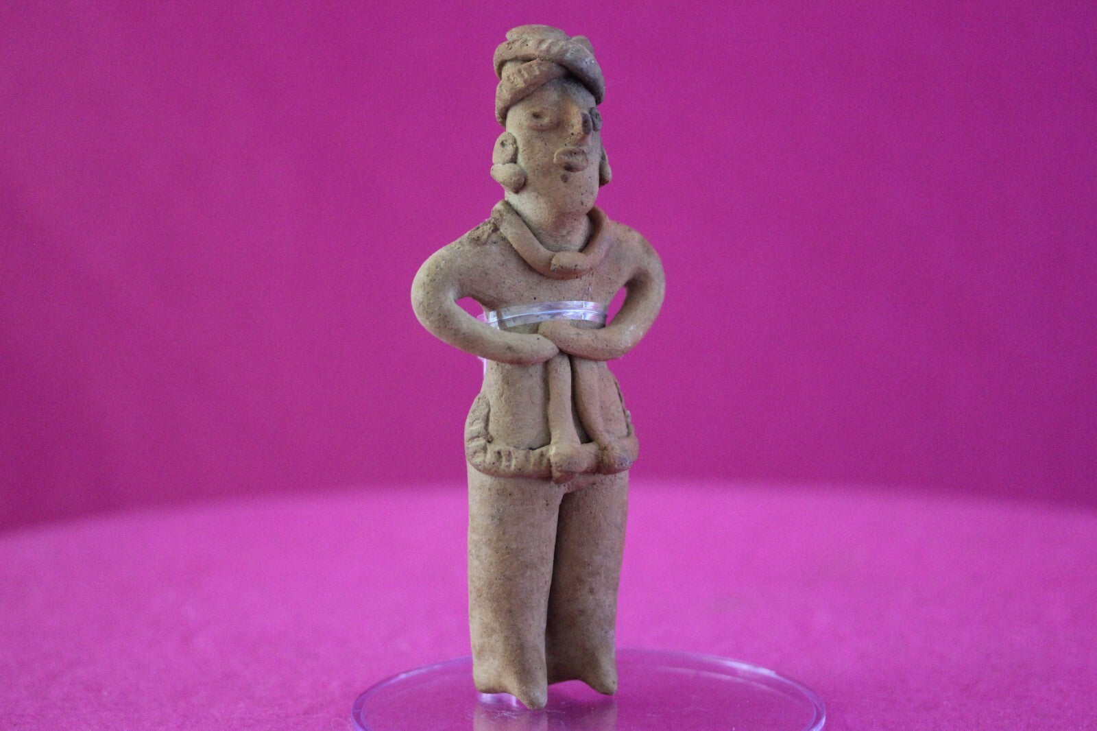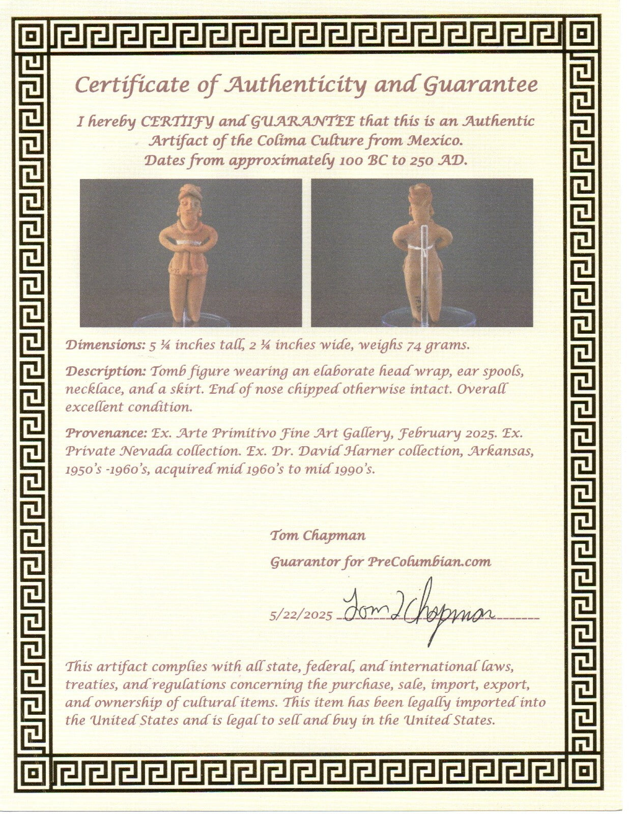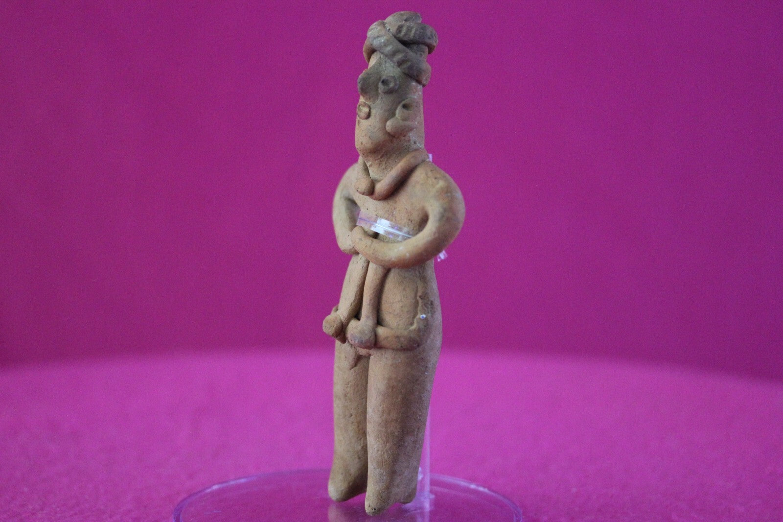Dimensions: 5 ¼ inches tall, 2 ¼ inches wide, weighs 74 grams.Description: Tomb figure wearing an elaborate head wrap, ear spools, necklace, and a skirt. End of nose chipped otherwise intact. Overall excellent condition.Provenance: Ex. Arte Primitivo Fine Art Gallery, February 2025. Ex. Private Nevada collection. Ex. Dr. David Harner collection, Arkansas, 1950’s -1960’s, acquired mid 1960’s to mid 1990’s.