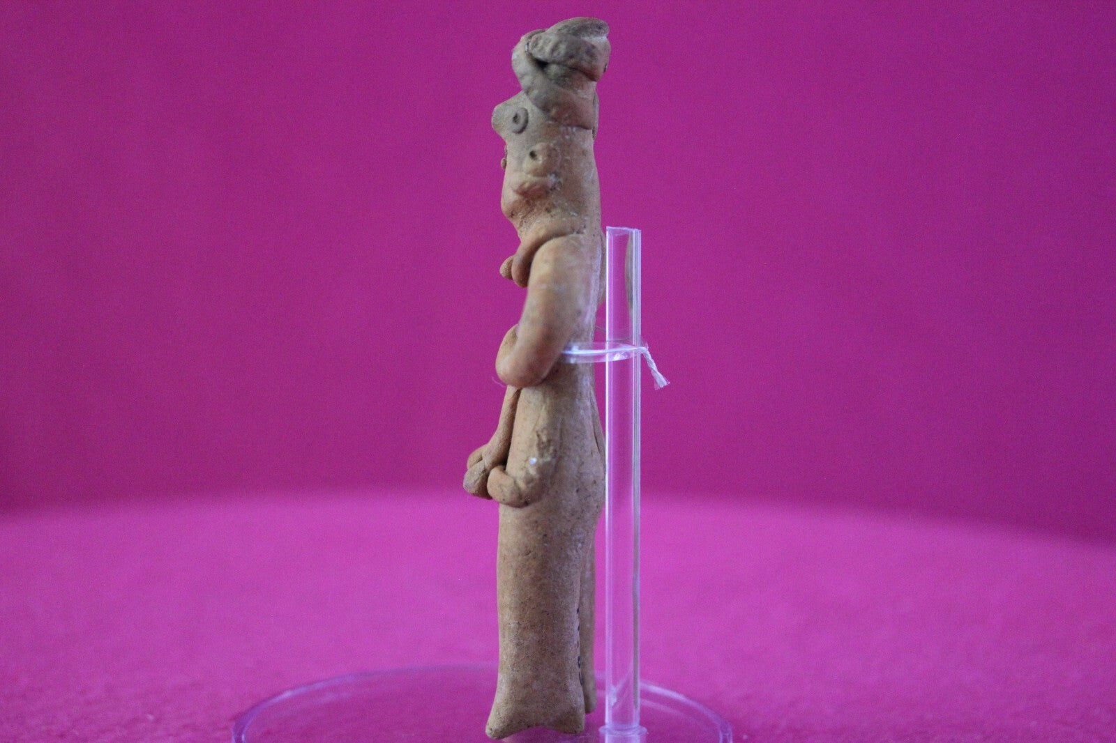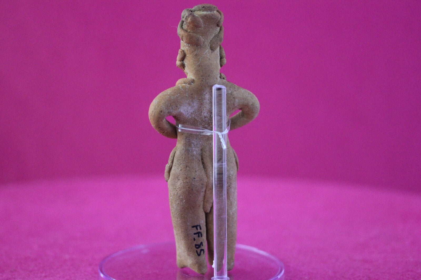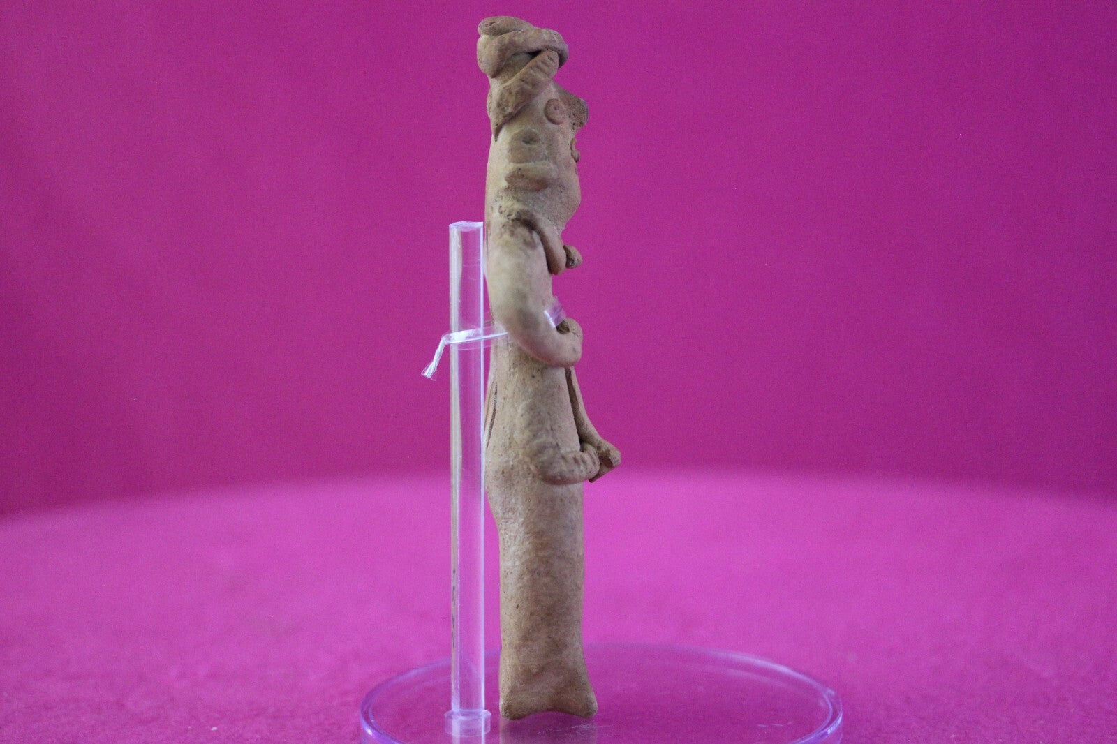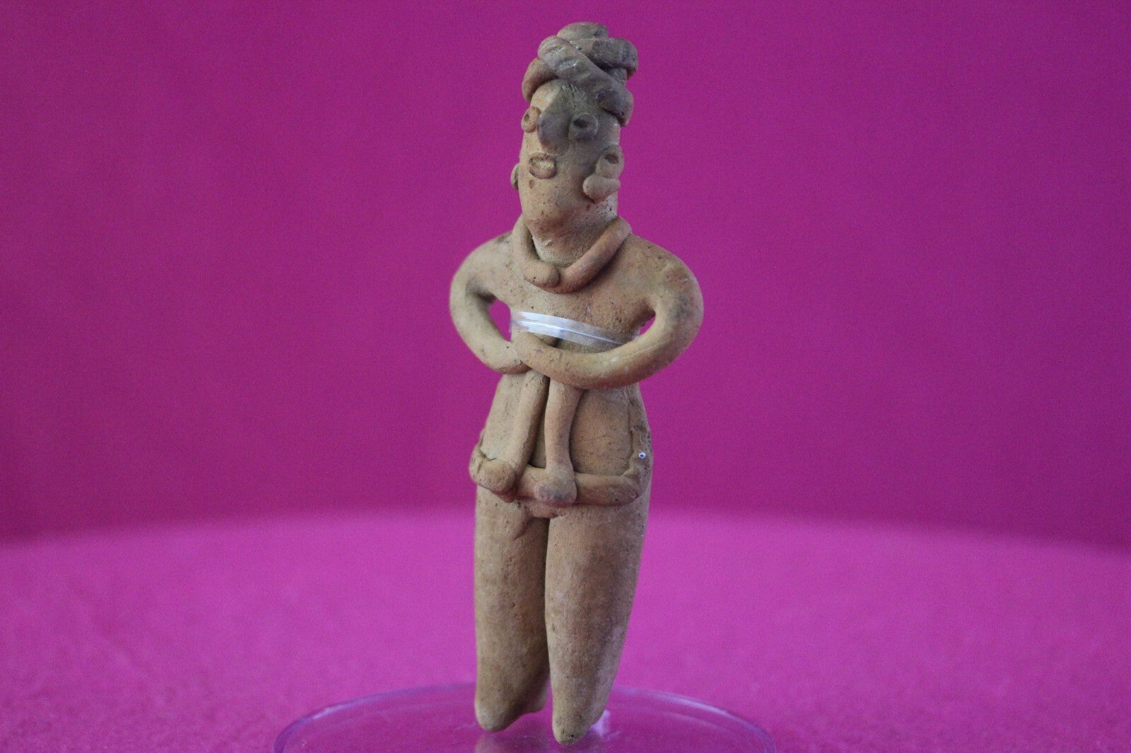 Dimensions: 5 ¼ inches tall, 2 ¼ inches wide, weighs 74 grams.Description: Tomb figure wearing an elaborate head wrap, ear spools, necklace, and a skirt. End of nose chipped otherwise intact. Overall excellent condition.Provenance: Ex. Arte Primitivo Fine Art Gallery, February 2025. Ex. Private Nevada collection. Ex. Dr. David Harner collection, Arkansas, 1950’s -1960’s, acquired mid 1960’s to mid 1990’s.