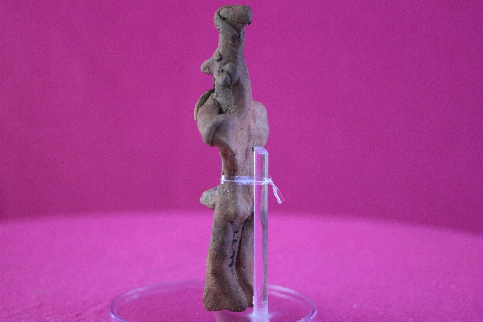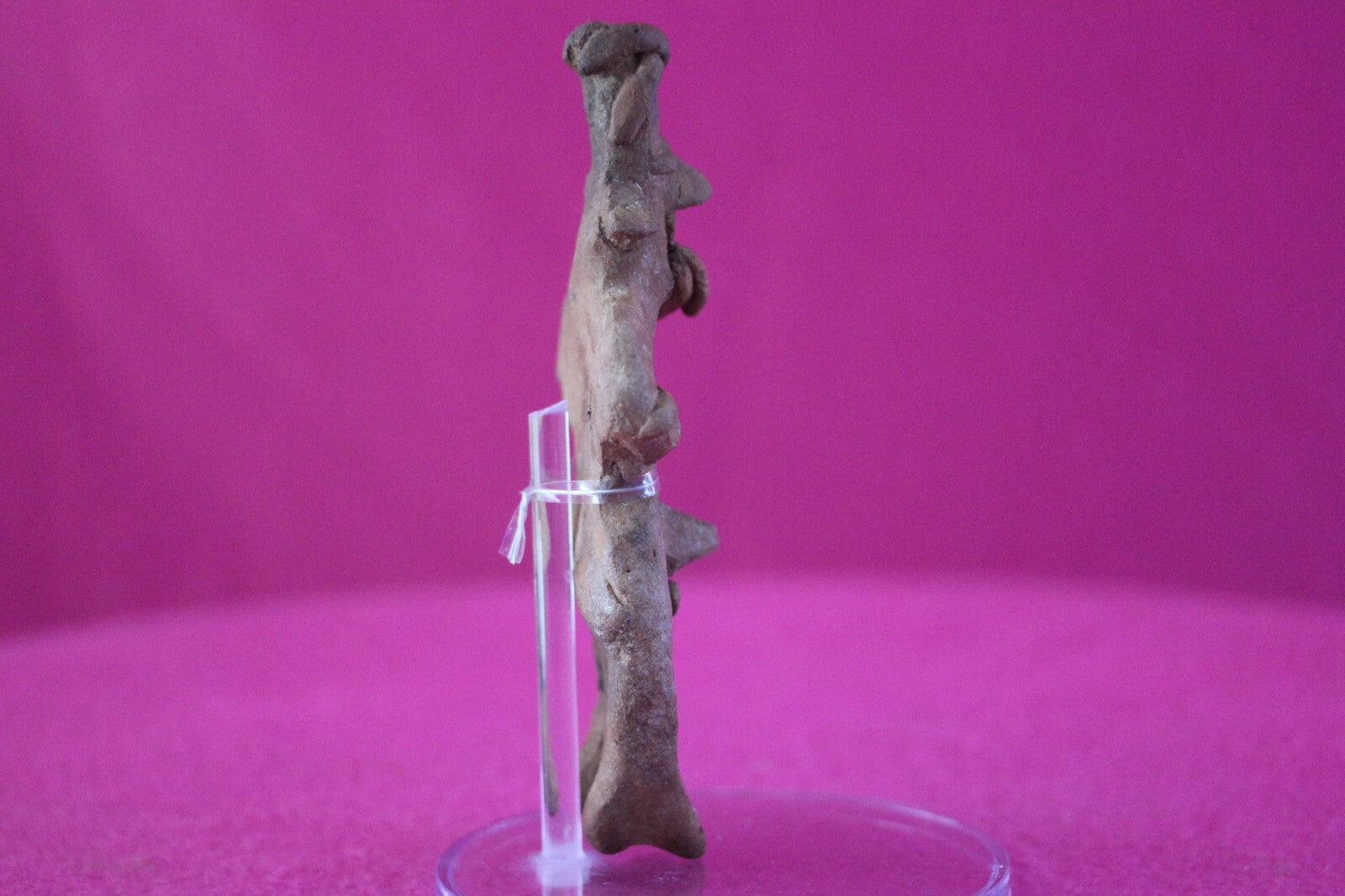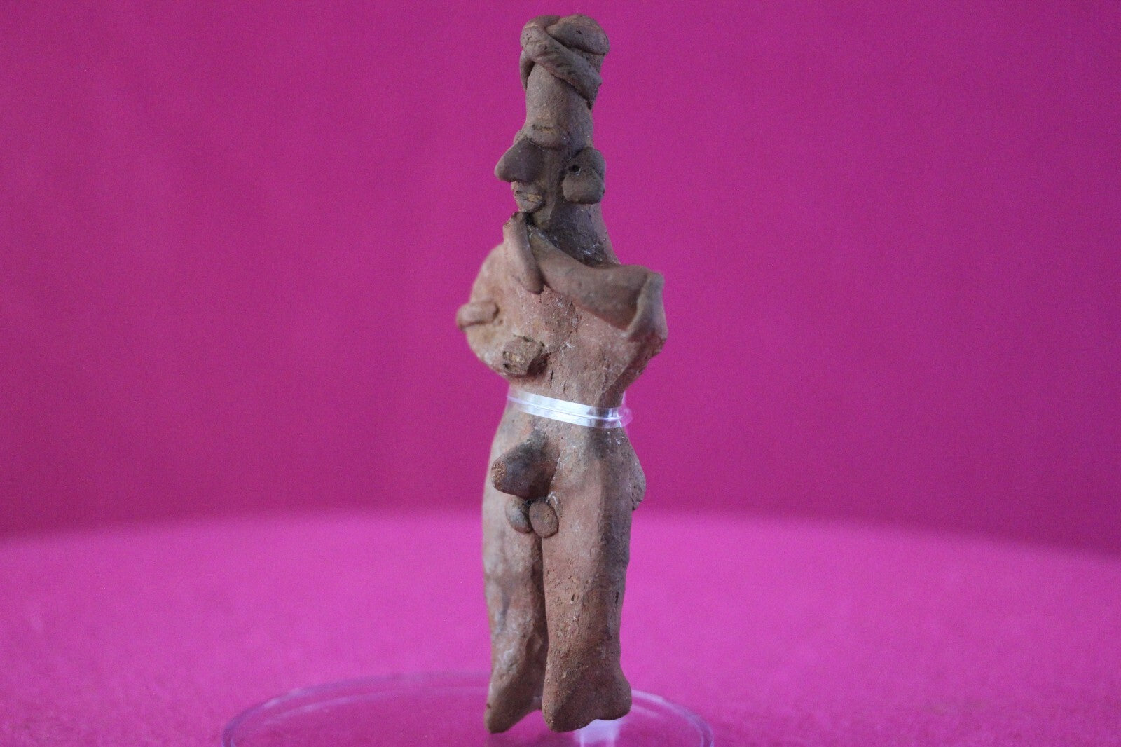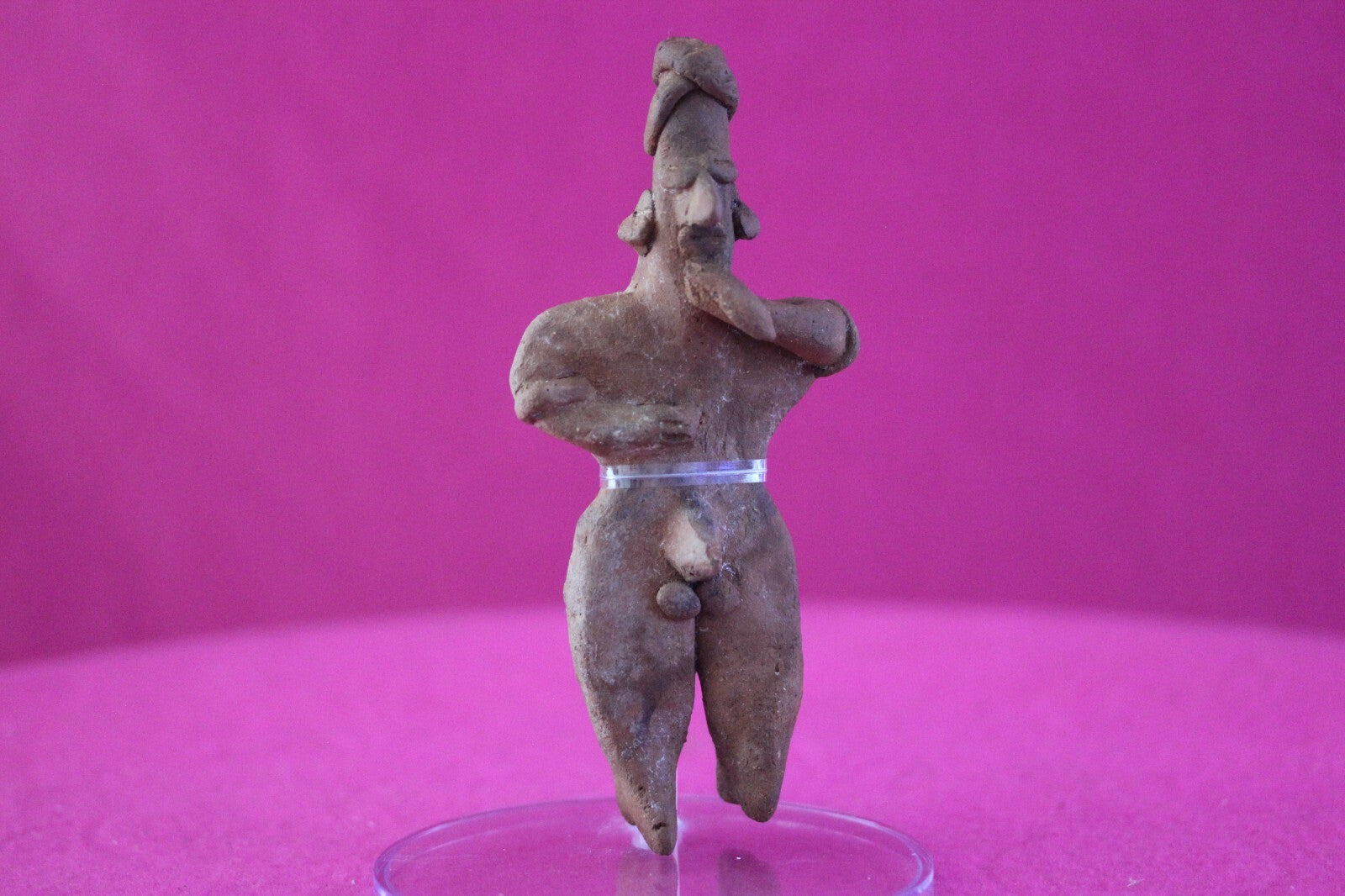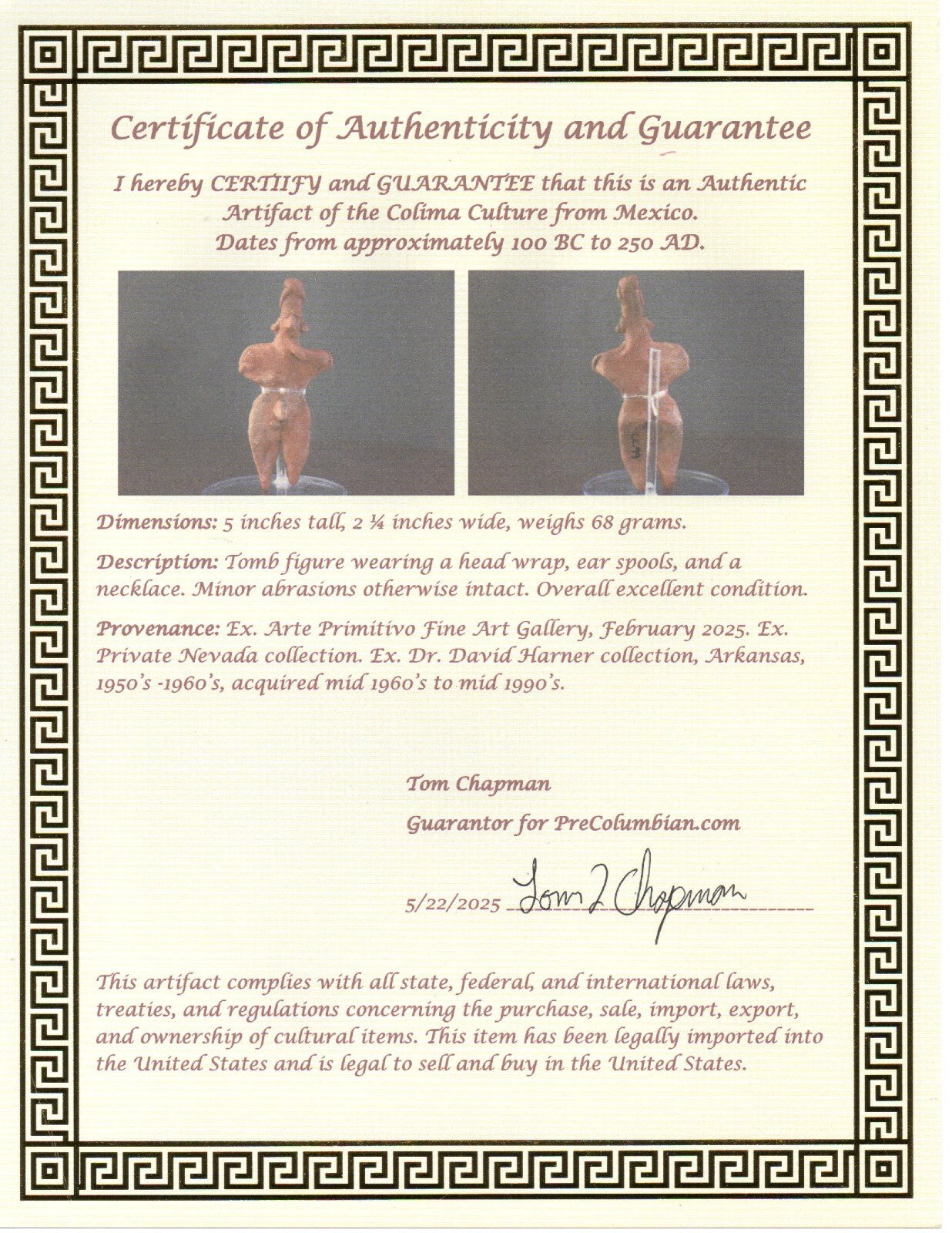 Dimensions: 5 inches tall, 2 ¼ inches wide, weighs 68 grams.Description: Tomb figure wearing a head wrap, ear spools, and a necklace. Minor abrasions otherwise intact. Overall excellent condition.Provenance: Ex. Arte Primitivo Fine Art Gallery, February 2025. Ex. Private Nevada collection. Ex. Dr. David Harner collection, Arkansas, 1950’s -1960’s, acquired mid 1960’s to mid 1990’s.