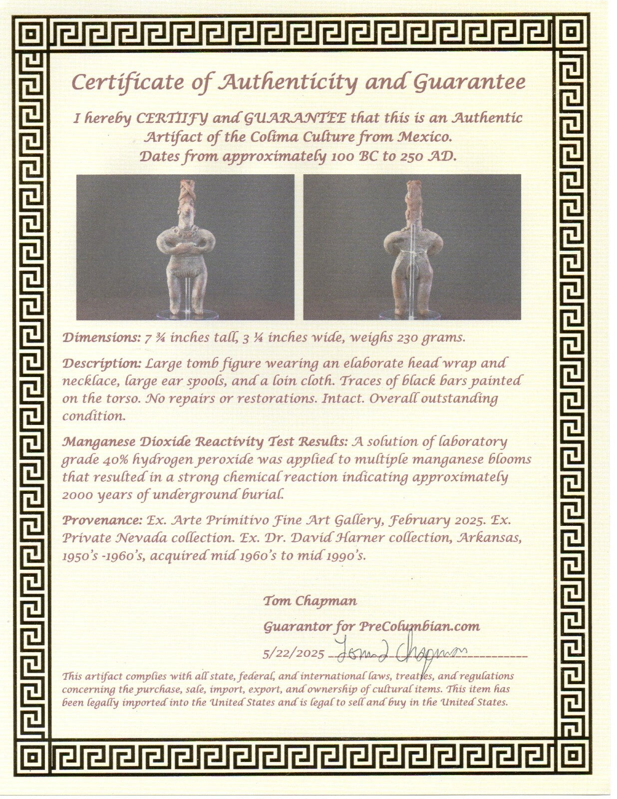 Dimensions: 7 ¾ inches tall, 3 ¼ inches wide, weighs 230 grams.Description: Large tomb figure wearing an elaborate head wrap and necklace, large ear spools, and a loin cloth. Traces of black bars painted on the torso. No repairs or restorations. Intact. Overall outstanding condition.Manganese Dioxide Reactivity Test Results: A solution of laboratory grade 40% hydrogen peroxide was applied to multiple manganese blooms that resulted in a strong chemical reaction indicating approximately 2000 years of underground burial.Provenance: Ex. Arte Primitivo Fine Art Gallery, February 2025. Ex. Private Nevada collection. Ex. Dr. David Harner collection, Arkansas, 1950’s -1960’s, acquired mid 1960’s to mid 1990’s.