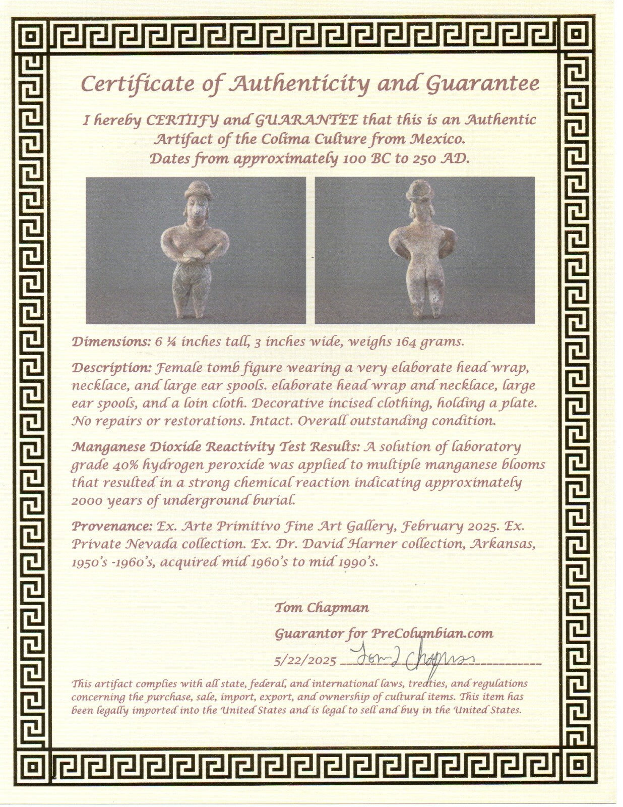 Dimensions: 6 ¼ inches tall, 3 inches wide, weighs 164 grams.Description: Female tomb figure wearing a very elaborate head wrap, necklace, and large ear spools. elaborate head wrap and necklace, large ear spools, and a loin cloth. Decorative incised clothing, holding a plate. No repairs or restorations. Intact. Overall outstanding condition.Manganese Dioxide Reactivity Test Results: A solution of laboratory grade 40% hydrogen peroxide was applied to multiple manganese blooms that resulted in a strong chemical reaction indicating approximately 2000 years of underground burial.Provenance: Ex. Arte Primitivo Fine Art Gallery, February 2025. Ex. Private Nevada collection. Ex. Dr. David Harner collection, Arkansas, 1950’s -1960’s, acquired mid 1960’s to mid 1990’s.