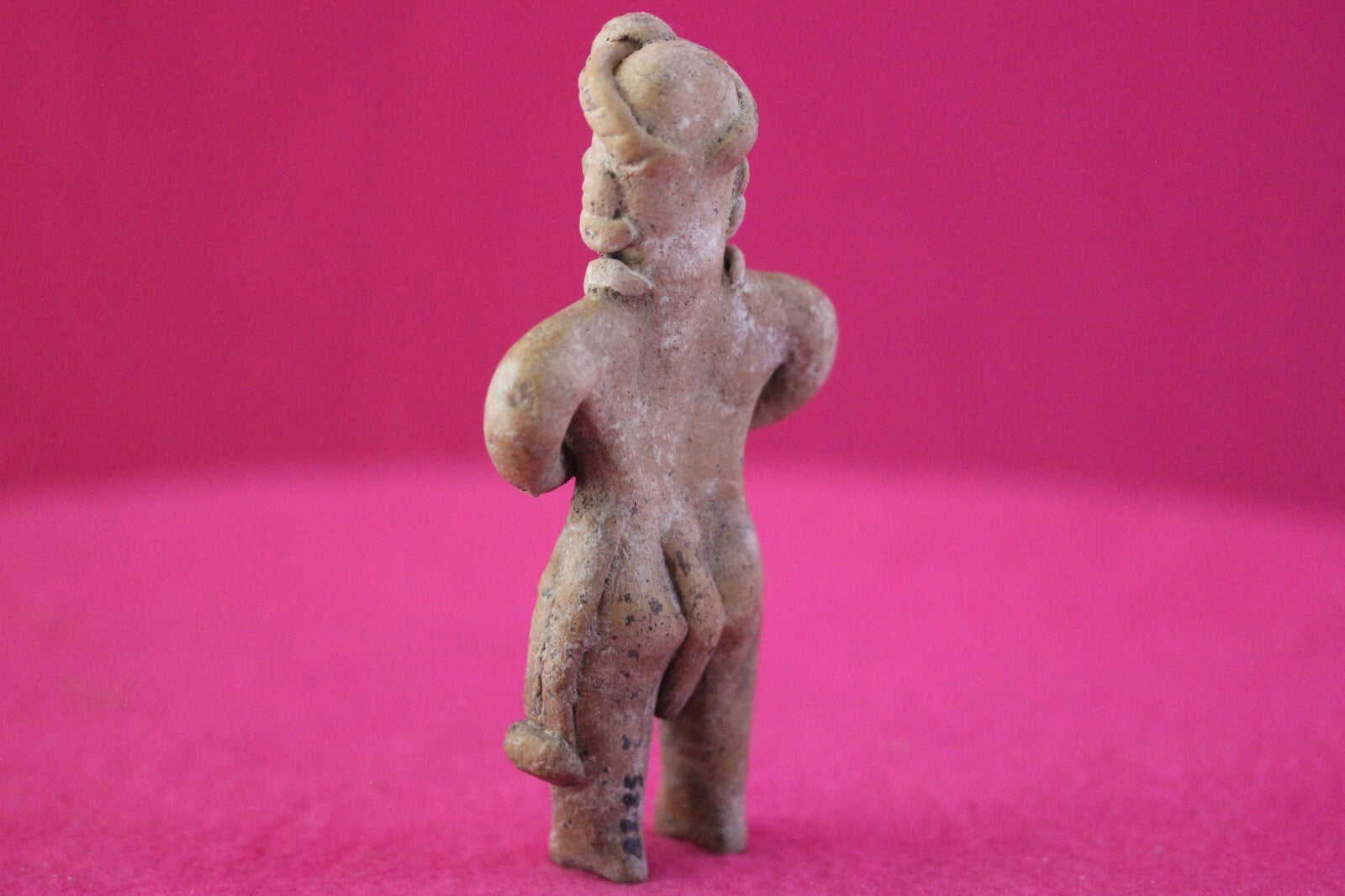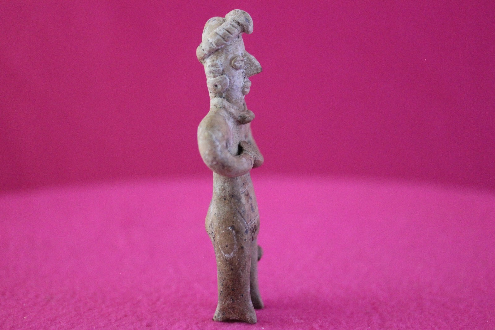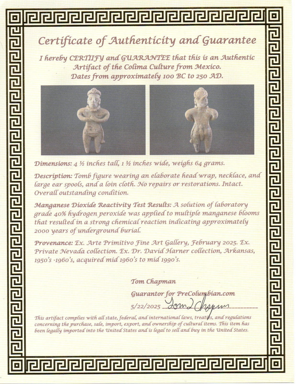 Dimensions: 4 ½ inches tall, 1 ½ inches wide, weighs 64 grams.Description: Tomb figure wearing an elaborate head wrap, necklace, and large ear spools, and a loin cloth. No repairs or restorations. Intact. Overall outstanding condition.Manganese Dioxide Reactivity Test Results: A solution of laboratory grade 40% hydrogen peroxide was applied to multiple manganese blooms that resulted in a strong chemical reaction indicating approximately 2000 years of underground burial.