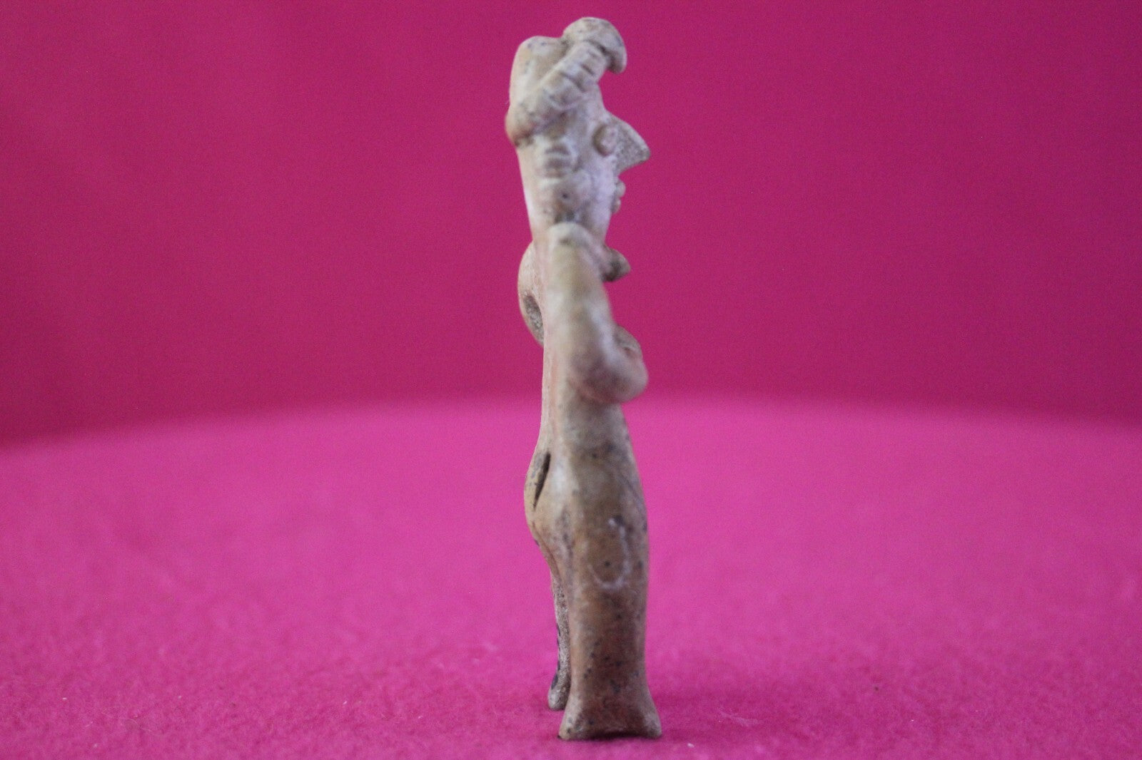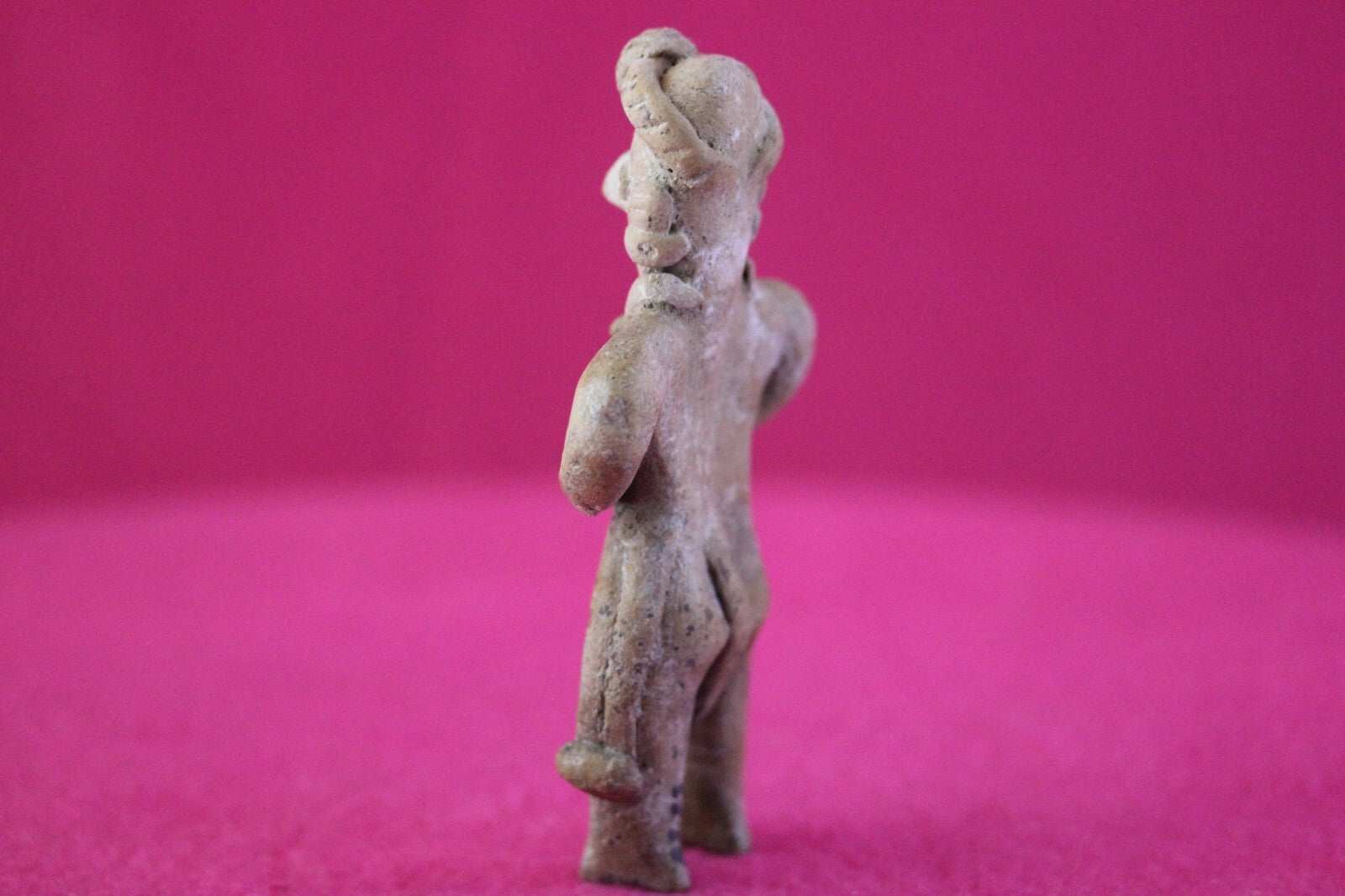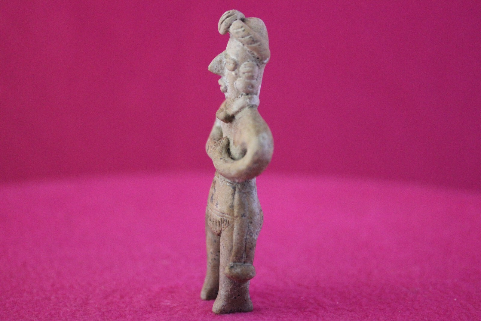 Dimensions: 4 ½ inches tall, 1 ½ inches wide, weighs 64 grams.Description: Tomb figure wearing an elaborate head wrap, necklace, and large ear spools, and a loin cloth. No repairs or restorations. Intact. Overall outstanding condition.Manganese Dioxide Reactivity Test Results: A solution of laboratory grade 40% hydrogen peroxide was applied to multiple manganese blooms that resulted in a strong chemical reaction indicating approximately 2000 years of underground burial.