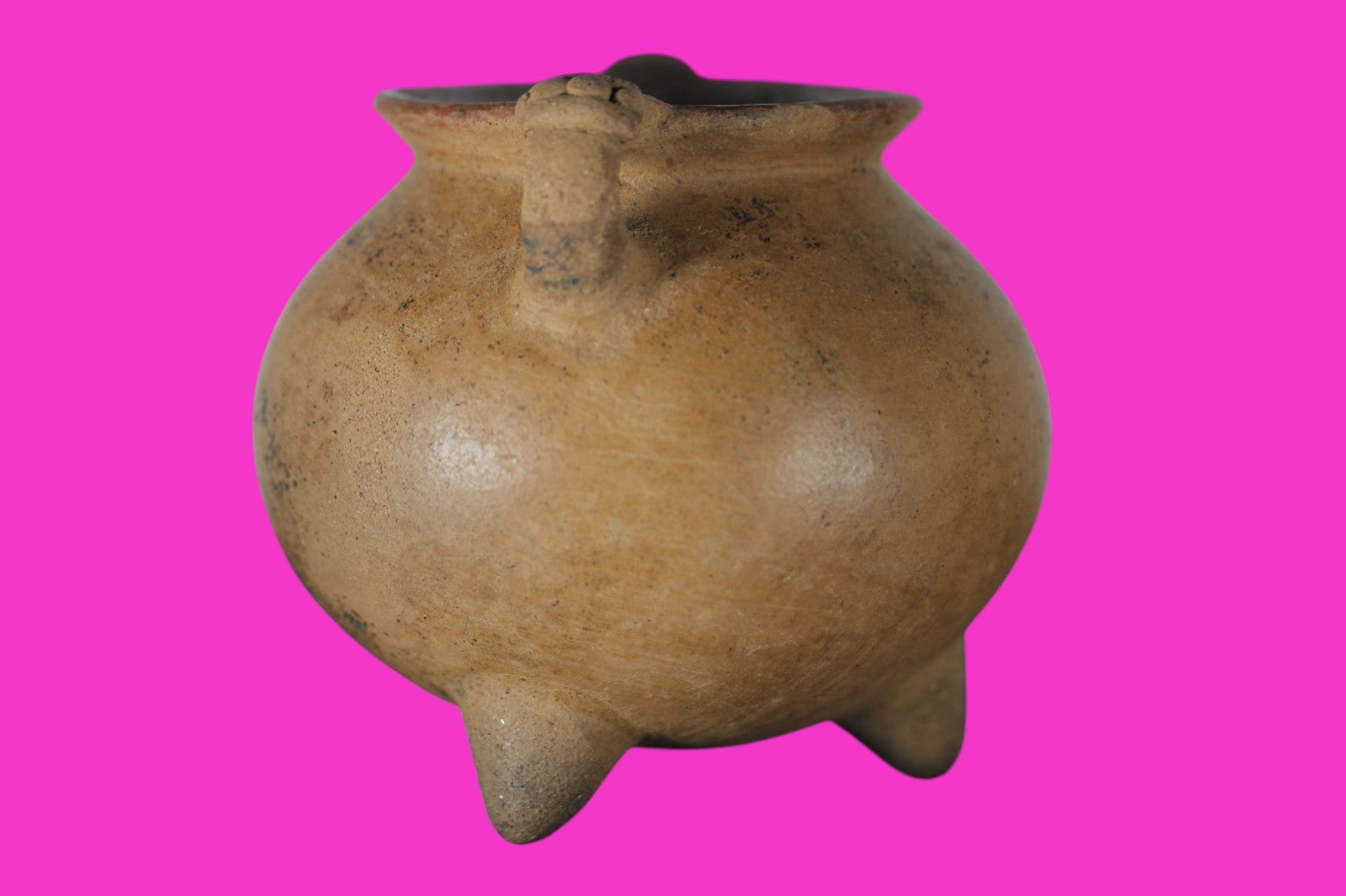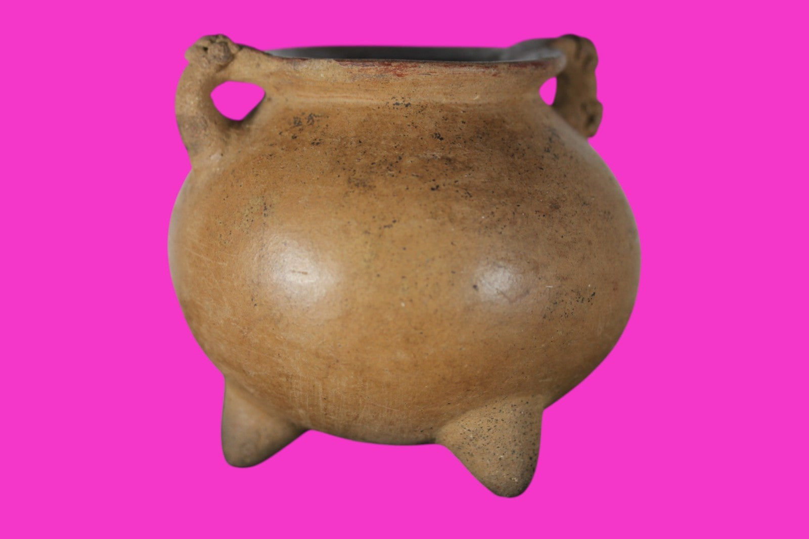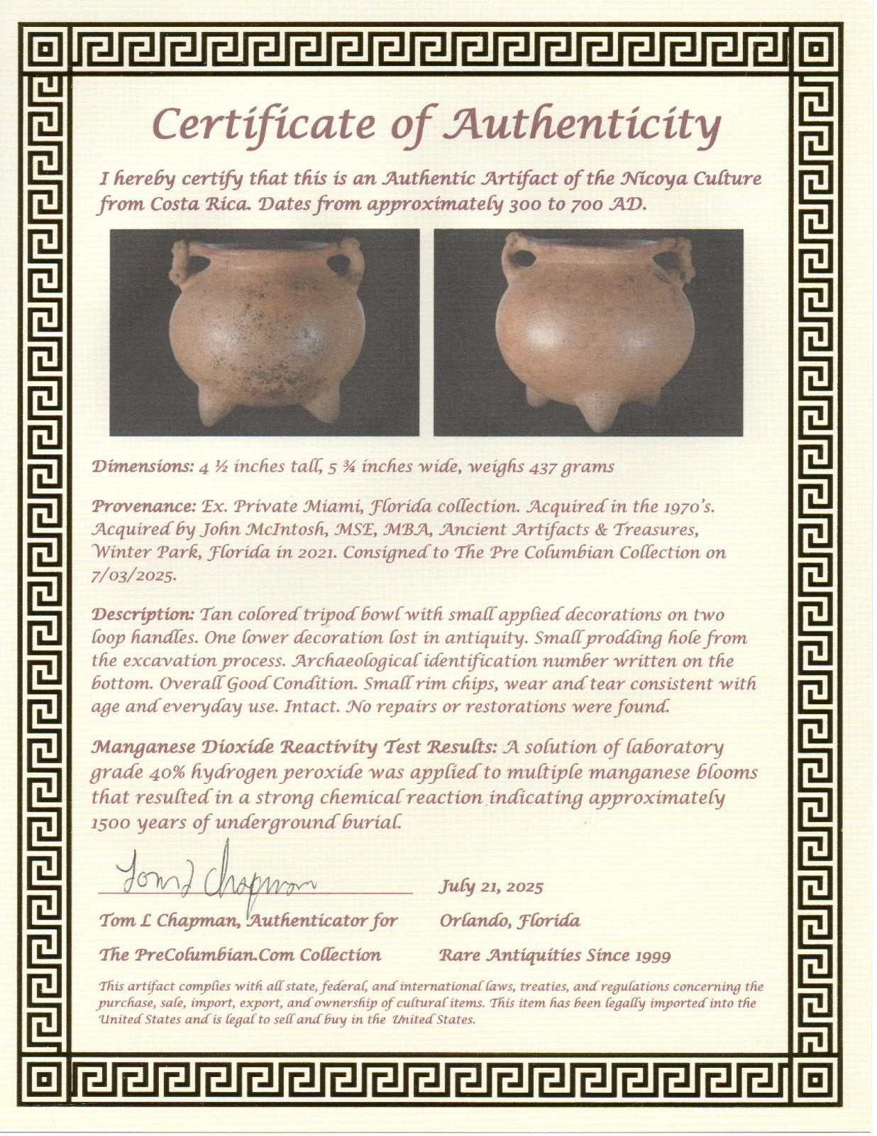 Dimensions: 4 ½ inches tall, 5 ¾ inches wide, weighs 437 gramsProvenance: Ex. Private Miami, Florida collection. Acquired in the 1970’s. Acquired by John McIntosh, MSE, MBA, Ancient Artifacts & Treasures, Winter Park, Florida in 2021. Consigned to The Pre Columbian Collection on 7/03/2025.Description: Tan colored tripod bowl with small applied decorations on two loop handles. One lower decoration lost in antiquity. Small prodding hole from the excavation process. Archaeological identification number written on the bottom. Overall Good Condition. Small rim chips, wear and tear consistent with age and everyday use. Intact. No repairs or restorations were found. Manganese Dioxide Reactivity Test Results: A solution of laboratory grade 40% hydrogen peroxide was applied to multiple manganese blooms that resulted in a strong chemical reaction indicating approximately 1500 years of underground burial.