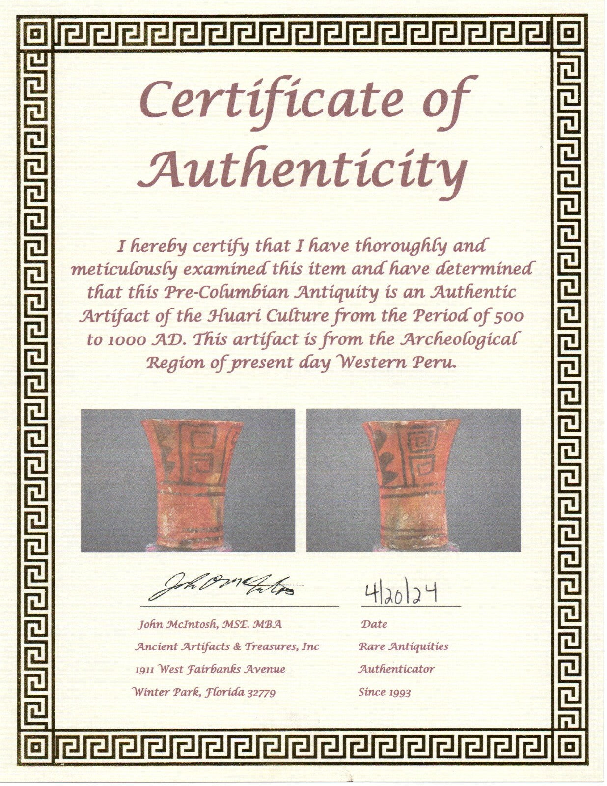 Authentic Pre Columbian Huari Wari Beaker Pottery 500 - 1000 AD Artifact COA T02