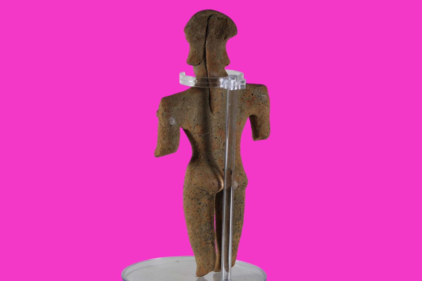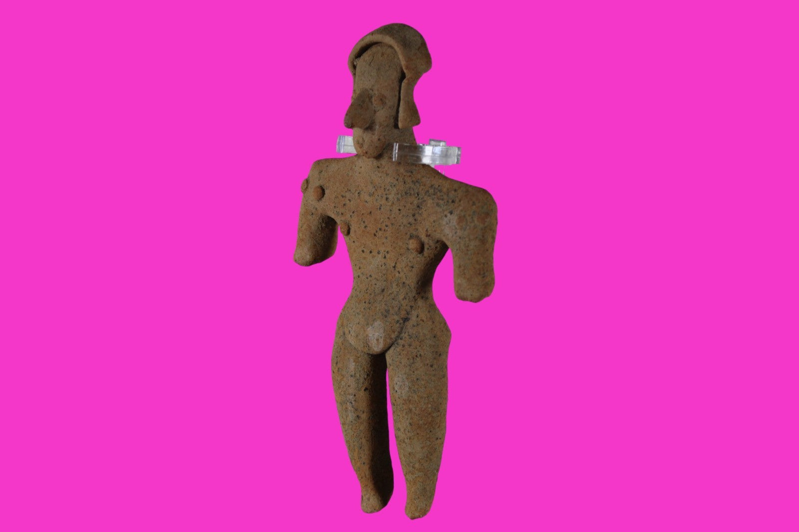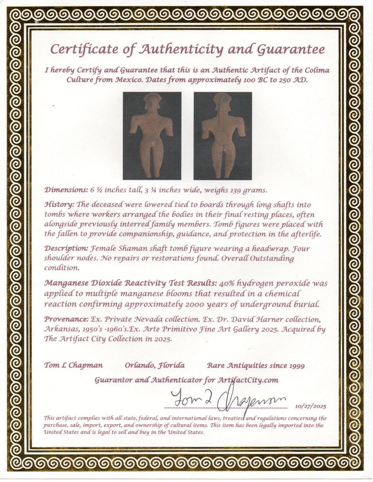 Dimensions: 6 ½ inches tall, 3 ¼ inches wide, weighs 139 grams. History: The deceased were lowered tied to boards through long shafts into tombs where workers arranged the bodies in their final resting places, often alongside previously interred family members. Tomb figures were placed with the fallen to provide companionship, guidance, and protection in the afterlife. Description: Female Shaman shaft tomb figure wearing a headwrap. Four shoulder nodes. No repairs or restorations found. Overall Outstanding condition. Manganese Dioxide Reactivity Test Results: 40% hydrogen peroxide was applied to multiple manganese blooms that resulted in a chemical reaction confirming approximately 2000 years of underground burial. Provenance: Ex. Private Nevada collection. Ex. Dr. David Harner collection, Arkansas, 1950’s -1960’s.Ex. Arte Primitivo Fine Art Gallery 2025. Acquired by The Artifact City Collection in 2025.