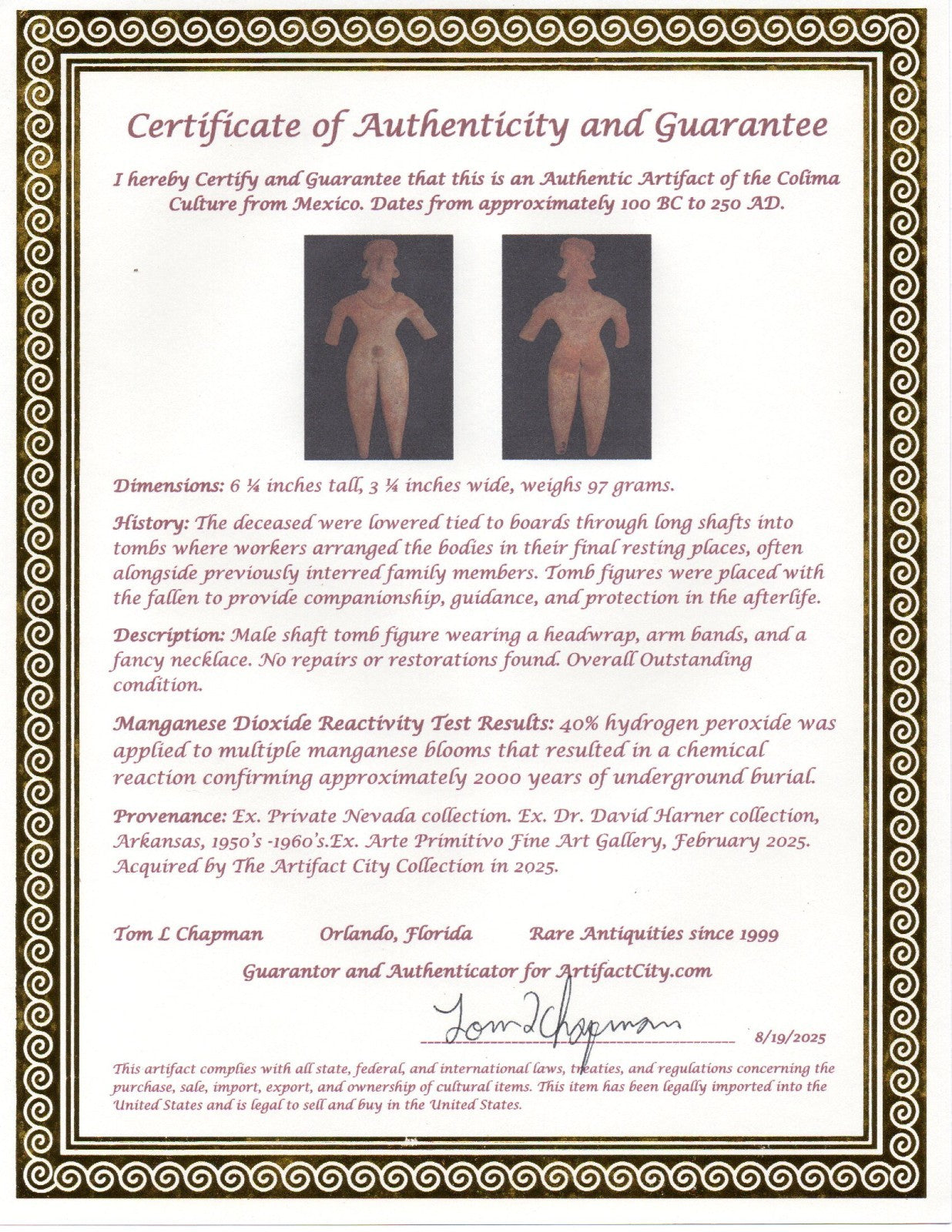 Dimensions: 6 ¼ inches tall, 3 ¼ inches wide, weighs 97 grams. History: The deceased were lowered tied to boards through long shafts into tombs where workers arranged the bodies in their final resting places, often alongside previously interred family members. Tomb figures were placed with the fallen to provide companionship, guidance, and protection in the afterlife. Description: Male shaft tomb figure wearing a headwrap, arm bands, and a fancy necklace. No repairs or restorations found. Overall Outstanding condition. Manganese Dioxide Reactivity Test Results: 40% hydrogen peroxide was applied to multiple manganese blooms that resulted in a chemical reaction confirming approximately 2000 years of underground burial. Provenance: Ex. Private Nevada collection. Ex. Dr. David Harner collection, Arkansas, 1950’s -1960’s.Ex. Arte Primitivo Fine Art Gallery, February 2025. Acquired by The Artifact City Collection in 2025.