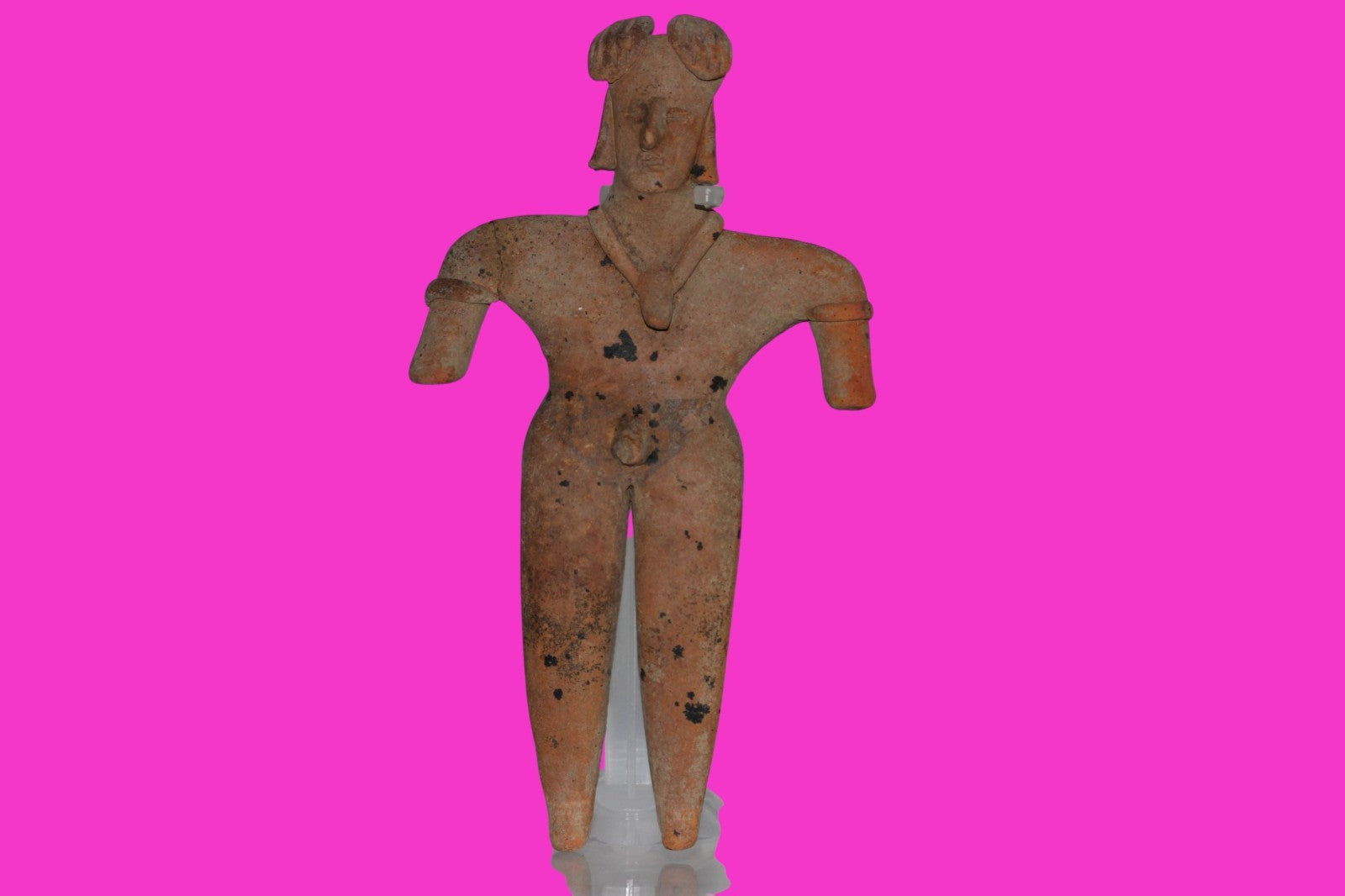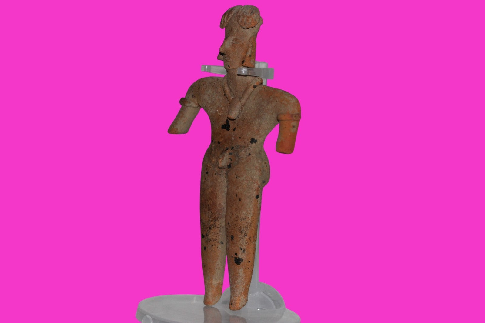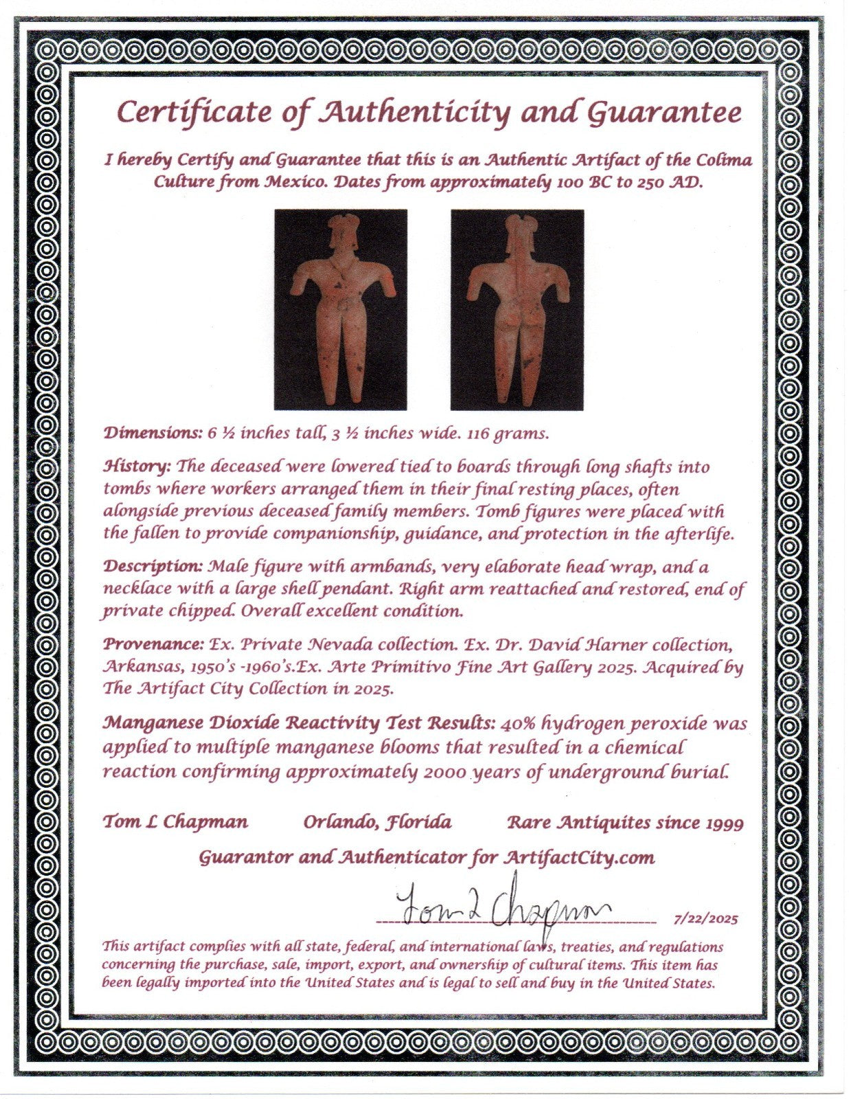 Dimensions: 6 ½ inches tall, 3 ½ inches wide. 116 grams. History: The deceased were lowered tied to boards through long shafts into tombs where workers arranged them in their final resting places, often alongside previous deceased family members. Tomb figures were placed with the fallen to provide companionship, guidance, and protection in the afterlife. Description: Male figure with armbands, very elaborate head wrap, and a necklace with a large shell pendant. Right arm reattached and restored, end of private chipped. Overall excellent condition. Provenance: Ex. Private Nevada collection. Ex. Dr. David Harner collection, Arkansas, 1950’s -1960’s.Ex. Arte Primitivo Fine Art Gallery 2025. Acquired by The Artifact City Collection in 2025. Manganese Dioxide Reactivity Test Results: 40% hydrogen peroxide was applied to multiple manganese blooms that resulted in a chemical reaction confirming approximately 2000 years of underground burial.