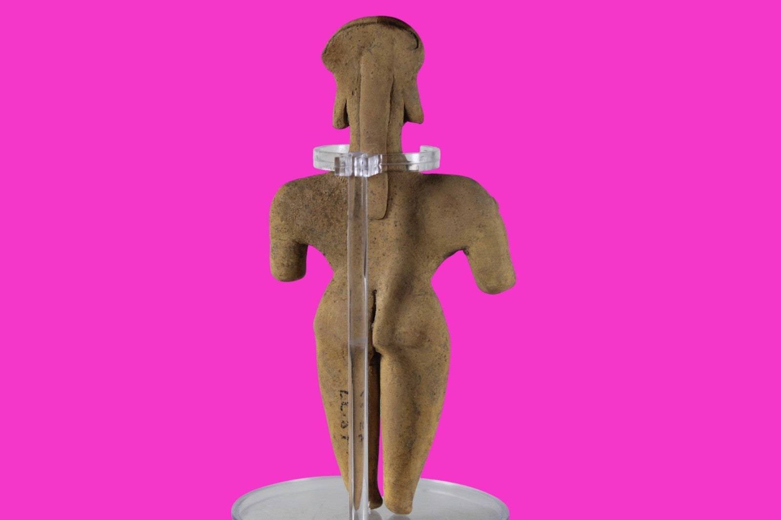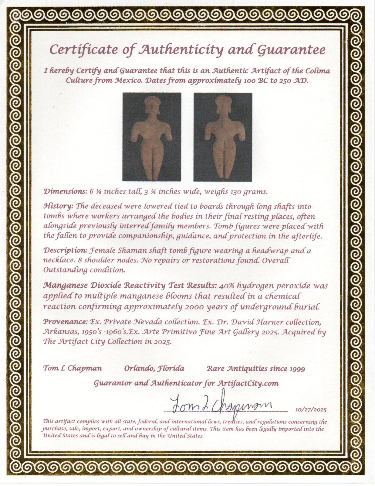 Dimensions: 6 ¼ inches tall, 3 ¼ inches wide, weighs 130 grams. History: The deceased were lowered tied to boards through long shafts into tombs where workers arranged the bodies in their final resting places, often alongside previously interred family members. Tomb figures were placed with the fallen to provide companionship, guidance, and protection in the afterlife. Description: Female Shaman shaft tomb figure wearing a headwrap and a necklace. 8 shoulder nodes. No repairs or restorations found. Overall Outstanding condition. Manganese Dioxide Reactivity Test Results: 40% hydrogen peroxide was applied to multiple manganese blooms that resulted in a chemical reaction confirming approximately 2000 years of underground burial. Provenance: Ex. Private Nevada collection. Ex. Dr. David Harner collection, Arkansas, 1950’s -1960’s.Ex. Arte Primitivo Fine Art Gallery 2025. Acquired by The Artifact City Collection in 2025.