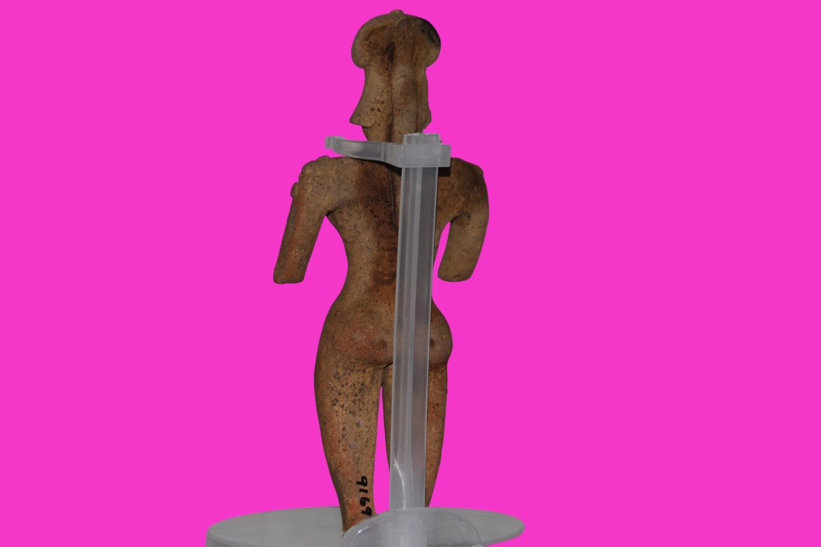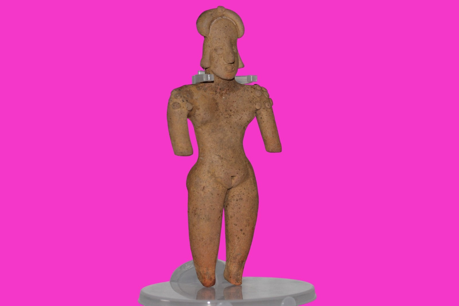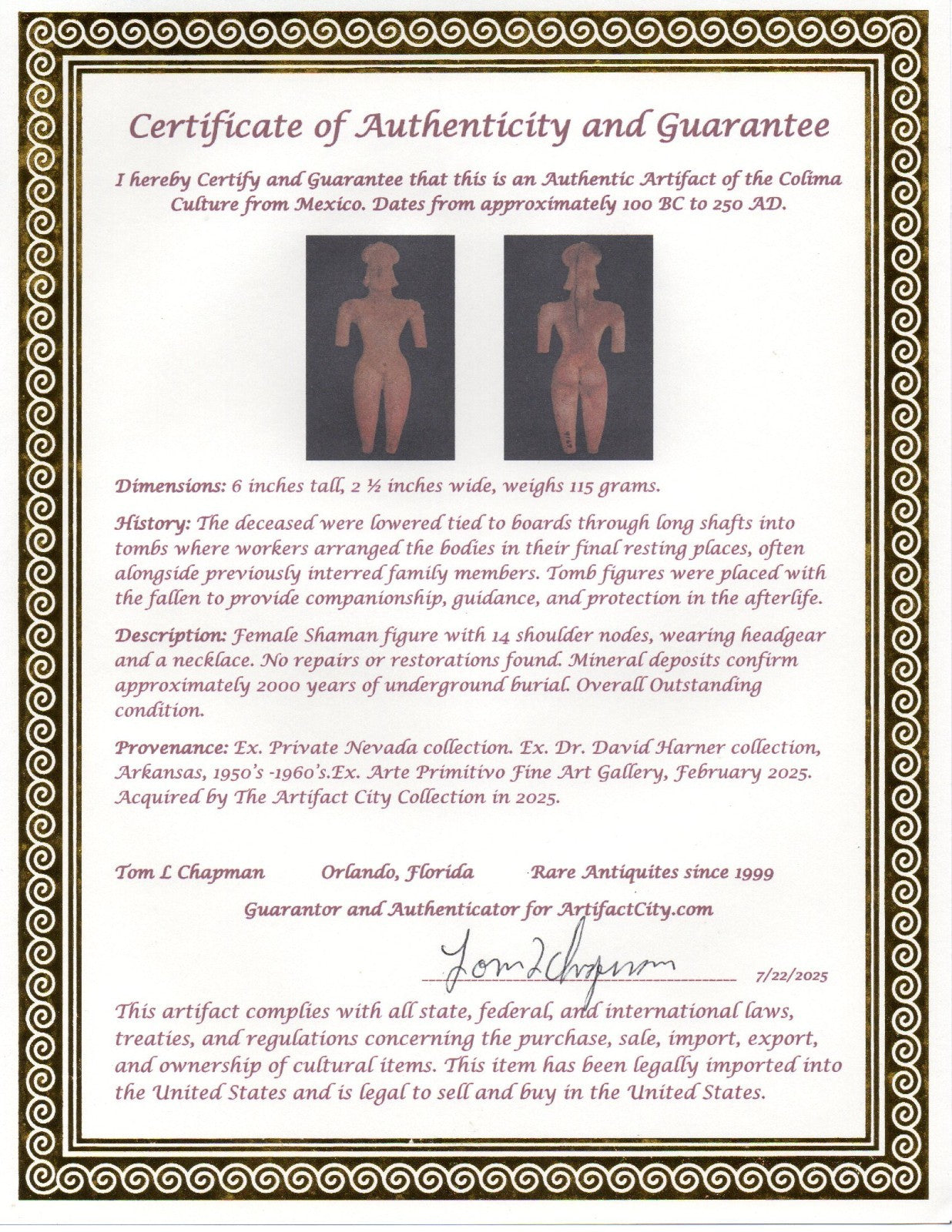 Dimensions: 6 inches tall, 2 ½ inches wide, weighs 115 grams. History: The deceased were lowered tied to boards through long shafts into tombs where workers arranged the bodies in their final resting places, often alongside previously interred family members. Tomb figures were placed with the fallen to provide companionship, guidance, and protection in the afterlife. Description: Female Shaman figure with 14 shoulder nodes, wearing headgear and a necklace. No repairs or restorations found. Mineral deposits confirm approximately 2000 years of underground burial. Overall Outstanding condition. Provenance: Ex. Private Nevada collection. Ex. Dr. David Harner collection, Arkansas, 1950’s -1960’s.Ex. Arte Primitivo Fine Art Gallery, February 2025. Acquired by The Artifact City Collection in 2025.