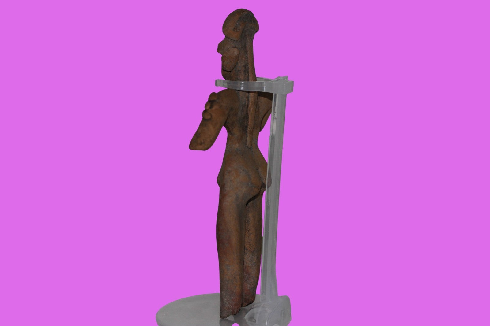 Dimensions: 6 ½ inches tall, 3 ¾ inches wide, weighs 149 grams. History: The deceased were lowered tied to boards through long shafts into tombs where workers arranged the bodies in their final resting places, often alongside previously interred family members. Tomb figures were placed with the fallen to provide companionship, guidance, and protection in the afterlife. Description: Female Shaman figure with 18 shoulder nodes, wearing headgear and a necklace. Professionally restored from three original pieces. Mineral deposits confirm approximately 2000 years of underground burial. Overall Outstanding condition. Provenance: Ex. Private Nevada collection. Ex. Dr. David Harner collection, Arkansas, 1950’s -1960’s.Ex. Arte Primitivo Fine Art Gallery, February 2025. Acquired by The Artifact City Collection in 2025.