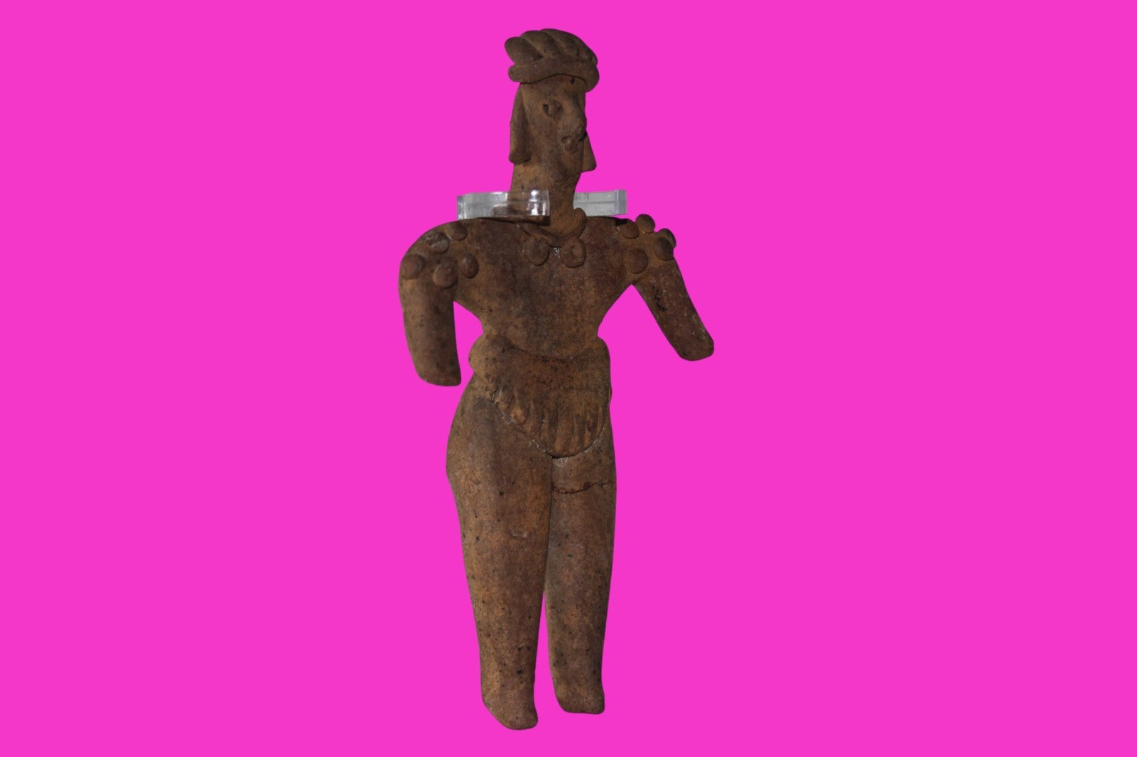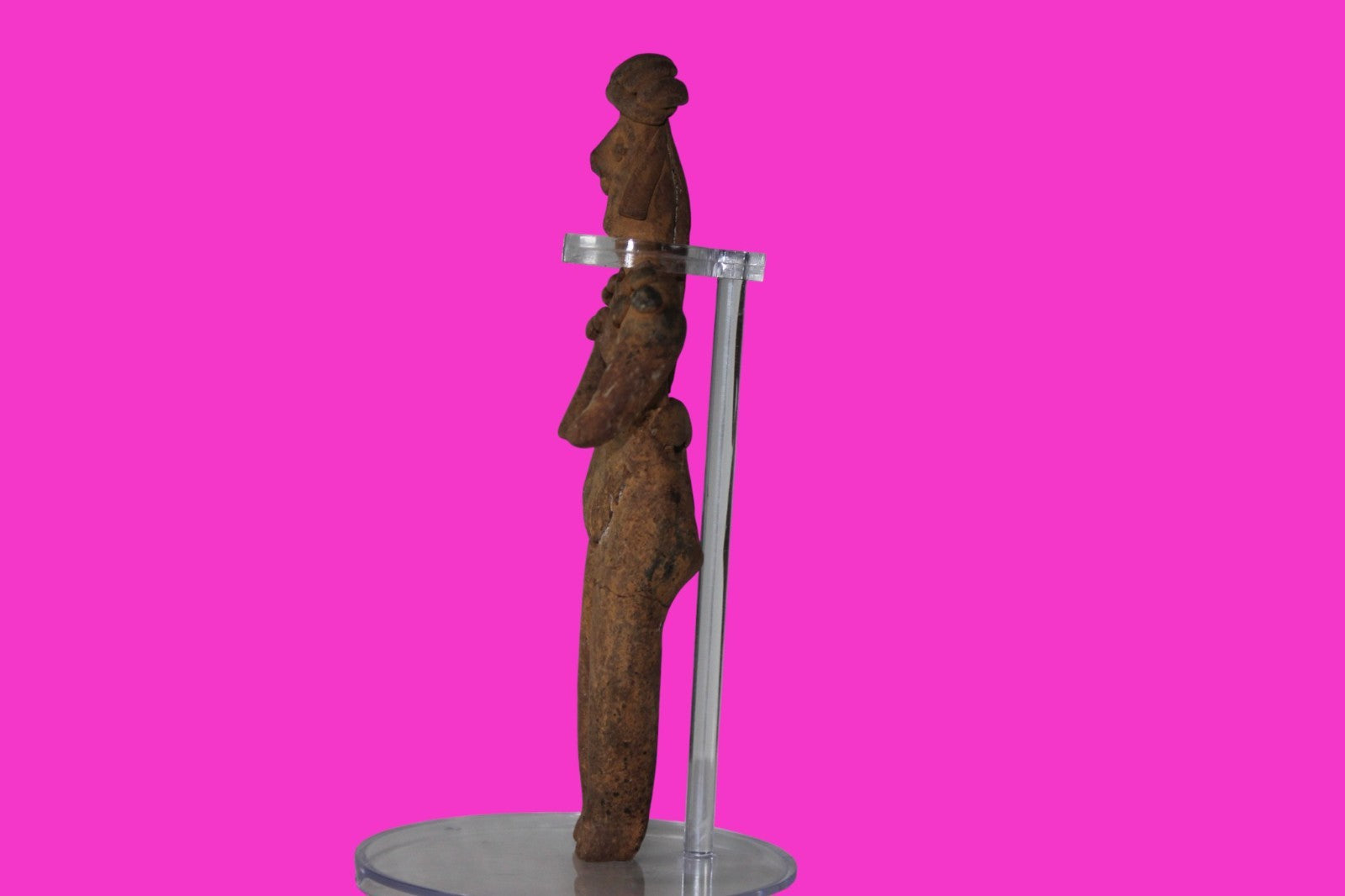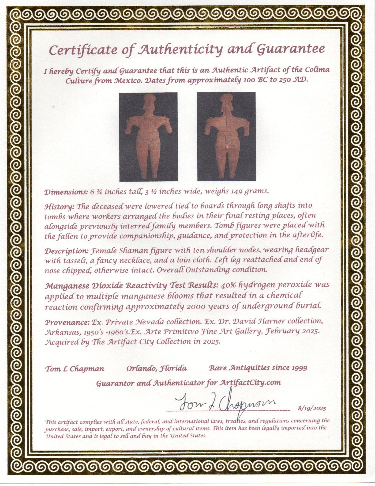 Dimensions: 6 ¼ inches tall, 3 ½ inches wide, weighs 149 grams. History: The deceased were lowered tied to boards through long shafts into tombs where workers arranged the bodies in their final resting places, often alongside previously interred family members. Tomb figures were placed with the fallen to provide companionship, guidance, and protection in the afterlife. Description: Female Shaman figure with ten shoulder nodes, wearing headgear with tassels, a fancy necklace, and a loin cloth. Left leg reattached and end of nose chipped, otherwise intact. Overall Outstanding condition. Manganese Dioxide Reactivity Test Results: 40% hydrogen peroxide was applied to multiple manganese blooms that resulted in a chemical reaction confirming approximately 2000 years of underground burial.Provenance: Ex. Private Nevada collection. Ex. Dr. David Harner collection, Arkansas, 1950’s -1960’s.Ex. Arte Primitivo Fine Art Gallery, February 2025. Acquired by The Artifact City Collection in 2025.