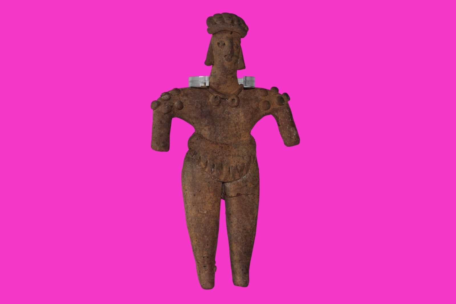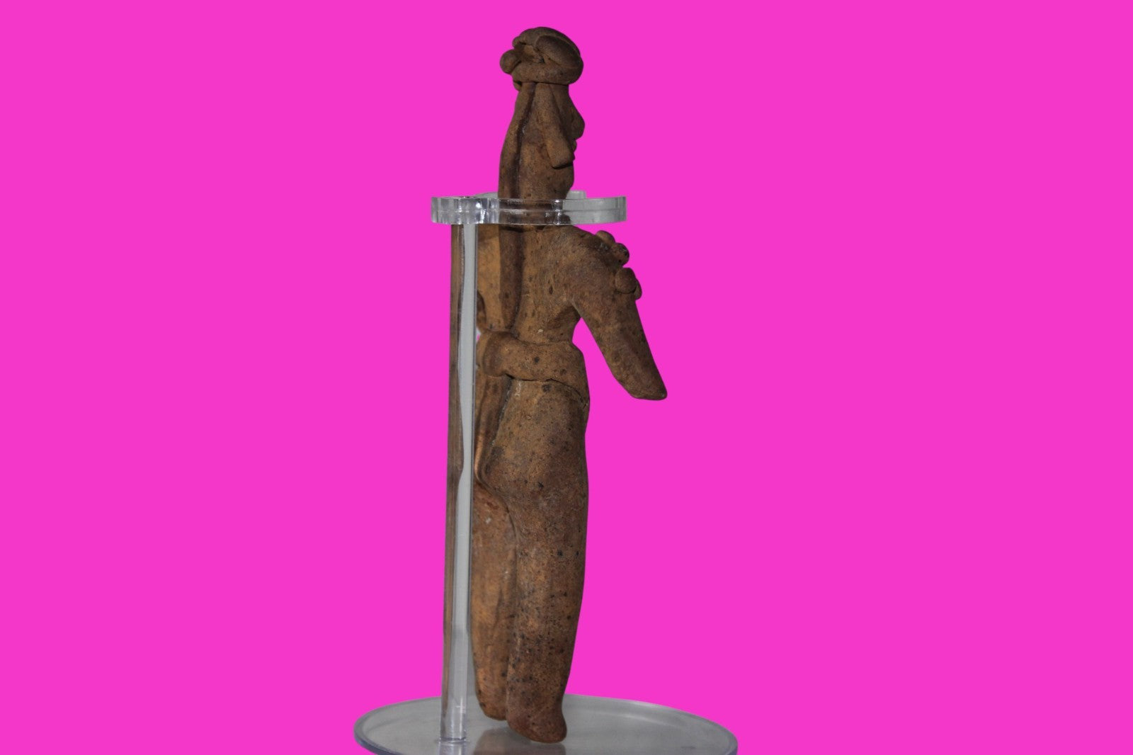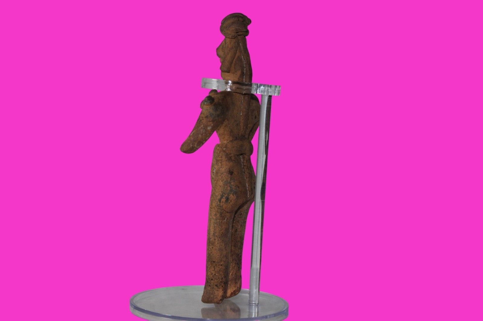Dimensions: 6 ¼ inches tall, 3 ½ inches wide, weighs 149 grams. History: The deceased were lowered tied to boards through long shafts into tombs where workers arranged the bodies in their final resting places, often alongside previously interred family members. Tomb figures were placed with the fallen to provide companionship, guidance, and protection in the afterlife. Description: Female Shaman figure with ten shoulder nodes, wearing headgear with tassels, a fancy necklace, and a loin cloth. Left leg reattached and end of nose chipped, otherwise intact. Overall Outstanding condition. Manganese Dioxide Reactivity Test Results: 40% hydrogen peroxide was applied to multiple manganese blooms that resulted in a chemical reaction confirming approximately 2000 years of underground burial.Provenance: Ex. Private Nevada collection. Ex. Dr. David Harner collection, Arkansas, 1950’s -1960’s.Ex. Arte Primitivo Fine Art Gallery, February 2025. Acquired by The Artifact City Collection in 2025.