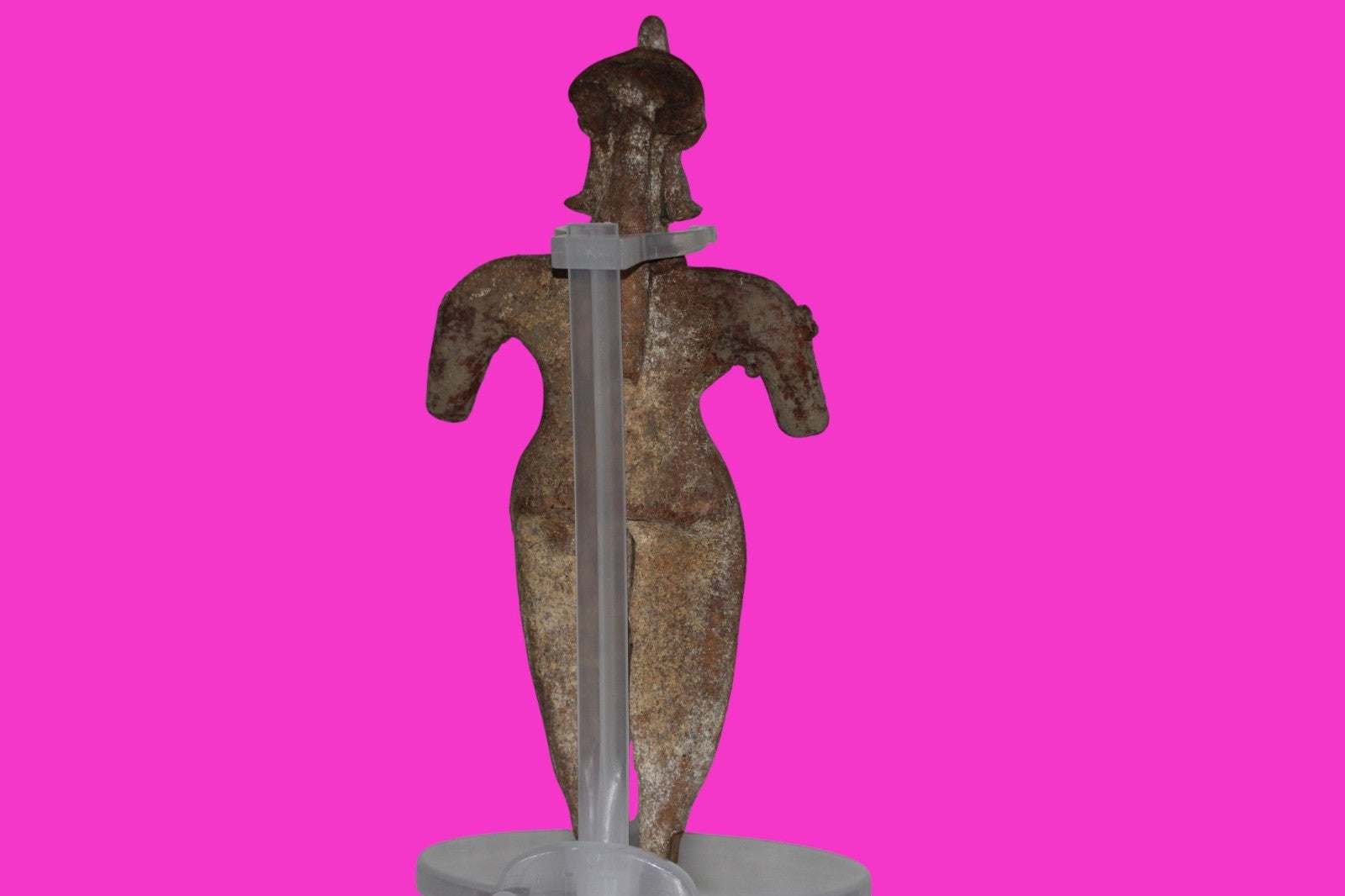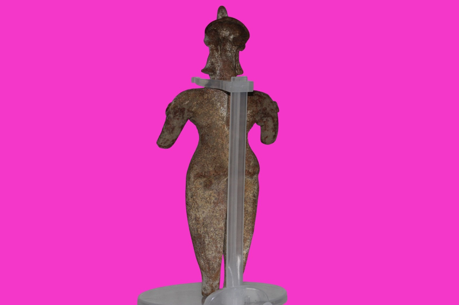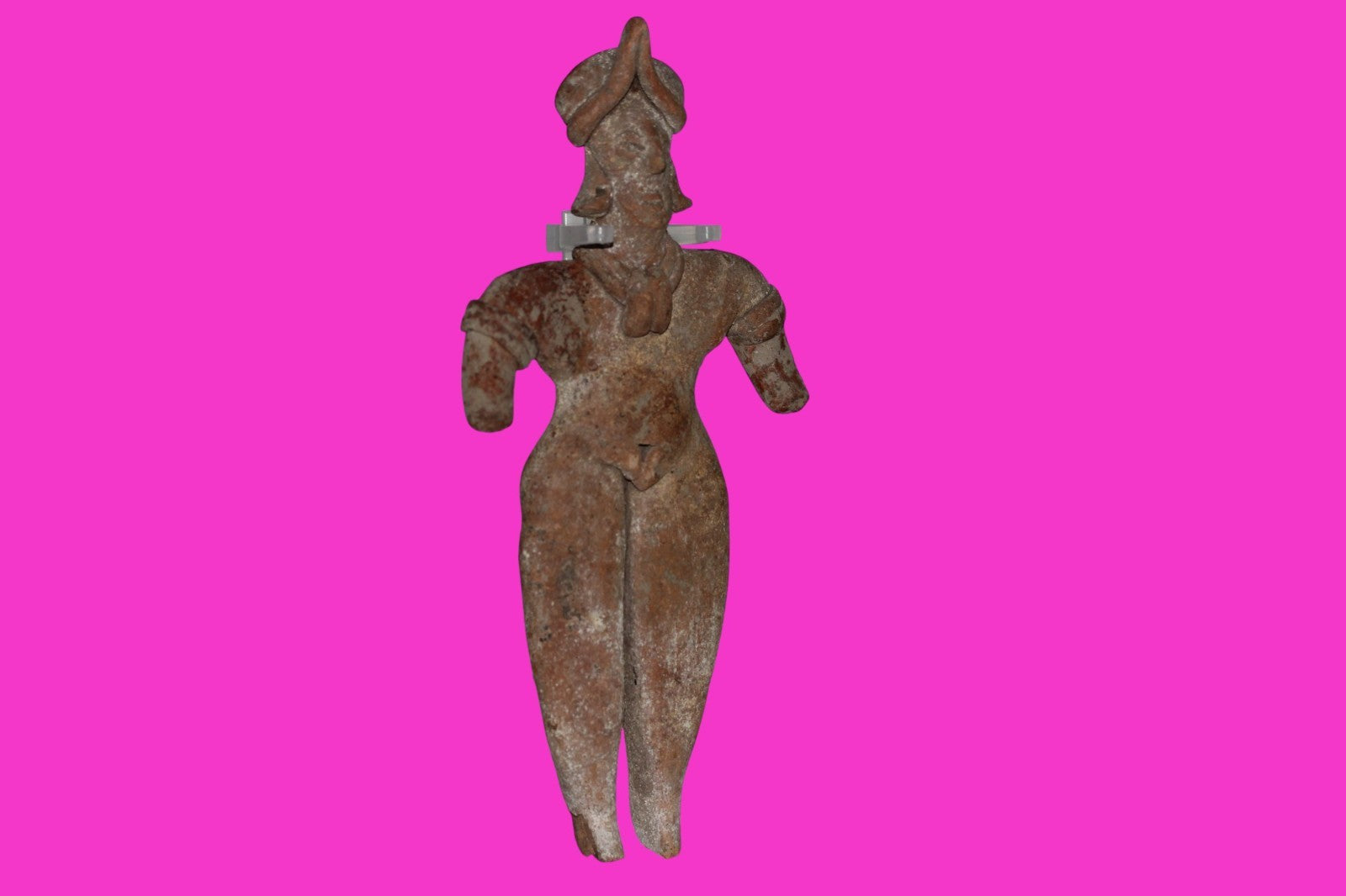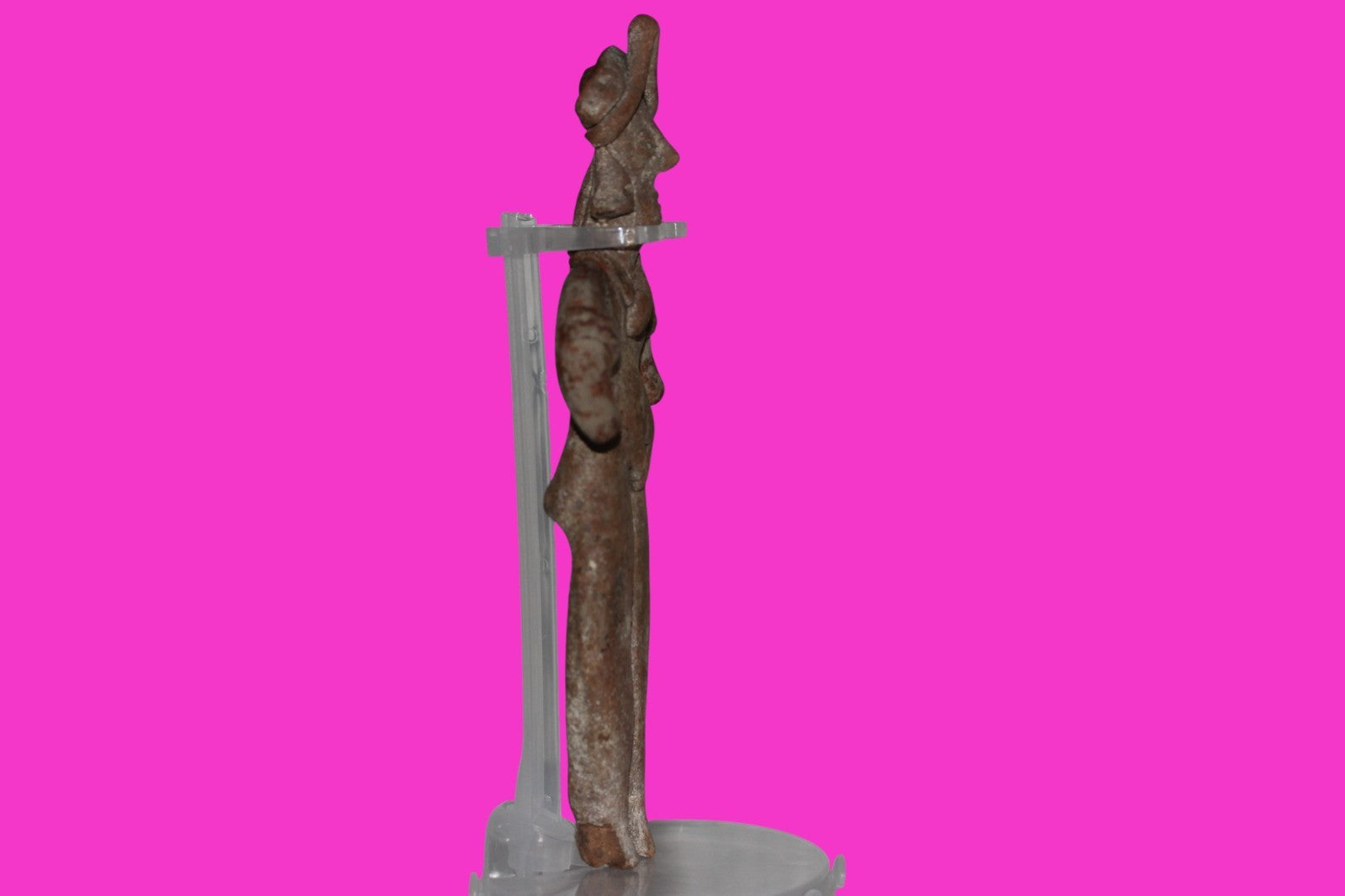 Dimensions: 7 inches tall, 3 ¼ inches wide, weighs 143 grams. History: The deceased were lowered tied to boards through long shafts into tombs where workers arranged them in their final resting places, often alongside previous deceased family members. Tomb figures were placed with the fallen to provide companionship, guidance, and protection in the afterlife. Description: Female figure with arm bands, wearing headgear, large ear ornaments, and a double strand necklace. No repairs or restorations found. Extensive mineral deposits confirm approximately 2000 years of underground burial. Overall Outstanding condition. Provenance: Ex. Private Nevada collection. Ex. Dr. David Harner collection, Arkansas, 1950’s -1960’s.Ex. Arte Primitivo Fine Art Gallery 2025. Acquired by The Artifact City Collection in 2025.