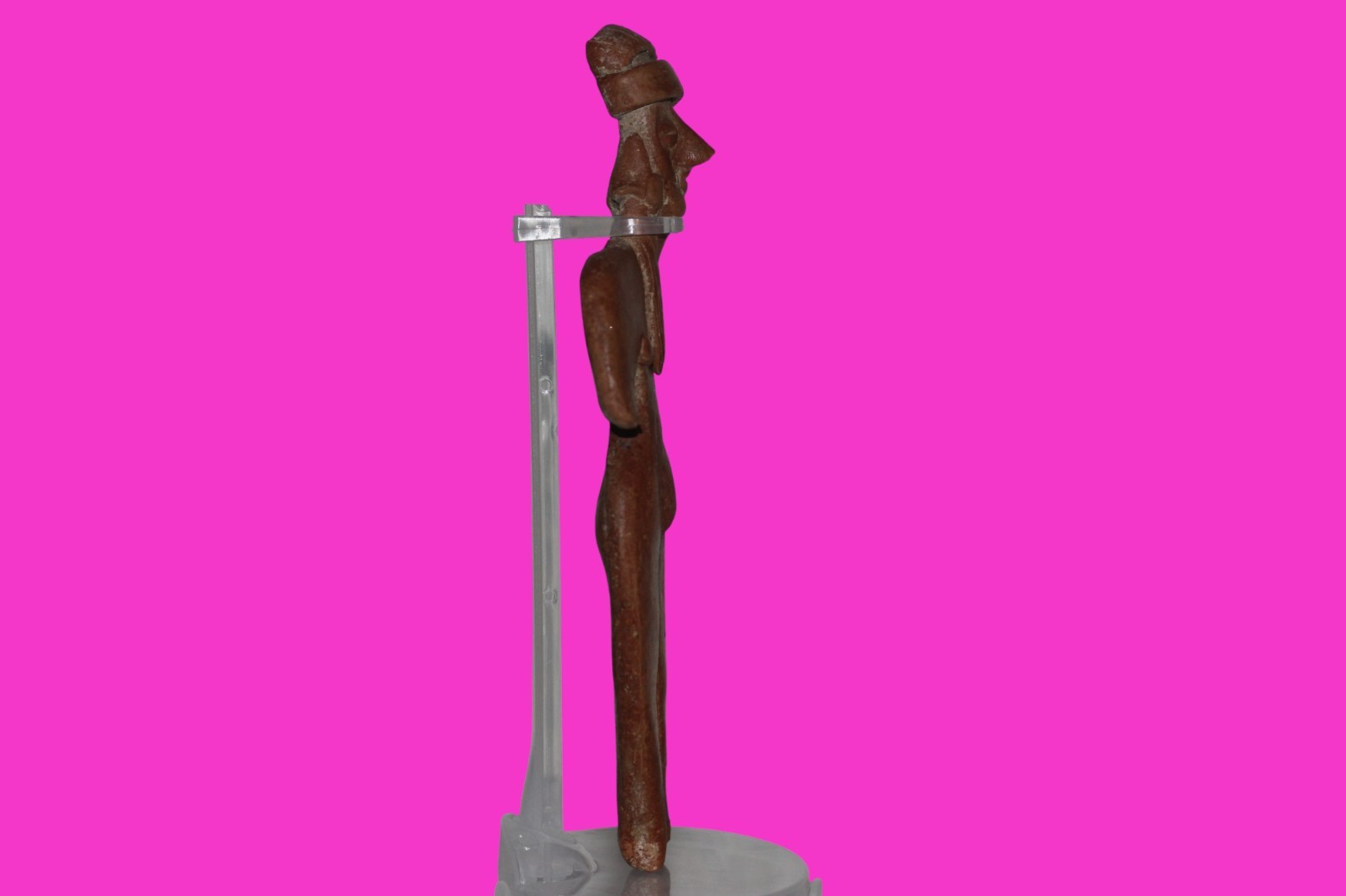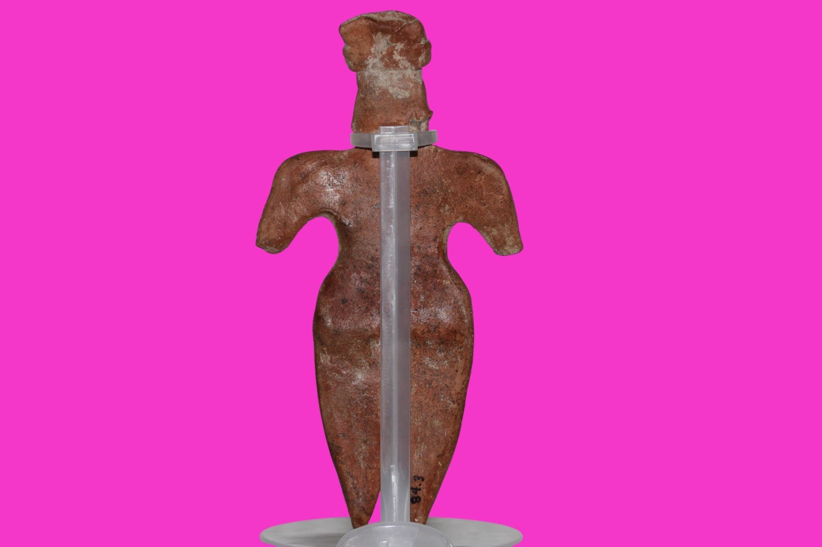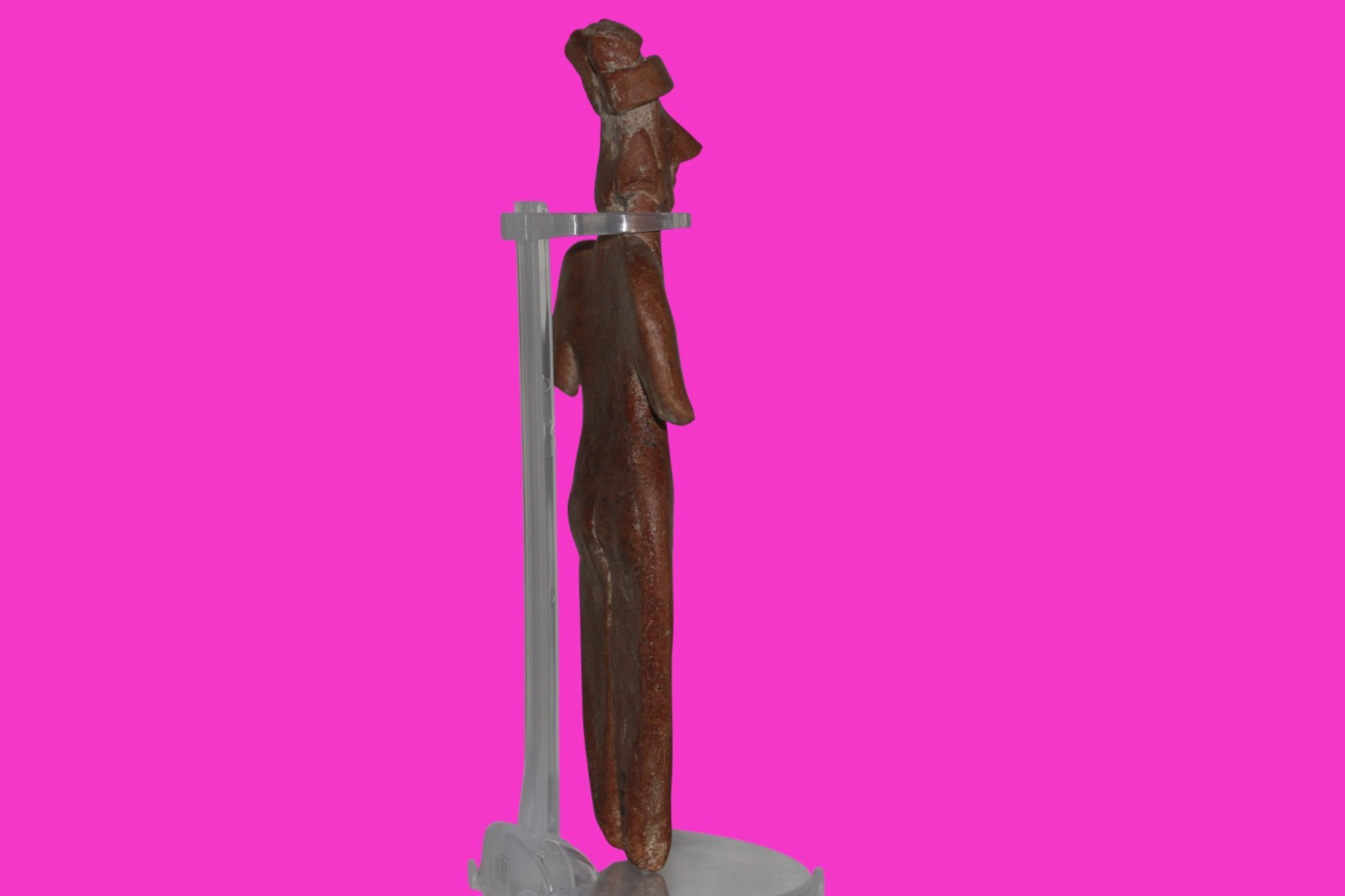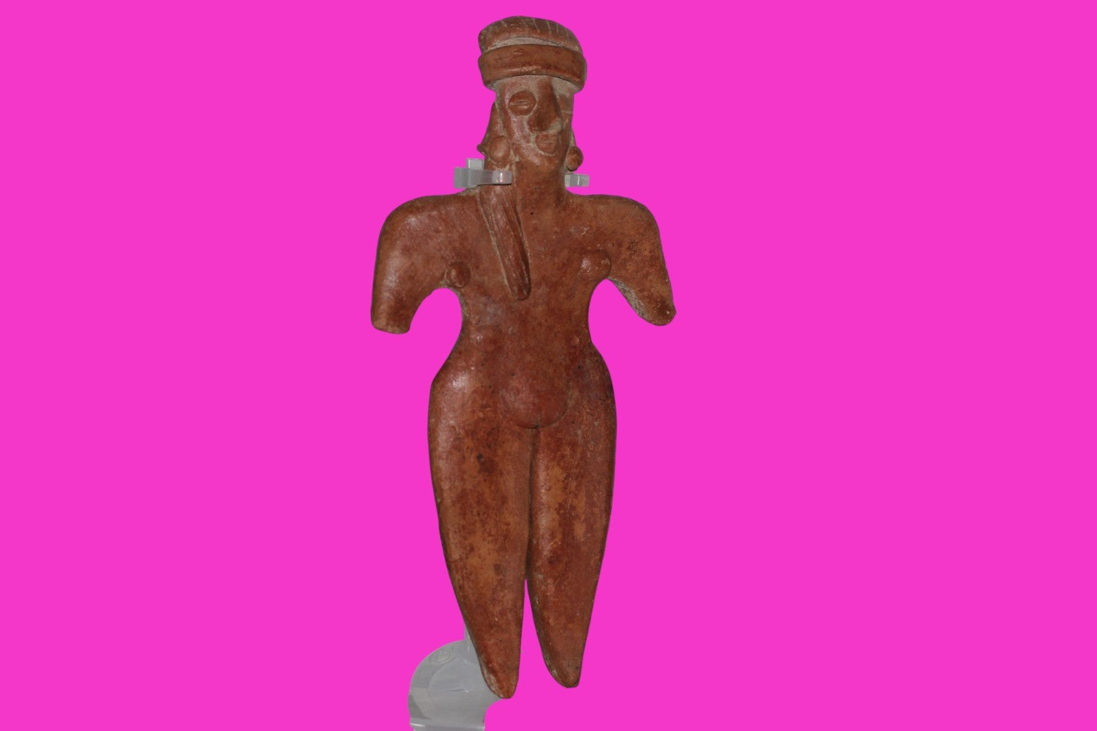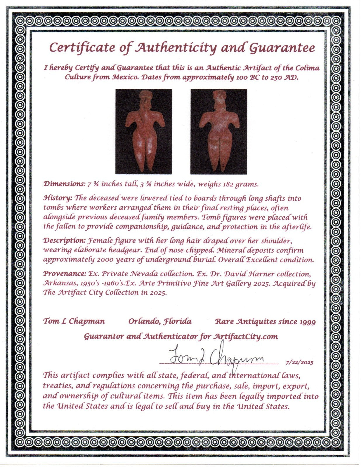 Dimensions: 7 ¾ inches tall, 3 ¾ inches wide, weighs 182 grams. History: The deceased were lowered tied to boards through long shafts into tombs where workers arranged them in their final resting places, often alongside previous deceased family members. Tomb figures were placed with the fallen to provide companionship, guidance, and protection in the afterlife. Description: Female figure with her long hair draped over her shoulder, wearing elaborate headgear. End of nose chipped. Mineral deposits confirm approximately 2000 years of underground burial. Overall Excellent condition. Provenance: Ex. Private Nevada collection. Ex. Dr. David Harner collection, Arkansas, 1950’s -1960’s.Ex. Arte Primitivo Fine Art Gallery 2025. Acquired by The Artifact City Collection in 2025.