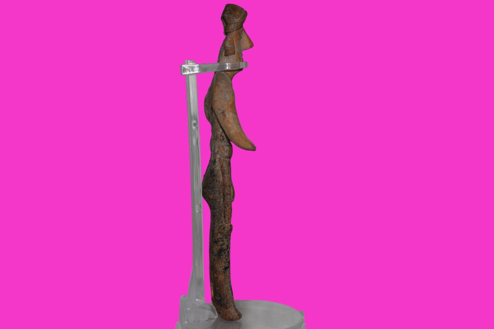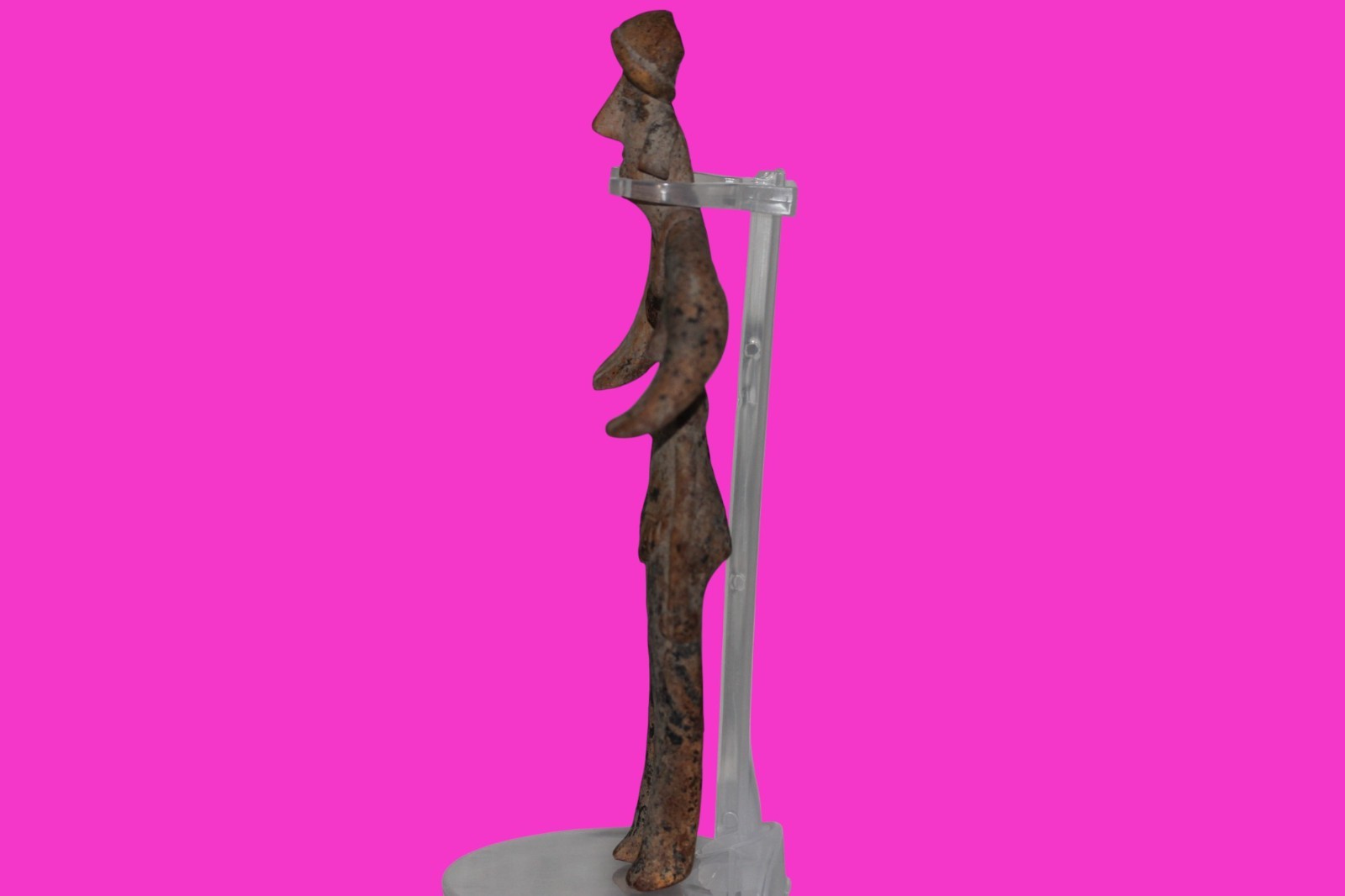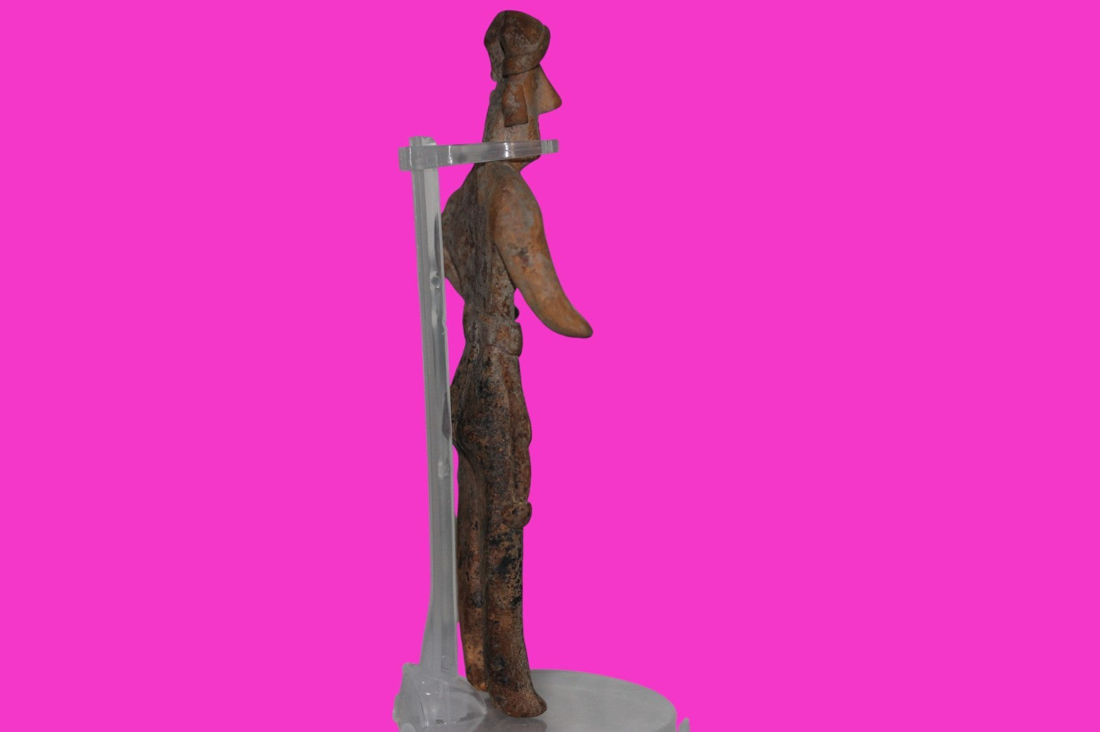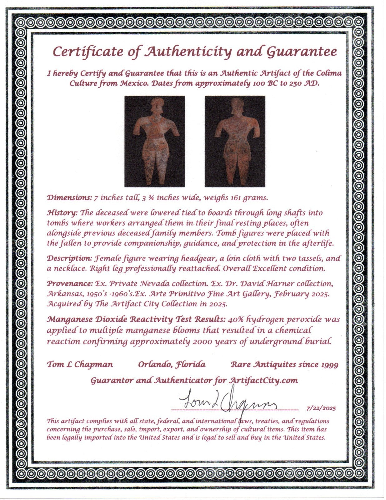 Dimensions: 7 inches tall, 3 ¾ inches wide, weighs 161 grams. History: The deceased were lowered tied to boards through long shafts into tombs where workers arranged them in their final resting places, often alongside previous deceased family members. Tomb figures were placed with the fallen to provide companionship, guidance, and protection in the afterlife. Description: Female figure wearing headgear, a loin cloth with two tassels, and a necklace. Right leg professionally reattached. Overall Excellent condition. Provenance: Ex. Private Nevada collection. Ex. Dr. David Harner collection, Arkansas, 1950’s -1960’s.Ex. Arte Primitivo Fine Art Gallery, February 2025. Acquired by The Artifact City Collection in 2025. Manganese Dioxide Reactivity Test Results: 40% hydrogen peroxide was applied to multiple manganese blooms that resulted in a chemical reaction confirming approximately 2000 years of underground burial.