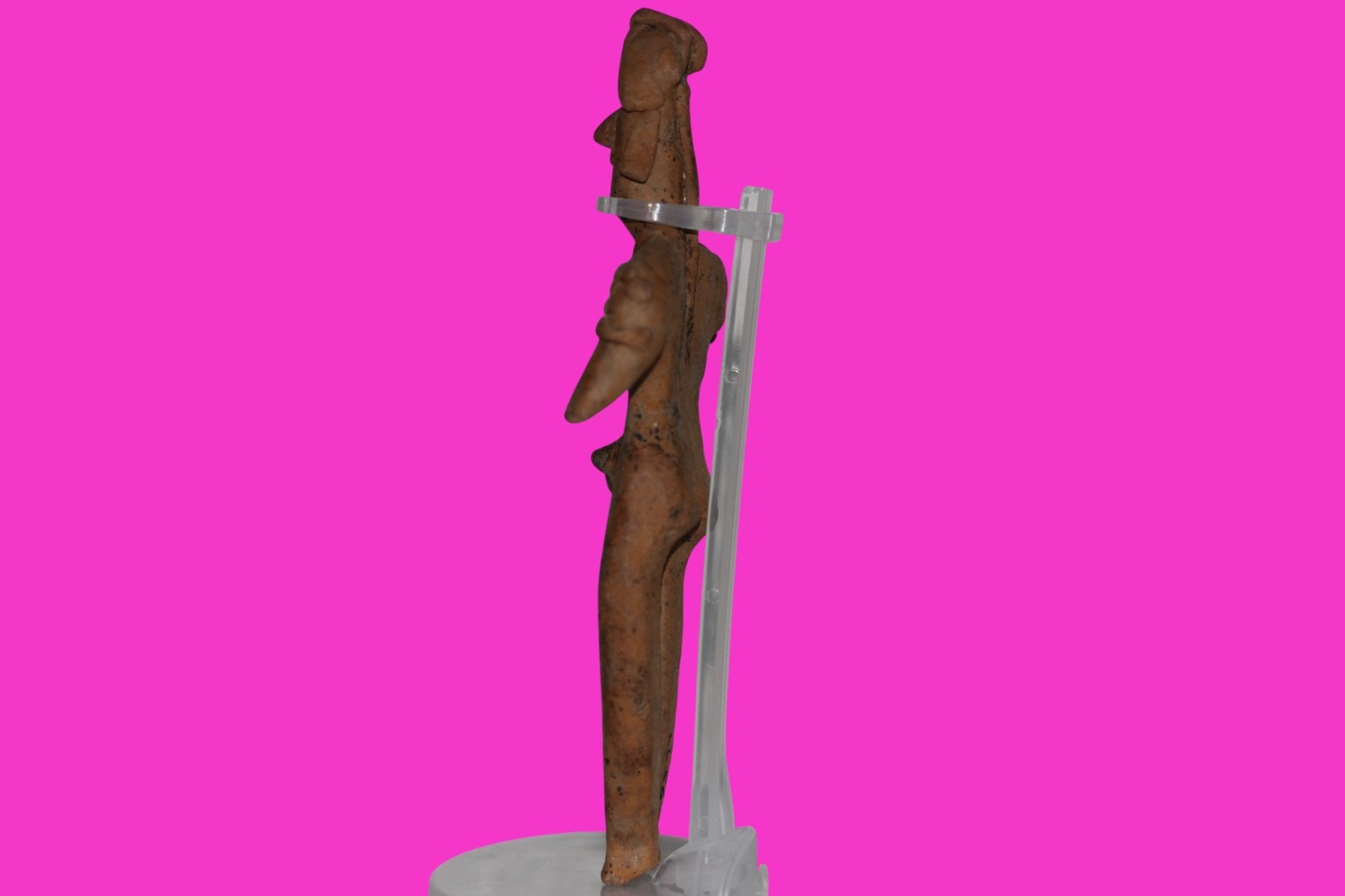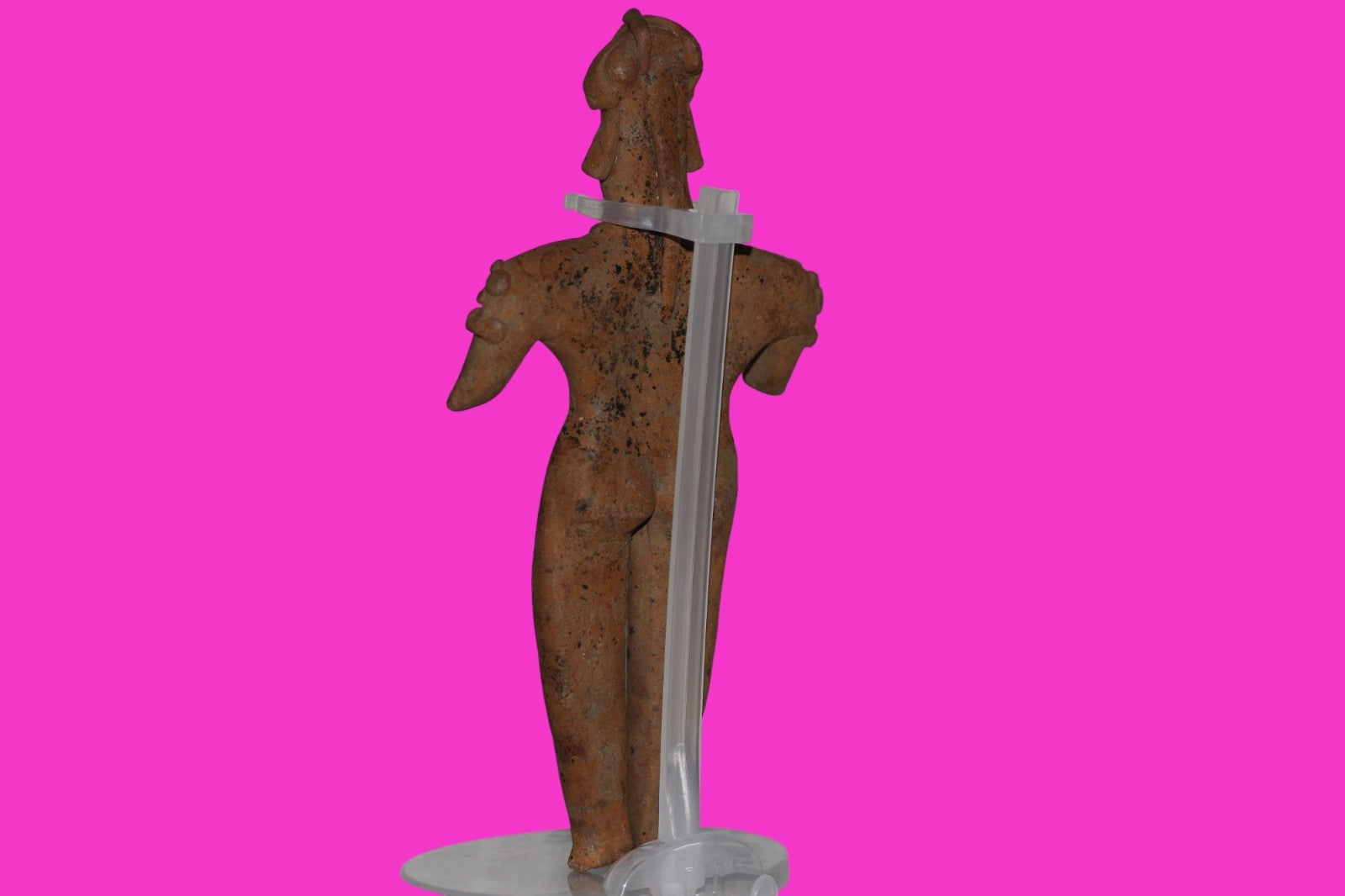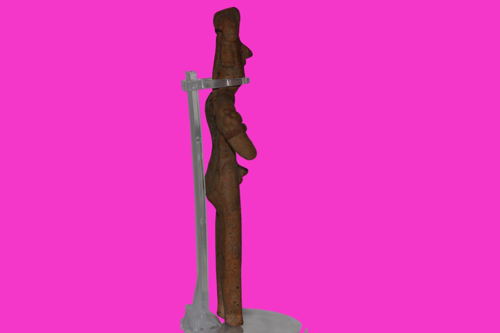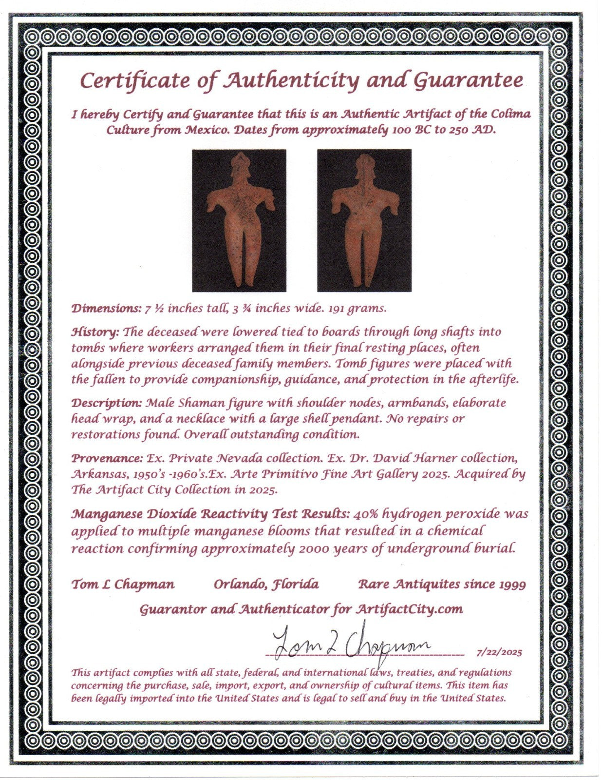 Dimensions: 7 ½ inches tall, 3 ¾ inches wide. 191 grams. History: The deceased were lowered tied to boards through long shafts into tombs where workers arranged them in their final resting places, often alongside previous deceased family members. Tomb figures were placed with the fallen to provide companionship, guidance, and protection in the afterlife. Description: Male Shaman figure with shoulder nodes, armbands, elaborate head wrap, and a necklace with a large shell pendant. No repairs or restorations found. Overall outstanding condition. Provenance: Ex. Private Nevada collection. Ex. Dr. David Harner collection, Arkansas, 1950’s -1960’s.Ex. Arte Primitivo Fine Art Gallery 2025. Acquired by The Artifact City Collection in 2025. Manganese Dioxide Reactivity Test Results: 40% hydrogen peroxide was applied to multiple manganese blooms that resulted in a chemical reaction confirming approximately 2000 years of underground burial.