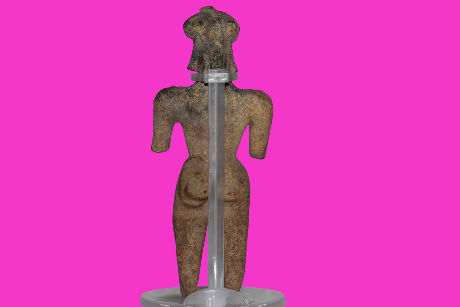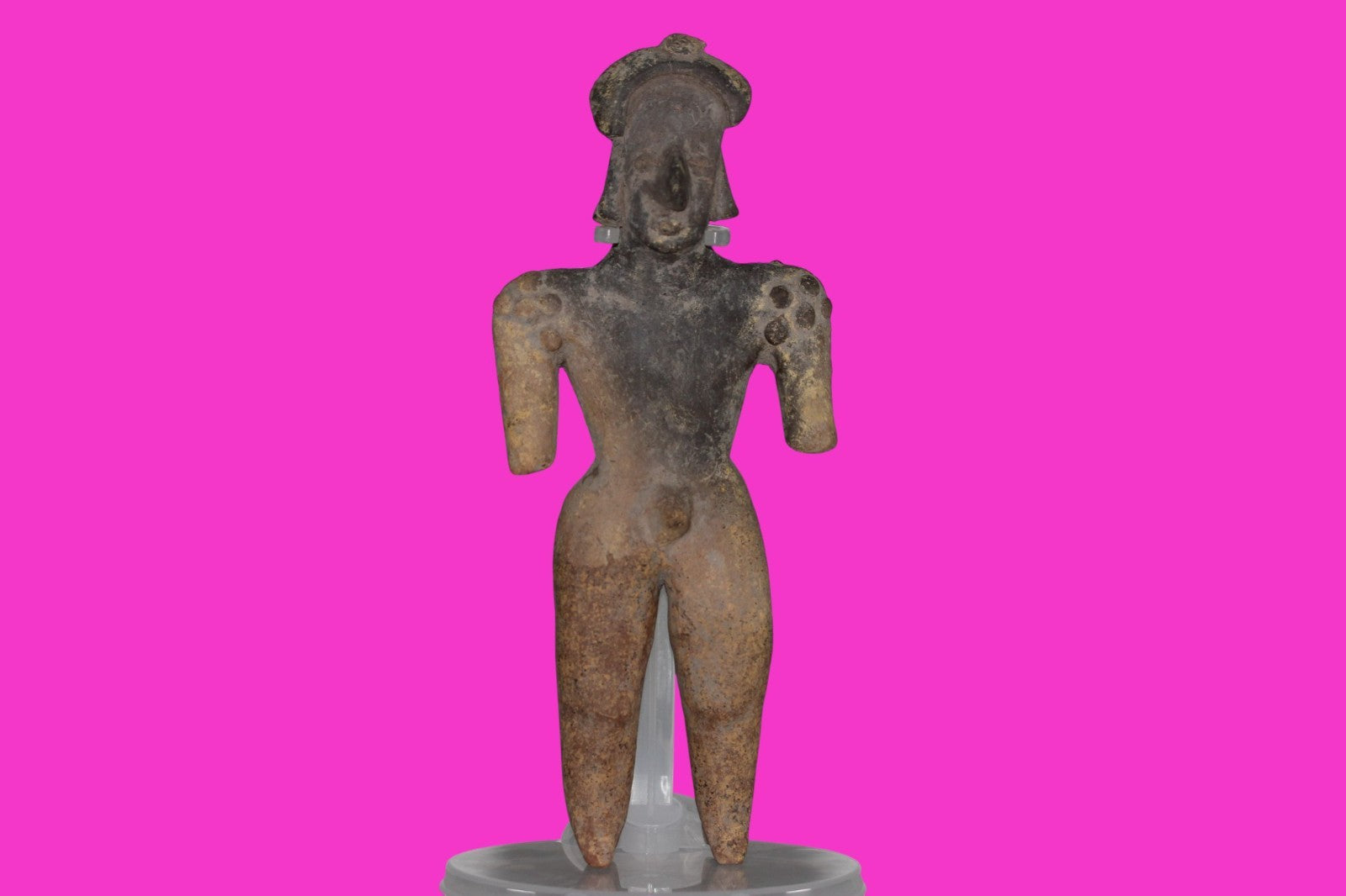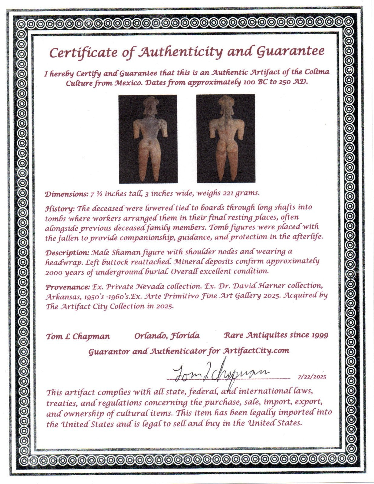 Dimensions: 7 ½ inches tall, 3 inches wide, weighs 221 grams. History: The deceased were lowered tied to boards through long shafts into tombs where workers arranged them in their final resting places, often alongside previous deceased family members. Tomb figures were placed with the fallen to provide companionship, guidance, and protection in the afterlife. Description: Male Shaman figure with shoulder nodes and wearing a headwrap. Left buttock reattached. Mineral deposits confirm approximately 2000 years of underground burial. Overall excellent condition. Provenance: Ex. Private Nevada collection. Ex. Dr. David Harner collection, Arkansas, 1950’s -1960’s.Ex. Arte Primitivo Fine Art Gallery 2025. Acquired by The Artifact City Collection in 2025.