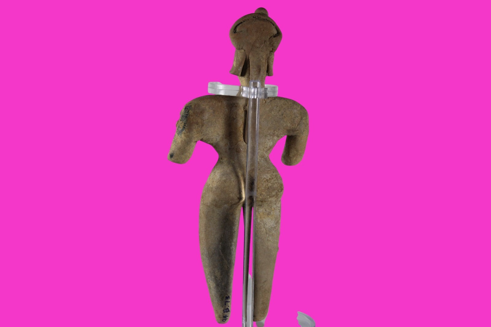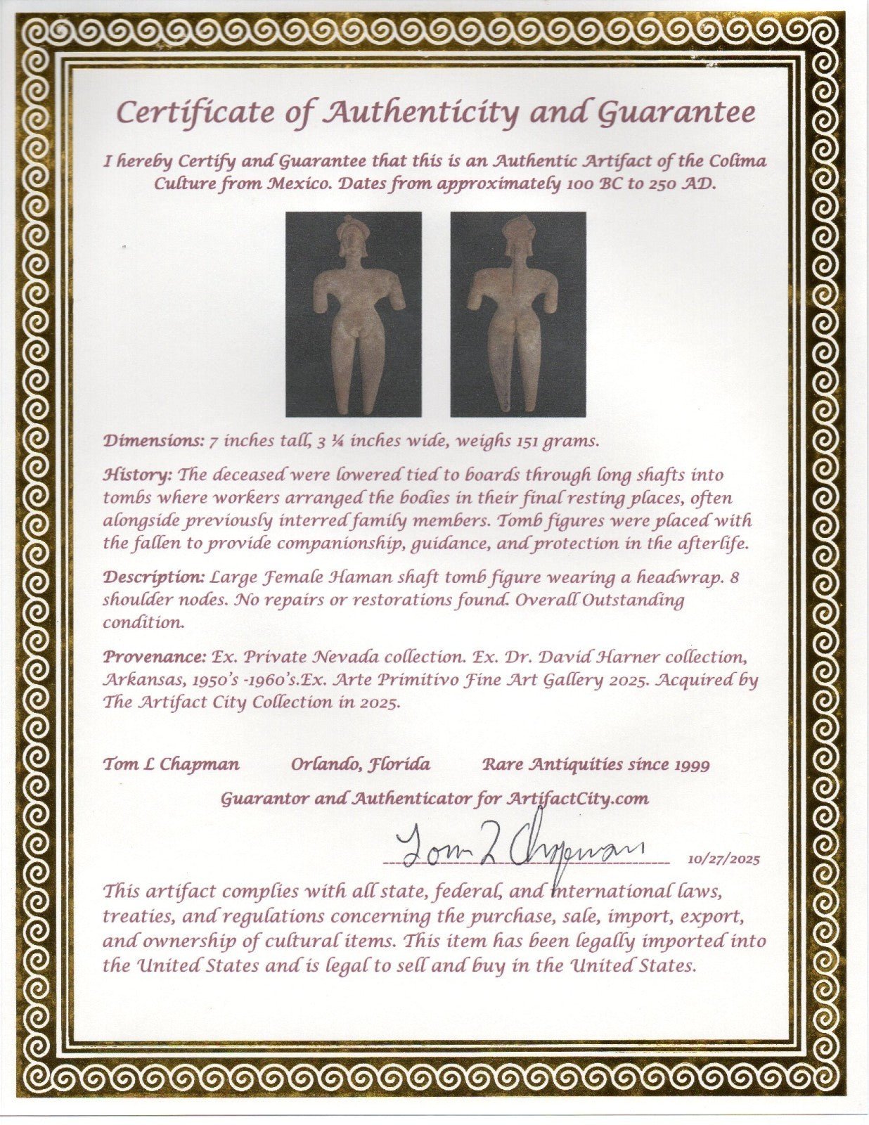 Dimensions: 7 inches tall, 3 ¼ inches wide, weighs 151 grams. History: The deceased were lowered tied to boards through long shafts into tombs where workers arranged the bodies in their final resting places, often alongside previously interred family members. Tomb figures were placed with the fallen to provide companionship, guidance, and protection in the afterlife. Description: Large Female Haman shaft tomb figure wearing a headwrap. 8 shoulder nodes. No repairs or restorations found. Overall Outstanding condition. Manganese Dioxide Reactivity Test Results: 40% hydrogen peroxide was applied to multiple manganese blooms that resulted in a chemical reaction confirming approximately 2000 years of underground burial. Provenance: Ex. Private Nevada collection. Ex. Dr. David Harner collection, Arkansas, 1950’s -1960’s.Ex. Arte Primitivo Fine Art Gallery 2025. Acquired by The Artifact City Collection in 2025.