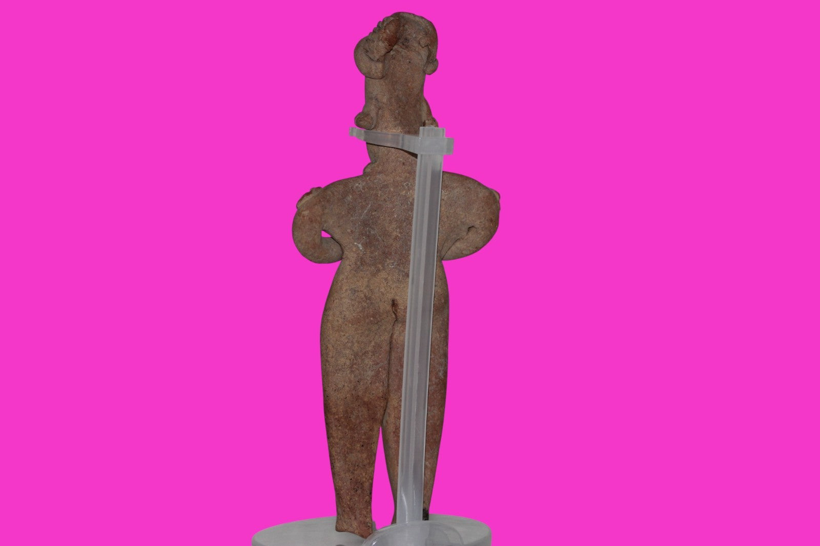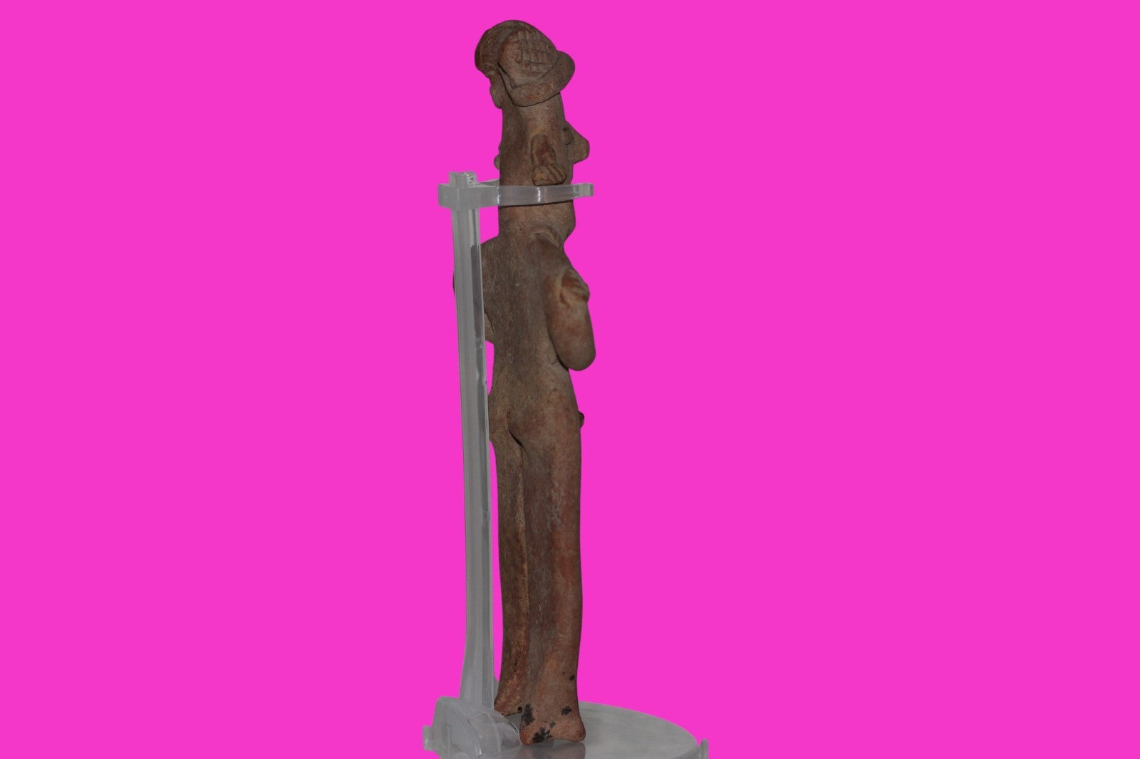 Dimensions: 8 inches tall, 3 ½ inches wide, weighs 183 grams. History: The deceased were lowered tied to boards through long shafts into tombs where workers arranged the bodies in their final resting places, often alongside previously interred family members. Tomb figures were placed with the fallen to provide companionship, guidance, and protection in the afterlife. Description: Large male figure with decorated shoulders, wearing elaborate headgear, ear ornaments, and a fancy necklace. No repairs or restorations found. Overall Outstanding condition. Manganese Dioxide Reactivity Test Results: 40% hydrogen peroxide was applied to multiple manganese blooms that resulted in a chemical reaction confirming approximately 2000 years of underground burial. Provenance: Ex. Private Nevada collection. Ex. Dr. David Harner collection, Arkansas, 1950’s -1960’s.Ex. Arte Primitivo Fine Art Gallery, February 2025. Acquired by The Artifact City Collection in 2025.