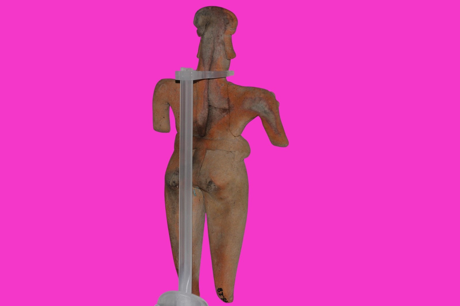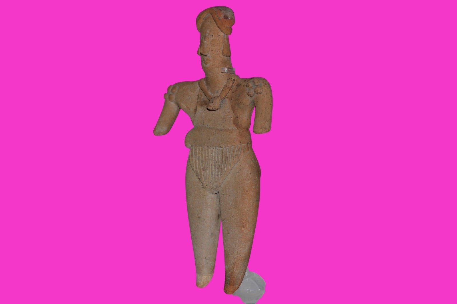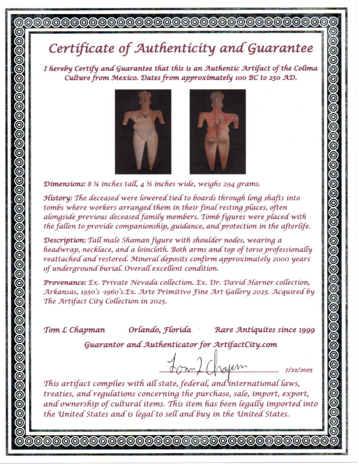 Dimensions: 8 ¼ inches tall, 4 ½ inches wide, weighs 294 grams. History: The deceased were lowered tied to boards through long shafts into tombs where workers arranged them in their final resting places, often alongside previous deceased family members. Tomb figures were placed with the fallen to provide companionship, guidance, and protection in the afterlife. Description: Tall male Shaman figure with shoulder nodes, wearing a headwrap, necklace, and a loincloth. Both arms and top of torso professionally reattached and restored. Mineral deposits confirm approximately 2000 years of underground burial. Overall excellent condition. Provenance: Ex. Private Nevada collection. Ex. Dr. David Harner collection, Arkansas, 1950’s -1960’s.Ex. Arte Primitivo Fine Art Gallery 2025. Acquired by The Artifact City Collection in 2025.