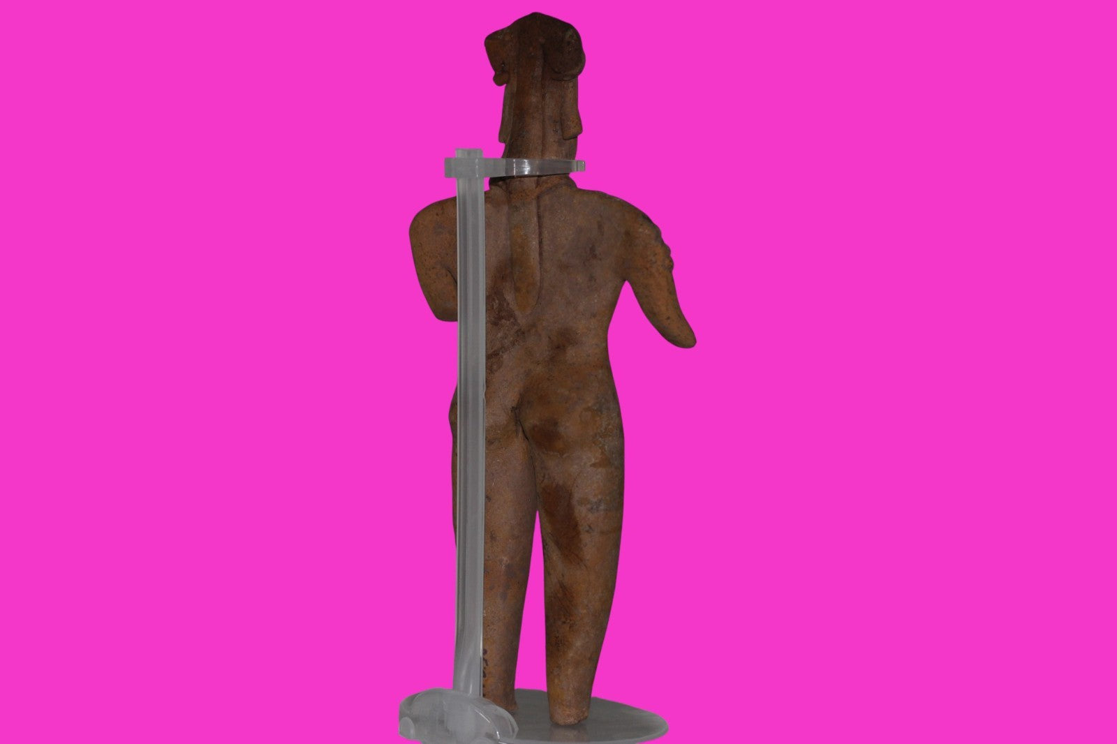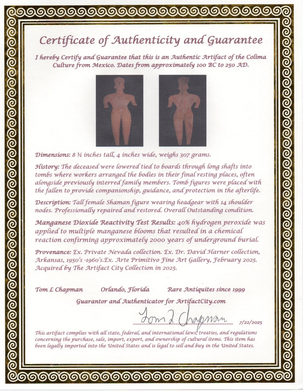 Dimensions: 8 ½ inches tall, 4 inches wide, weighs 307 grams.History: The deceased were lowered tied to boards through long shafts into tombs where workers arranged the bodies in their final resting places, often alongside previously interred family members. Tomb figures were placed with the fallen to provide companionship, guidance, and protection in the afterlife. Description: Tall female Shaman figure wearing headgear with 14 shoulder nodes. Professionally repaired and restored. Overall Outstanding condition. Manganese Dioxide Reactivity Test Results: 40% hydrogen peroxide was applied to multiple manganese blooms that resulted in a chemical reaction confirming approximately 2000 years of underground burial. Provenance: Ex. Private Nevada collection. Ex. Dr. David Harner collection, Arkansas, 1950’s -1960’s.Ex. Arte Primitivo Fine Art Gallery, February 2025. Acquired by The Artifact City Collection in 2025.