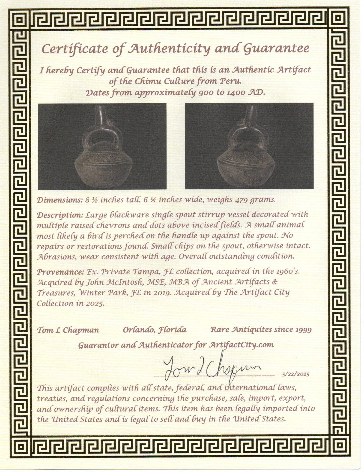Dimensions: 8 ½ inches tall, 6 ¼ inches wide, weighs 479 grams. Description: Large blackware single spout stirrup vessel decorated with multiple raised chevrons and dots above incised fields. A small animal most likely a bird is perched on the handle up against the spout. No repairs or restorations found. Small chips on the spout, otherwise intact. Abrasions, wear consistent with age. Overall outstanding condition. Provenance: Ex. Private Tampa, FL collection, acquired in the 1960’s. Acquired by John McIntosh, MSE, MBA of Ancient Artifacts & Treasures, Winter Park, FL in 2019. Acquired by The Artifact City Collection in 2025.
