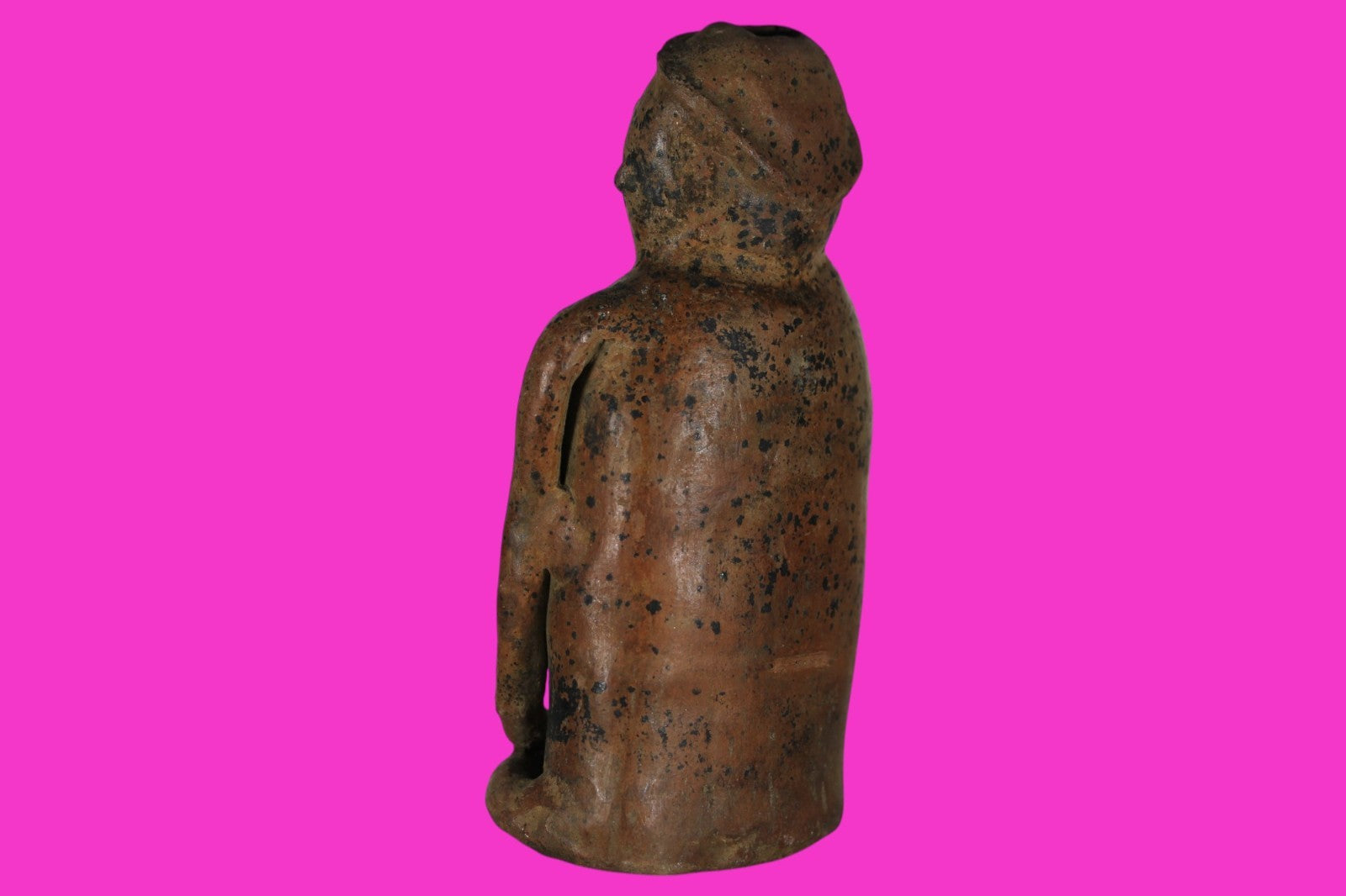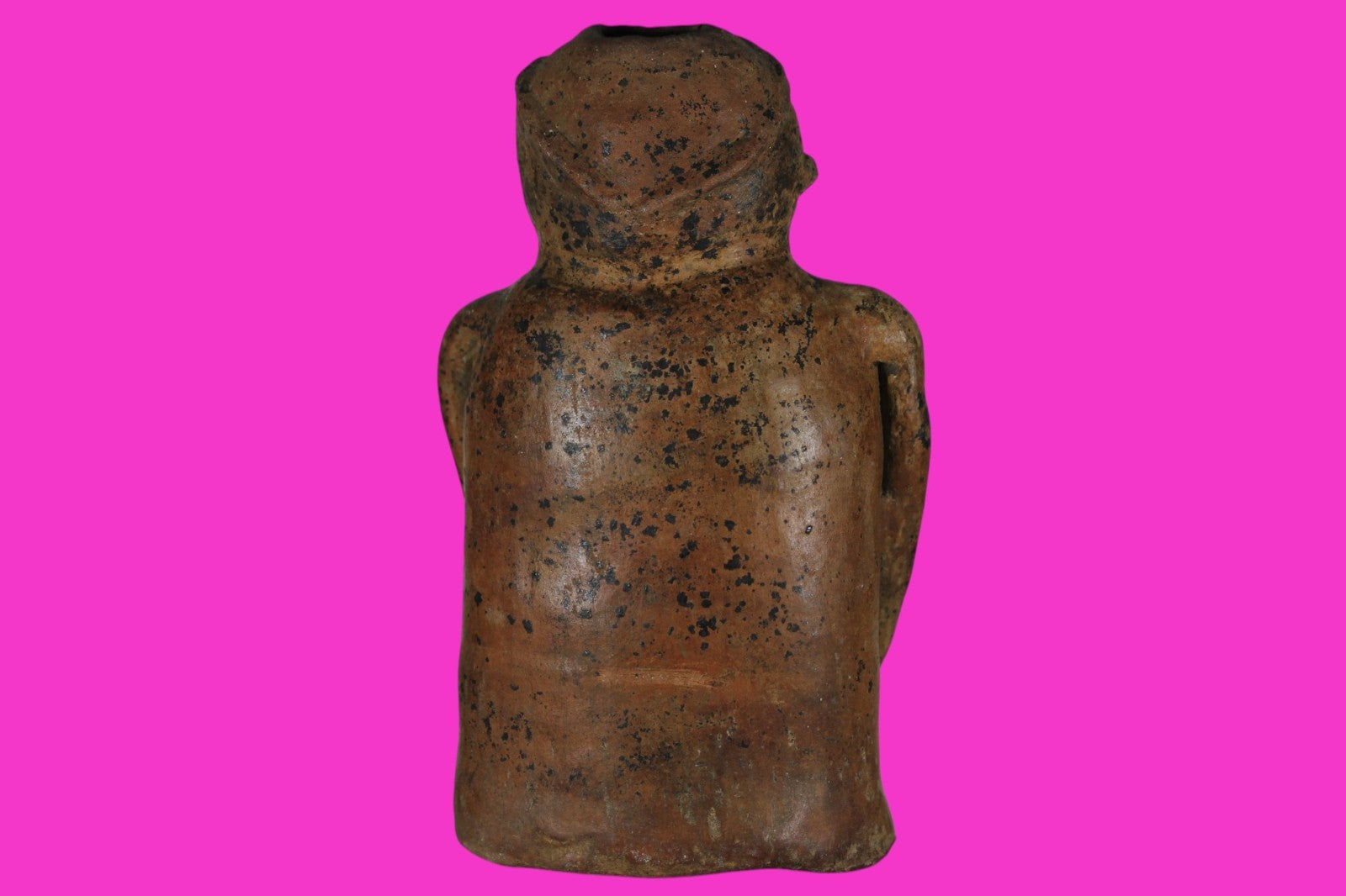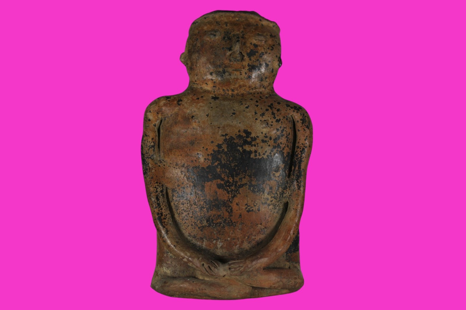 Dimensions: 9 ¼ inches tall, 5 ¾ inches wide, weighs 1277 grams. Description: Large and heavy redware seated figure wearing a cap and nose ring. Legs folded with both hands resting on his feet. Some minor restoration to the hands and feet. Otherwise intact. Abrasions and wear consistent with age. Overall excellent condition. Manganese Dioxide Reactivity Test Results: A solution of laboratory grade 40% hydrogen peroxide was applied to multiple manganese blooms that resulted in a strong chemical reaction indicating approximately 1500 years of underground burial. Provenance: Ex. Private Florida collection, Acquired late 1990’s. Ex. Arte Primitivo Fine Art Gallery, 2025. Acquired by The Artifact City Collection in 2025.