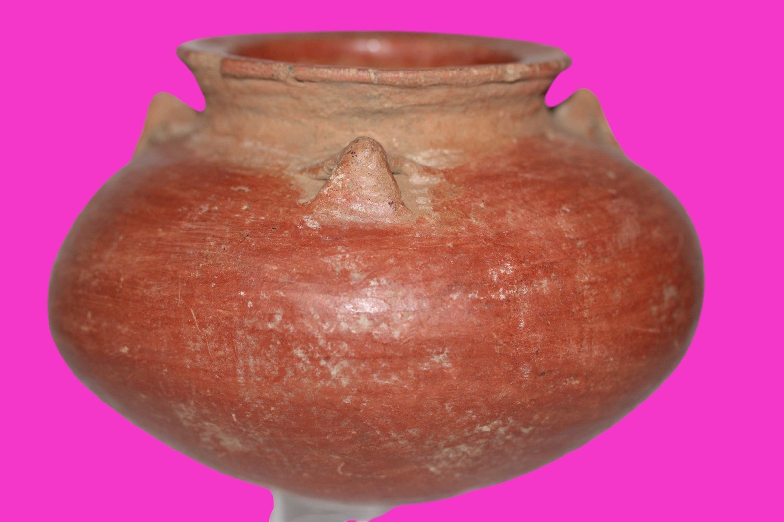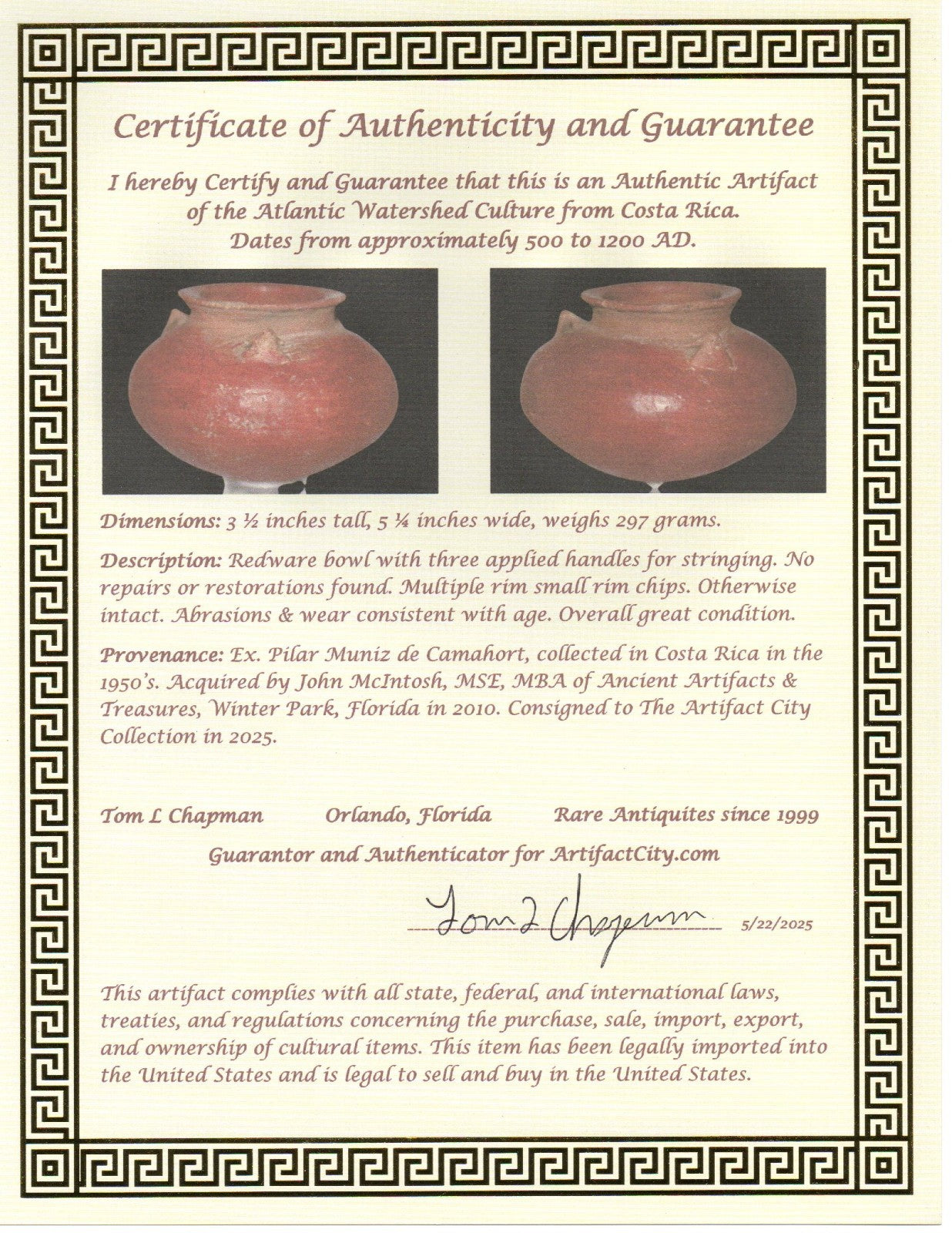 Dimensions: 3 ½ inches tall, 5 ¼ inches wide, weighs 297 grams. Description: Redware bowl with three applied handles for stringing. No repairs or restorations found. Multiple rim small rim chips. Otherwise intact. Abrasions & wear consistent with age. Overall great condition. Provenance: Ex. Pilar Muniz de Camahort, collected in Costa Rica in the 1950’s. Acquired by John McIntosh, MSE, MBA of Ancient Artifacts & Treasures, Winter Park, Florida in 2010. Consigned to The Artifact City Collection in 2025.
