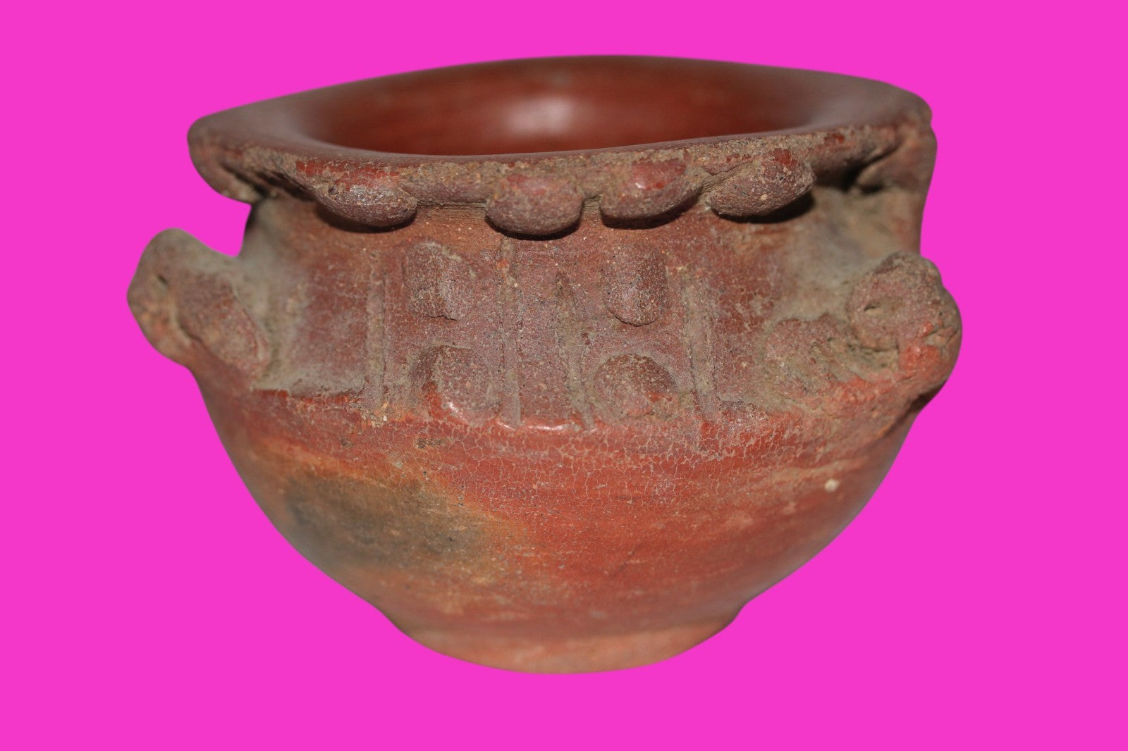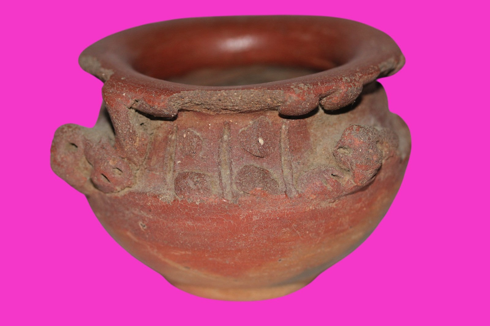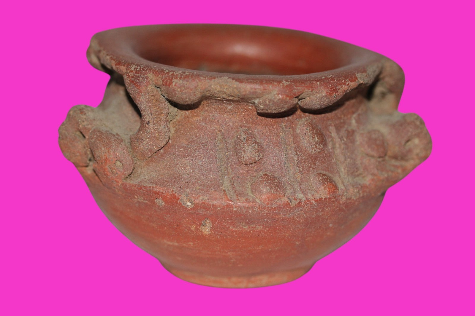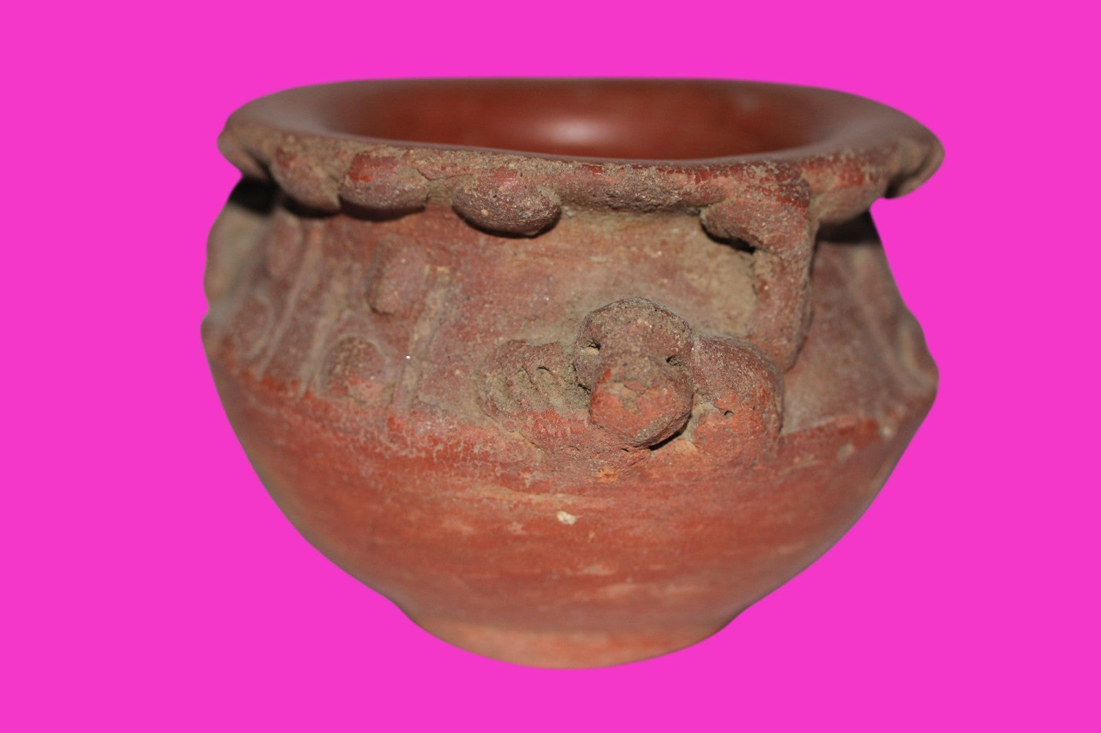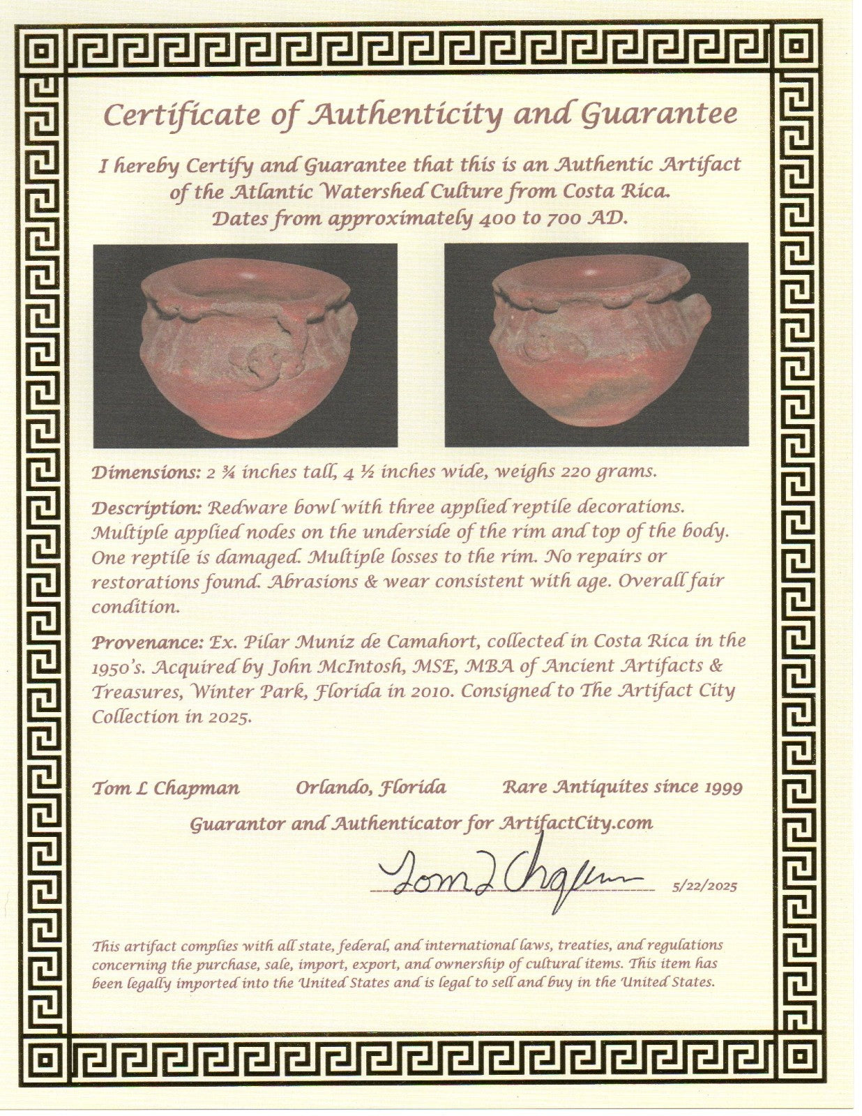 Dimensions: 2 ¾ inches tall, 4 ½ inches wide, weighs 220 grams. Description: Redware bowl with three applied reptile decorations. Multiple applied nodes on the underside of the rim and top of the body. One reptile is damaged. Multiple losses to the rim. No repairs or restorations found. Abrasions & wear consistent with age. Overall fair condition. Provenance: Ex. Pilar Muniz de Camahort, collected in Costa Rica in the 1950’s. Acquired by John McIntosh, MSE, MBA of Ancient Artifacts & Treasures, Winter Park, Florida in 2010. Consigned to The Artifact City Collection in 2025.