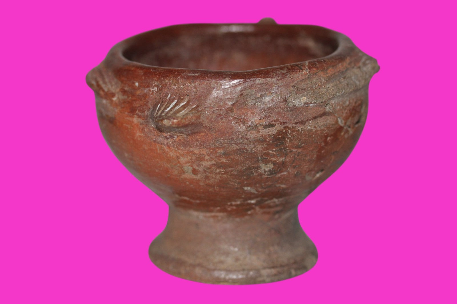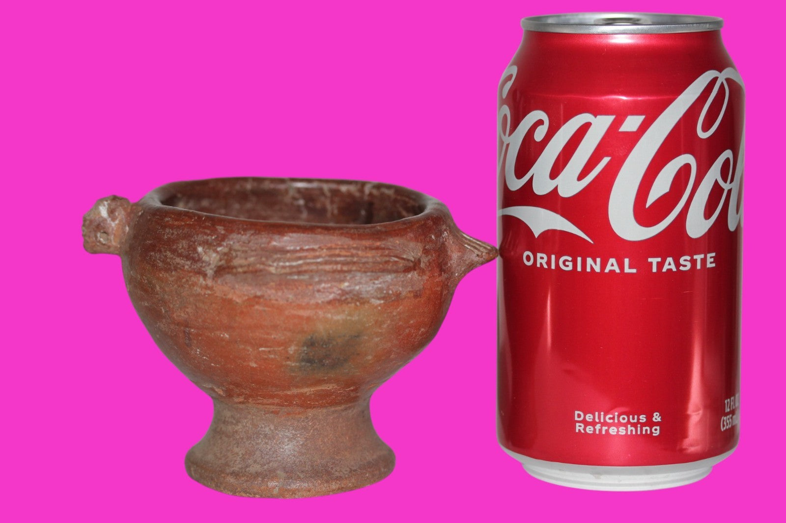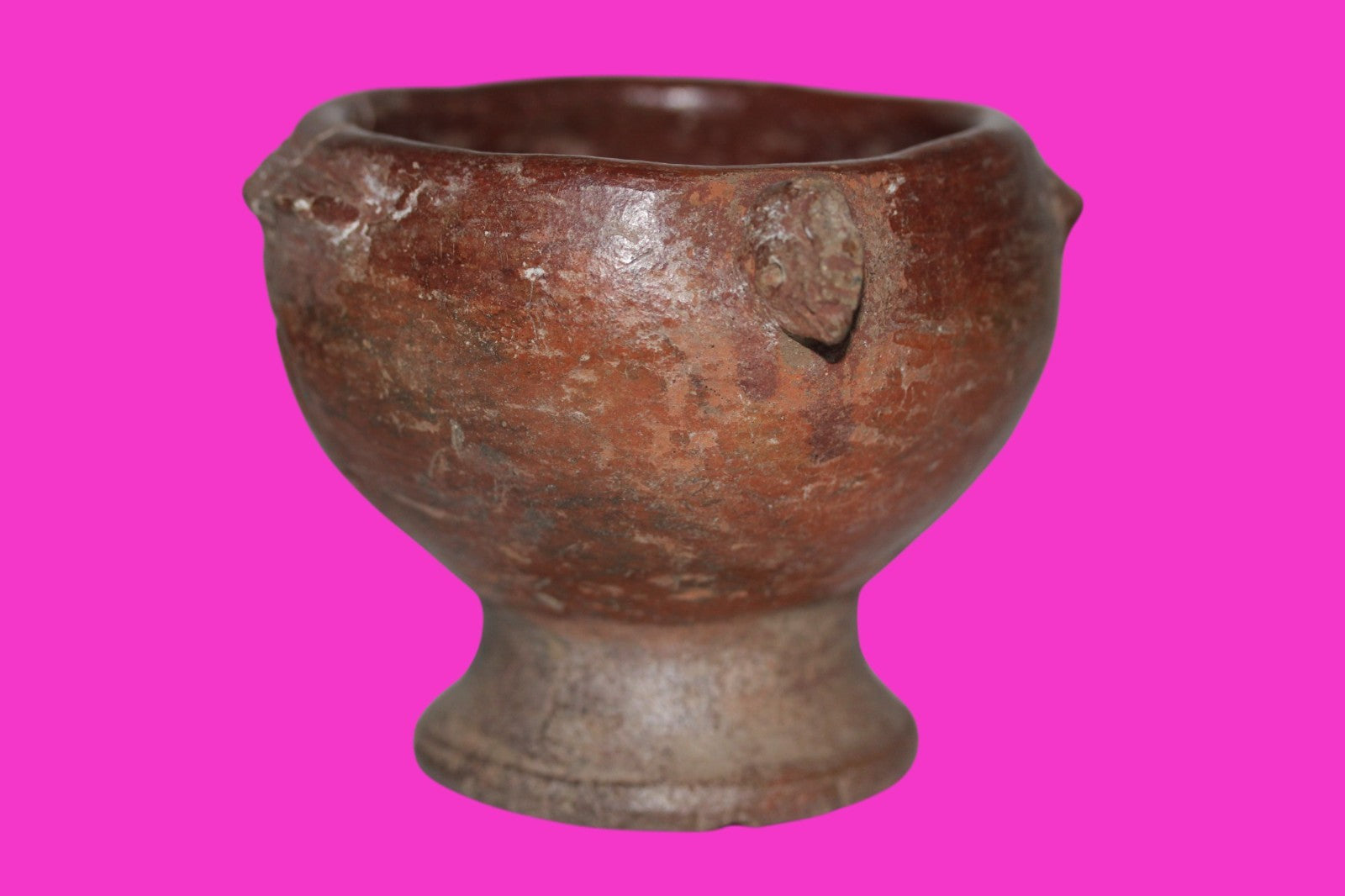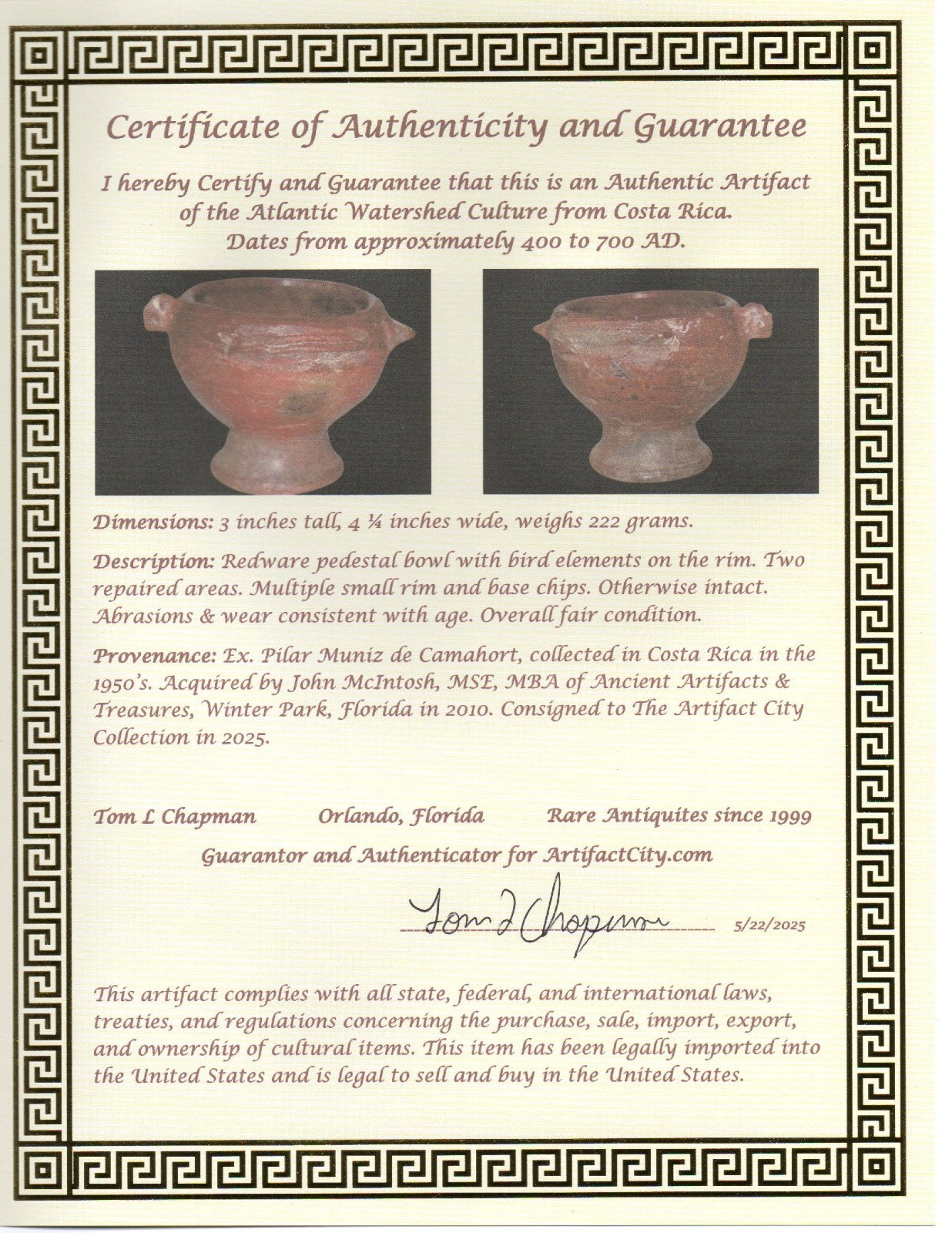 Dimensions: 3 inches tall, 4 ¼ inches wide, weighs 222 grams. Description: Redware pedestal bowl with bird elements on the rim. Two repaired areas. Multiple small rim and base chips. Otherwise intact. Abrasions & wear consistent with age. Overall fair condition. Provenance: Ex. Pilar Muniz de Camahort, collected in Costa Rica in the 1950’s. Acquired by John McIntosh, MSE, MBA of Ancient Artifacts & Treasures, Winter Park, Florida in 2010. Consigned to The Artifact City Collection in 2025.