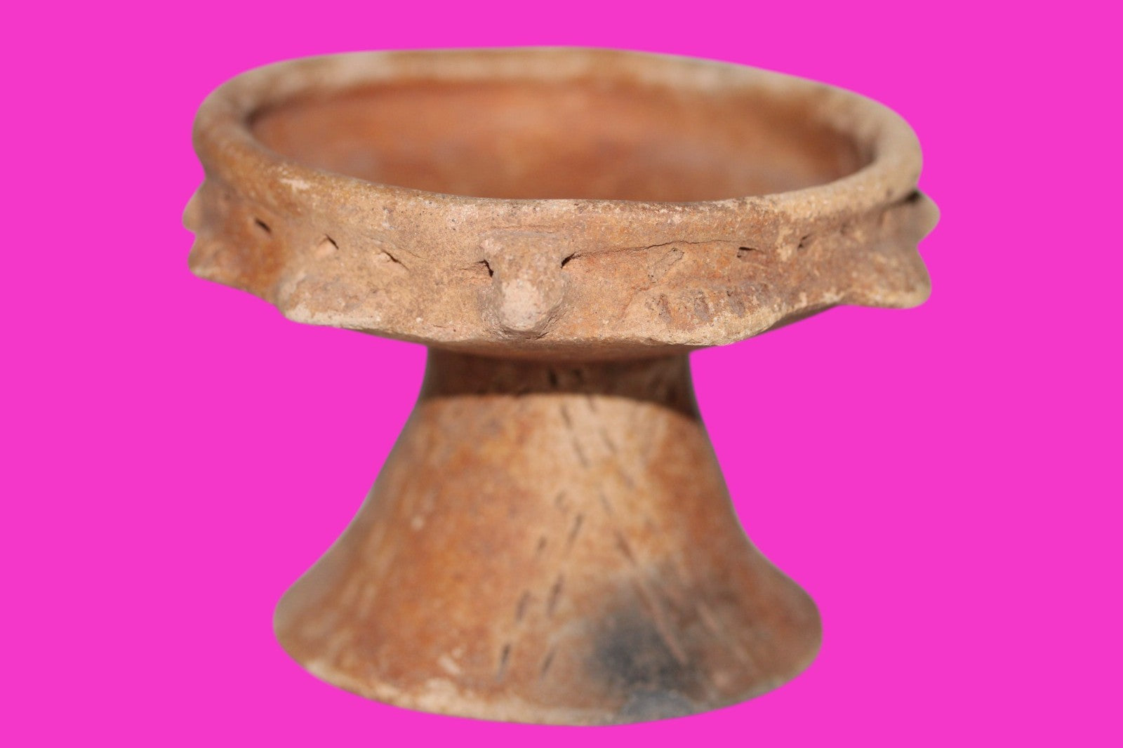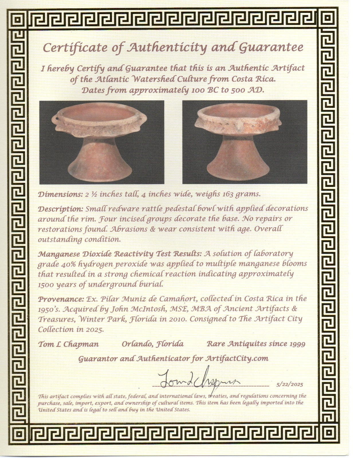 Dimensions: 2 ½ inches tall, 4 inches wide, weighs 163 grams. Description: Small redware rattle pedestal bowl with applied decorations around the rim. Four incised groups decorate the base. No repairs or restorations found. Abrasions & wear consistent with age. Overall outstanding condition. Manganese Dioxide Reactivity Test Results: A solution of laboratory grade 40% hydrogen peroxide was applied to multiple manganese blooms that resulted in a strong chemical reaction indicating approximately 1500 years of underground burial. Provenance: Ex. Pilar Muniz de Camahort, collected in Costa Rica in the 1950’s. Acquired by John McIntosh, MSE, MBA of Ancient Artifacts & Treasures, Winter Park, Florida in 2010. Consigned to The Artifact City Collection in 2025.