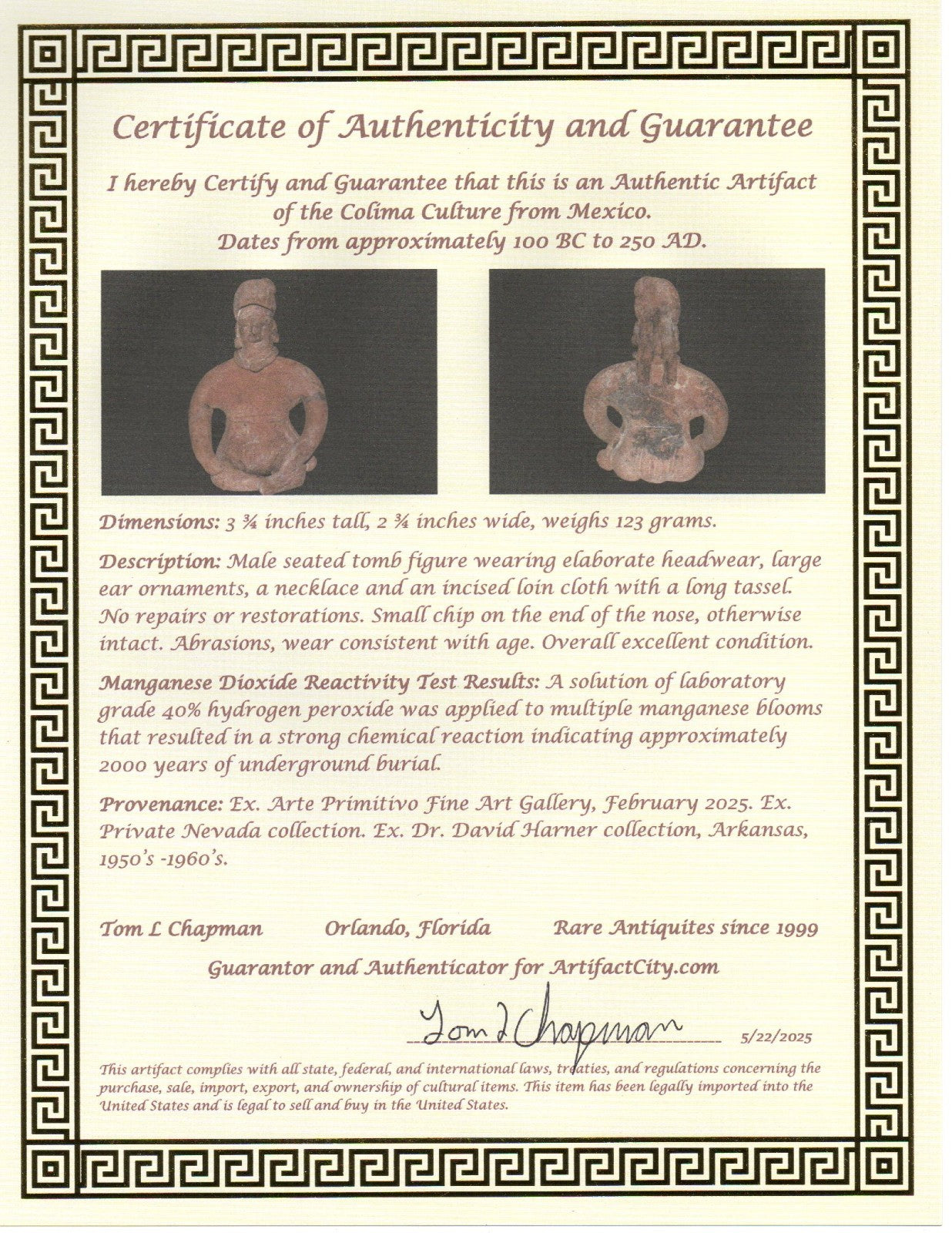 Dimensions: 3 ¾ inches tall, 2 ¾ inches wide, weighs 123 grams. Description: Male seated tomb figure wearing elaborate headwear, large ear ornaments, a necklace and an incised loin cloth with a long tassel. No repairs or restorations. Small chip on the end of the nose, otherwise intact. Abrasions, wear consistent with age. Overall excellent condition. Manganese Dioxide Reactivity Test Results: A solution of laboratory grade 40% hydrogen peroxide was applied to multiple manganese blooms that resulted in a strong chemical reaction indicating approximately 2000 years of underground burial. Provenance: Ex. Arte Primitivo Fine Art Gallery, February 2025. Ex. Private Nevada collection. Ex. Dr. David Harner collection, Arkansas, 1950’s -1960’s.