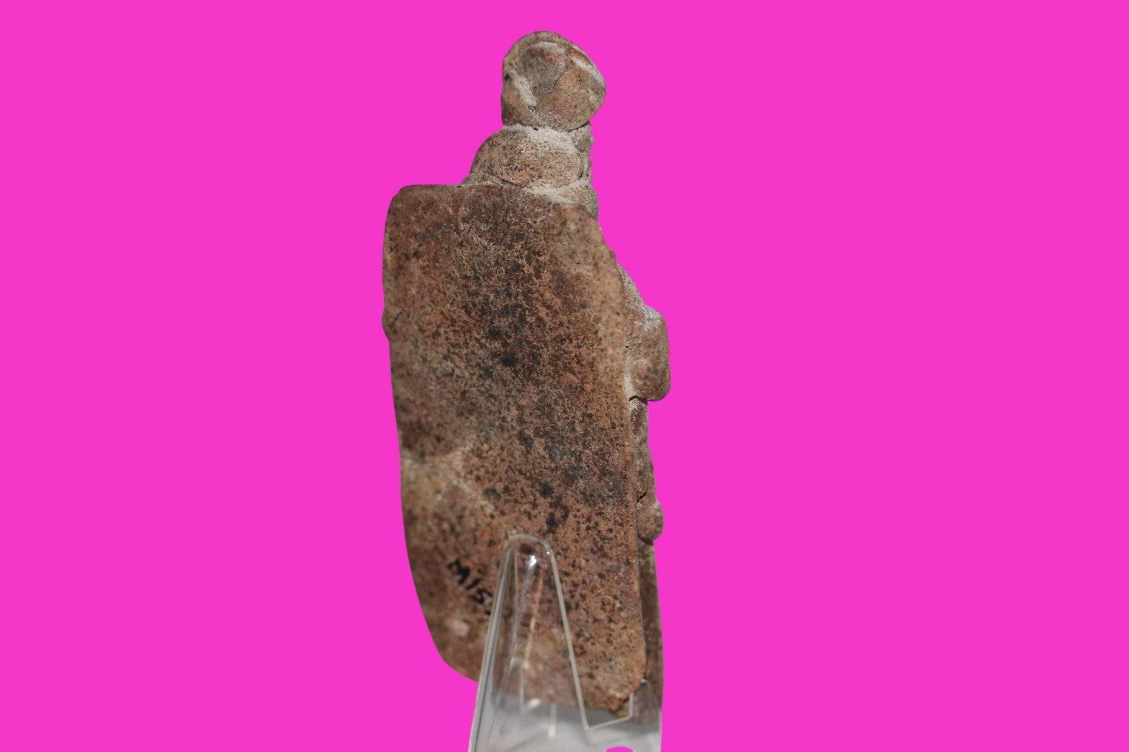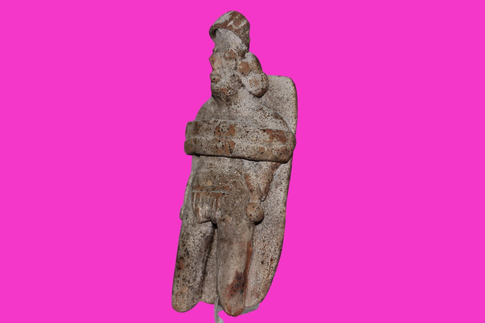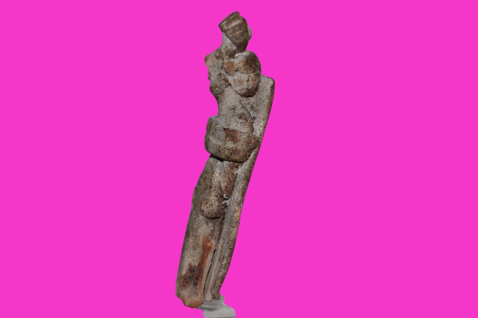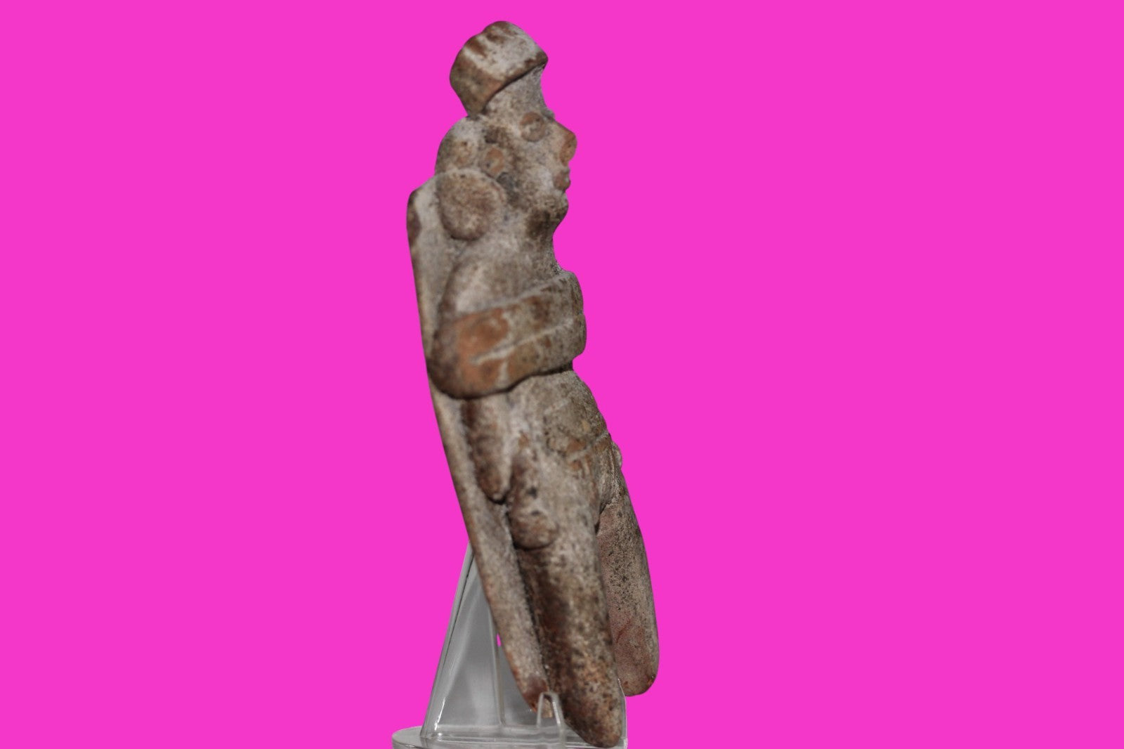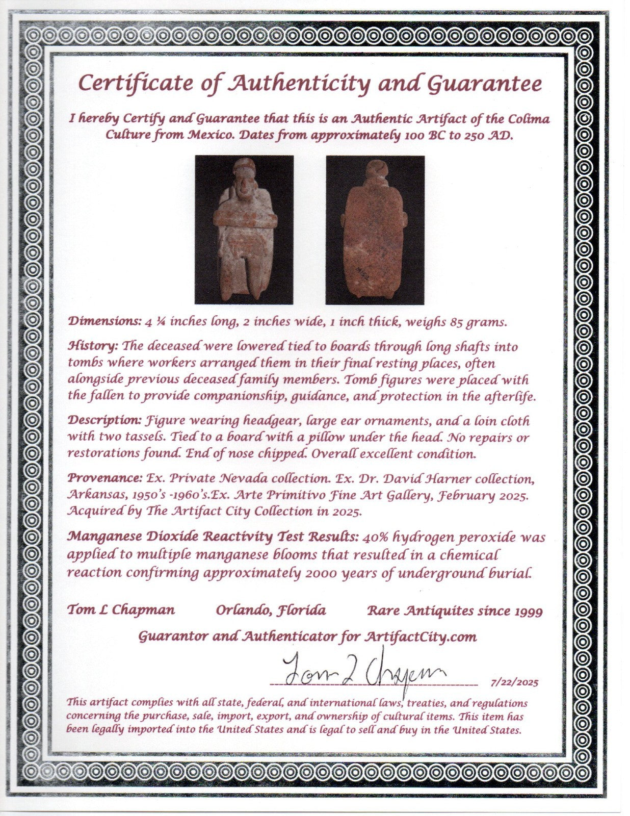 Dimensions: 4 ¼ inches long, 2 inches wide, 1 inch thick, weighs 85 grams.History: The deceased were lowered tied to boards through long shafts into tombs where workers arranged them in their final resting places, often alongside previous deceased family members. Tomb figures were placed with the fallen to provide companionship, guidance, and protection in the afterlife.Description: Figure wearing headgear, large ear ornaments, and a loin cloth with two tassels. Tied to a board with a pillow under the head. No repairs or restorations found. End of nose chipped. Overall excellent condition.Provenance: Ex. Private Nevada collection. Ex. Dr. David Harner collection, Arkansas, 1950’s -1960’s.Ex. Arte Primitivo Fine Art Gallery, February 2025. Acquired by The Artifact City Collection in 2025.Manganese Dioxide Reactivity Test Results: 40% hydrogen peroxide was applied to multiple manganese blooms that resulted in a chemical reaction confirming approximately 2000 years of burial