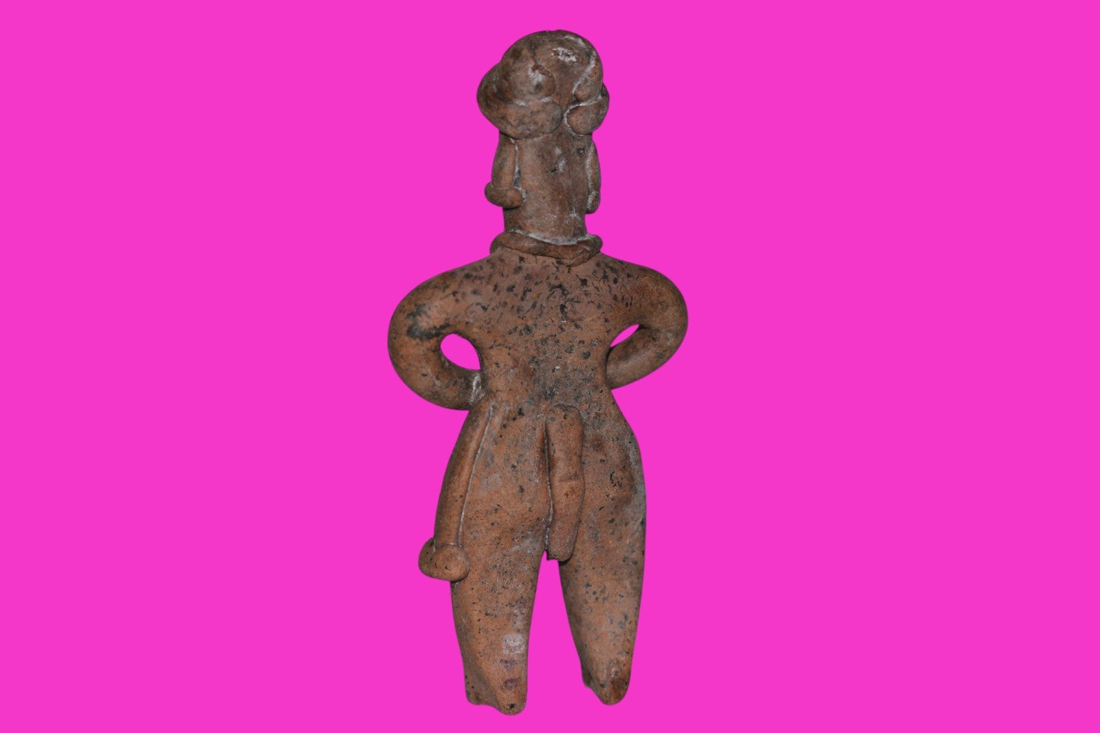Dimensions: 5 inches tall, 2 ½ inches wide, weighs 89 grams. Description: Male tomb figure wearing elaborate headwear, large ear ornaments, a necklace, a incised loin cloth with a long tassel. No repairs or restorations. Small flake on the end of the nose, otherwise intact. Abrasions and wear consistent with age. Overall outstanding condition. Manganese Dioxide Reactivity Test Results: A solution of laboratory grade 40% hydrogen peroxide was applied to multiple manganese blooms that resulted in a strong chemical reaction indicating approximately 2000 years of underground burial. Provenance: Ex. Arte Primitivo Fine Art Gallery, February 2025. Ex. Private Nevada collection. Ex. Dr. David Harner collection, Arkansas, 1950’s -1960’s.