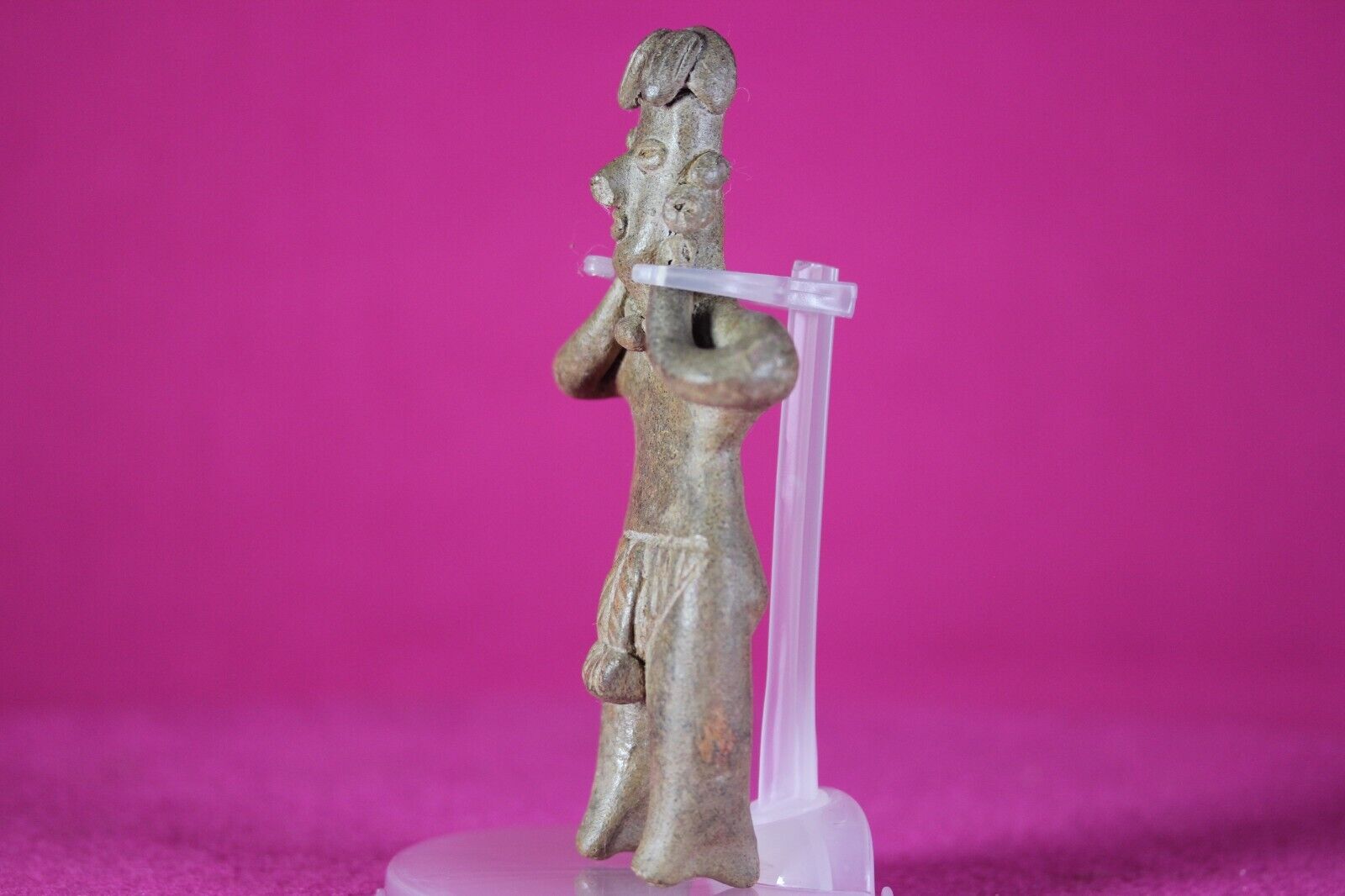 Chipped nose. The Colima culture buried their fallen with figurines like this stunning example so the dead would have companionship in the afterlife. The Colima utilized shaft tombs extensively. A shaft was dug a few feet and a tomb dug out at the bottom of the shaft. The deceased was gently lowered down the shaft into the tomb. The burial buddy was lowered with the deceased so they would not be lonely in the afterlife. Pretty cool eh?