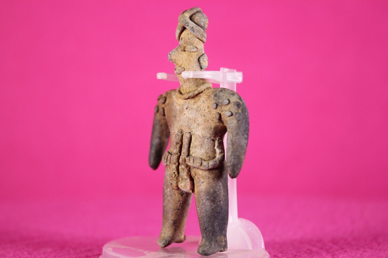 Outstanding condition. Very rare in this condition. No repairs or damage found. The Colima culture buried their fallen with figurines like this stunning example so the deceased would have companionship in the afterlife. A shaft was dug a few feet and a tomb dug out at the bottom of the shaft. The deceased was gently lowered down the shaft with the burial buddy into the tomb.