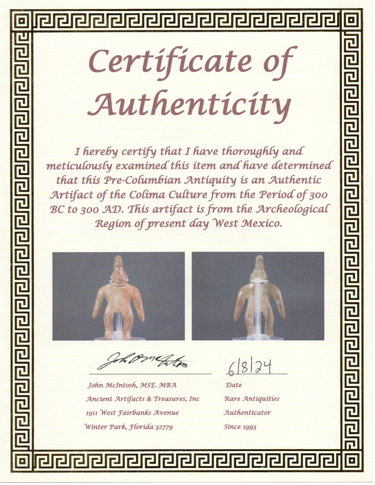 Pre Columbian Artifact Colima Shaman Mexico 300BC-300AD Certified COA J12