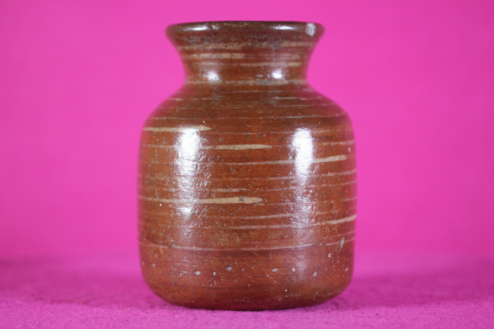 This beautiful orange olla features horizontal tan, yellow, and brown lines. Incredible sheen. This is a perfect example of the high quality pottery the Michoacan civilization created 2000 years ago. Very sturdy. No repairs found. One small rim chip.