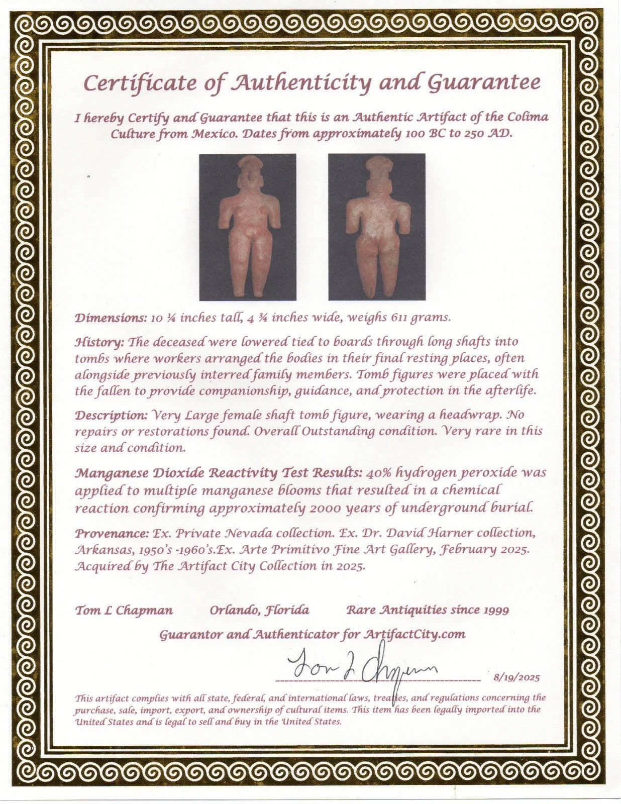 Dimensions: 10 ¼ inches tall, 4 ¾ inches wide, weighs 611 grams. History: The deceased were lowered tied to boards through long shafts into tombs where workers arranged the bodies in their final resting places, often alongside previously interred family members. Tomb figures were placed with the fallen to provide companionship, guidance, and protection in the afterlife. Description: Very Large female shaft tomb figure, wearing a headwrap. No repairs or restorations found. Overall Outstanding condition. Very rare in this size and condition. Manganese Dioxide Reactivity Test Results: 40% hydrogen peroxide was applied to multiple manganese blooms that resulted in a chemical reaction confirming approximately 2000 years of underground burial. Provenance: Ex. Private Nevada collection. Ex. Dr. David Harner collection, Arkansas, 1950’s -1960’s.Ex. Arte Primitivo Fine Art Gallery, February 2025. Acquired by The Artifact City Collection in 2025.