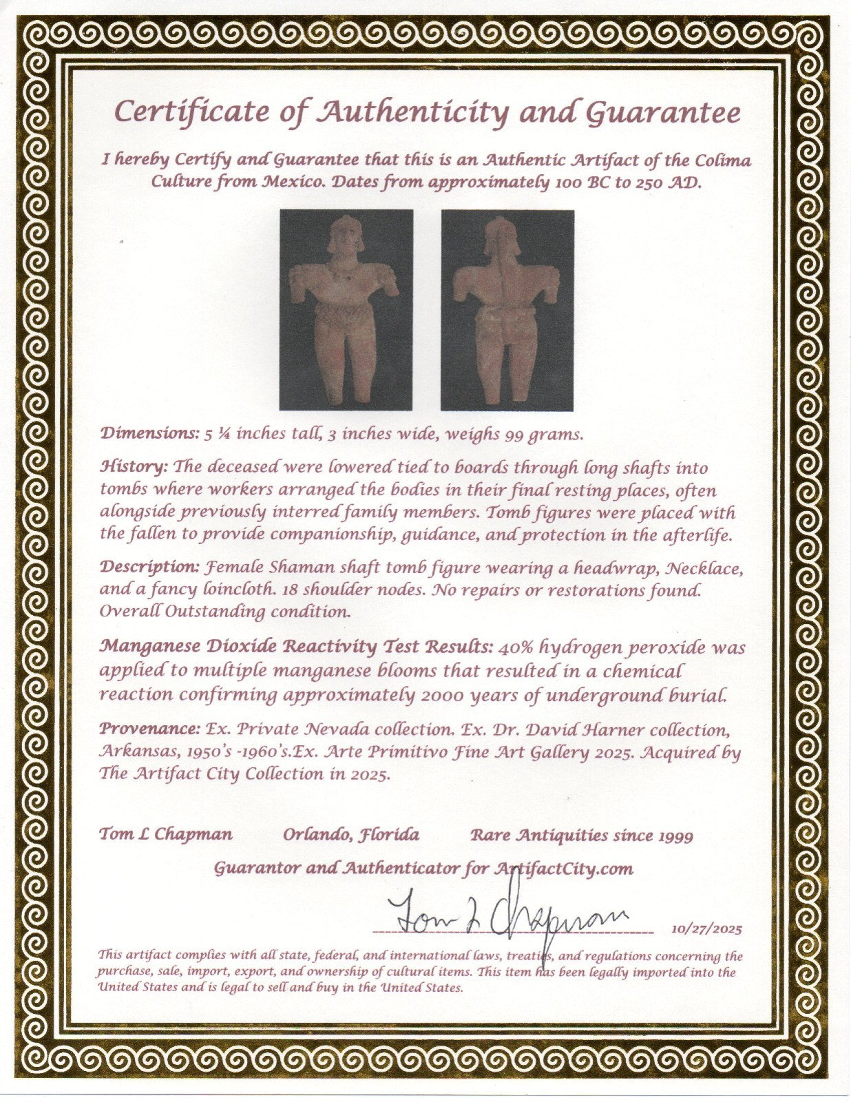 Dimensions: 5 ¼ inches tall, 3 inches wide, weighs 99 grams. History: The deceased were lowered tied to boards through long shafts into tombs where workers arranged the bodies in their final resting places, often alongside previously interred family members. Tomb figures were placed with the fallen to provide companionship, guidance, and protection in the afterlife. Description: Female Shaman shaft tomb figure wearing a headwrap, Necklace, and a fancy loincloth. 18 shoulder nodes. No repairs or restorations found. Overall Outstanding condition. Manganese Dioxide Reactivity Test Results: 40% hydrogen peroxide was applied to multiple manganese blooms that resulted in a chemical reaction confirming approximately 2000 years of underground burial. Provenance: Ex. Private Nevada collection. Ex. Dr. David Harner collection, Arkansas, 1950’s -1960’s.Ex. Arte Primitivo Fine Art Gallery 2025. Acquired by The Artifact City Collection in 2025.