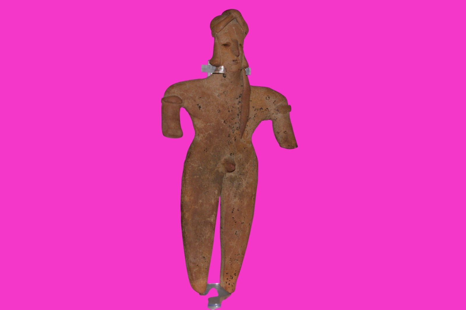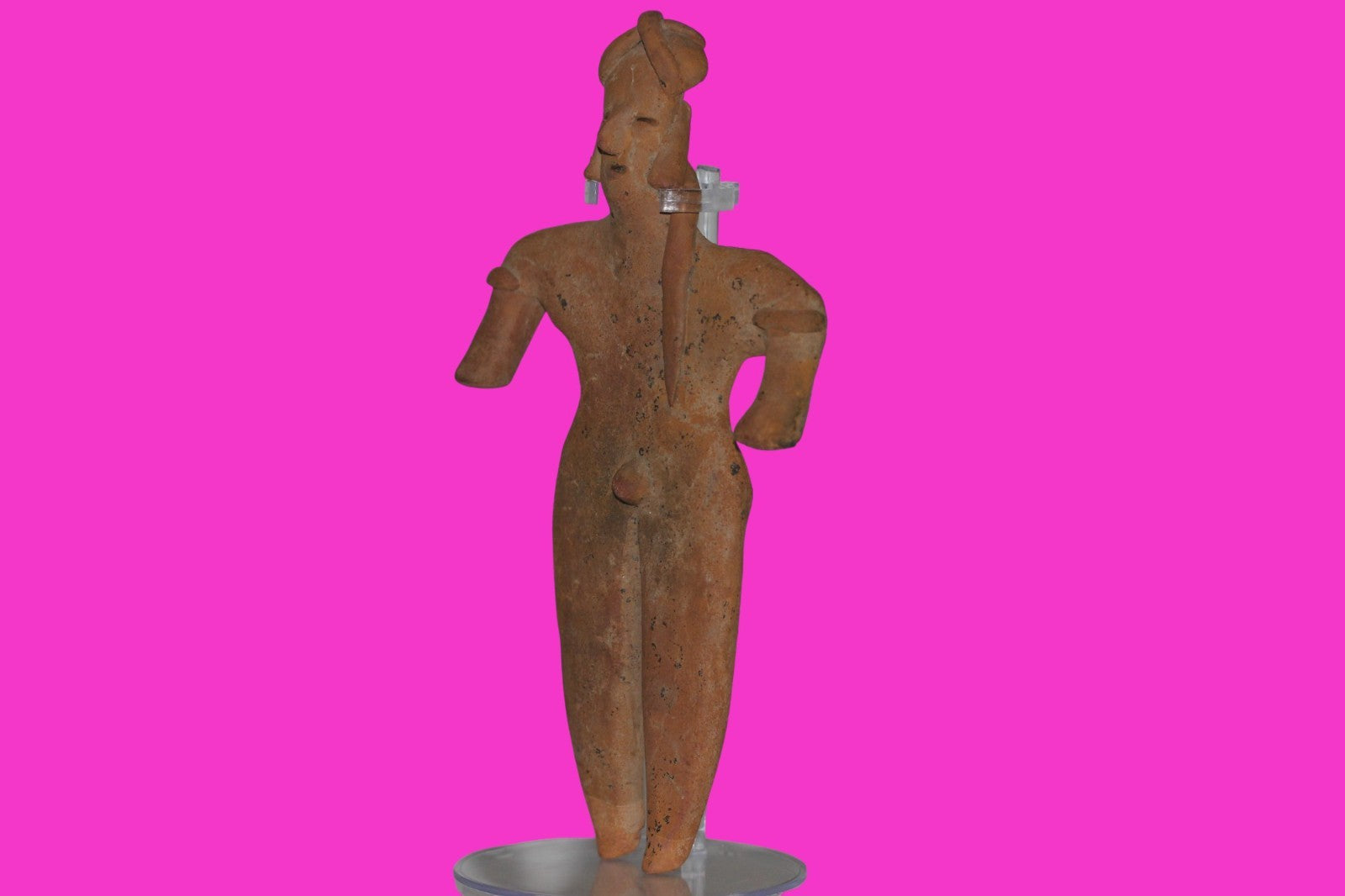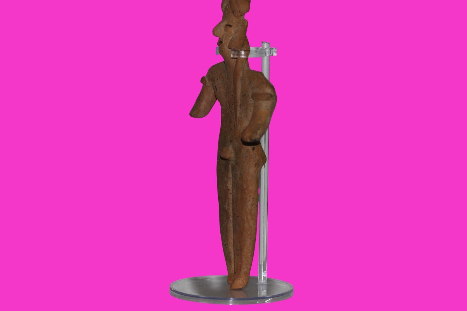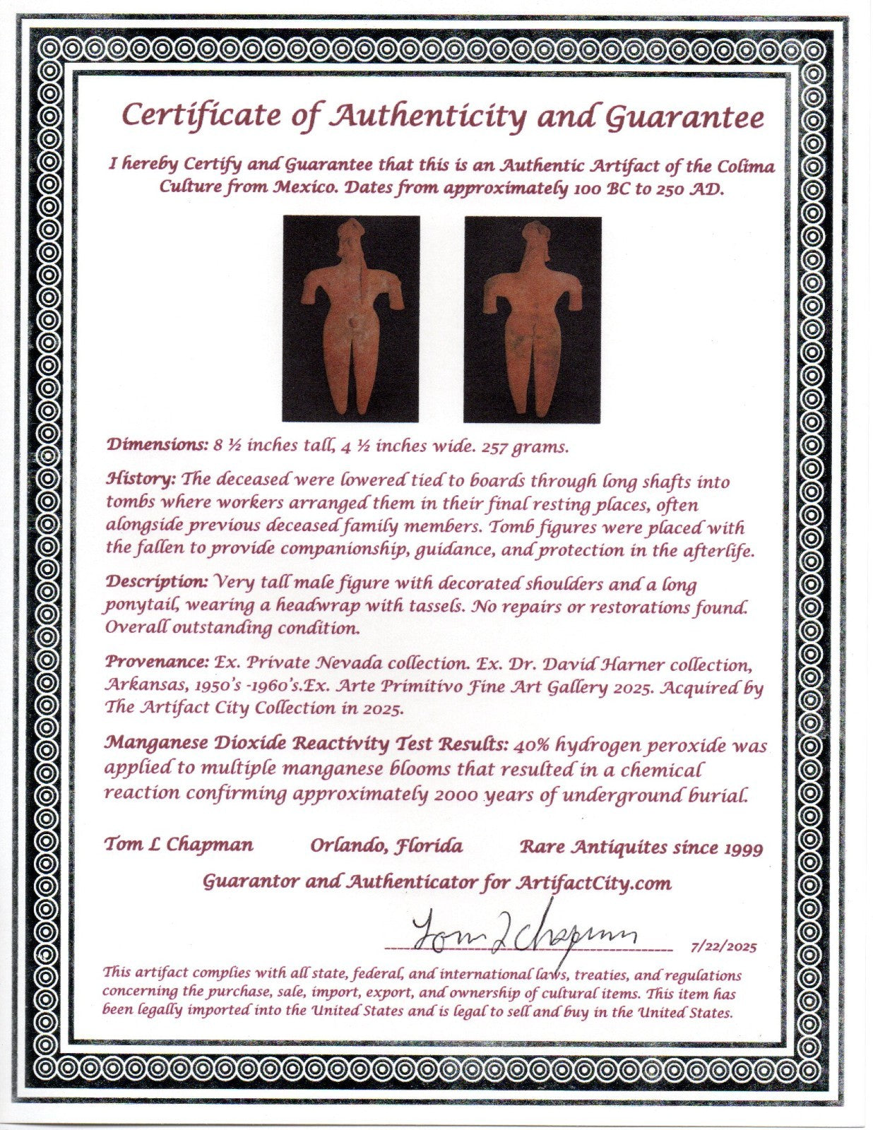 Dimensions: 8 ½ inches tall, 4 ½ inches wide. 257 grams. History: The deceased were lowered tied to boards through long shafts into tombs where workers arranged them in their final resting places, often alongside previous deceased family members. Tomb figures were placed with the fallen to provide companionship, guidance, and protection in the afterlife. Description: Very tall male figure with decorated shoulders and a long ponytail, wearing a headwrap with tassels. No repairs or restorations found. Overall outstanding condition. Provenance: Ex. Private Nevada collection. Ex. Dr. David Harner collection, Arkansas, 1950’s -1960’s.Ex. Arte Primitivo Fine Art Gallery, February 2025. Acquired by The Artifact City Collection in 2025. Manganese Dioxide Reactivity Test Results: 40% hydrogen peroxide was applied to multiple manganese blooms that resulted in a chemical reaction confirming approximately 2000 years of underground burial.