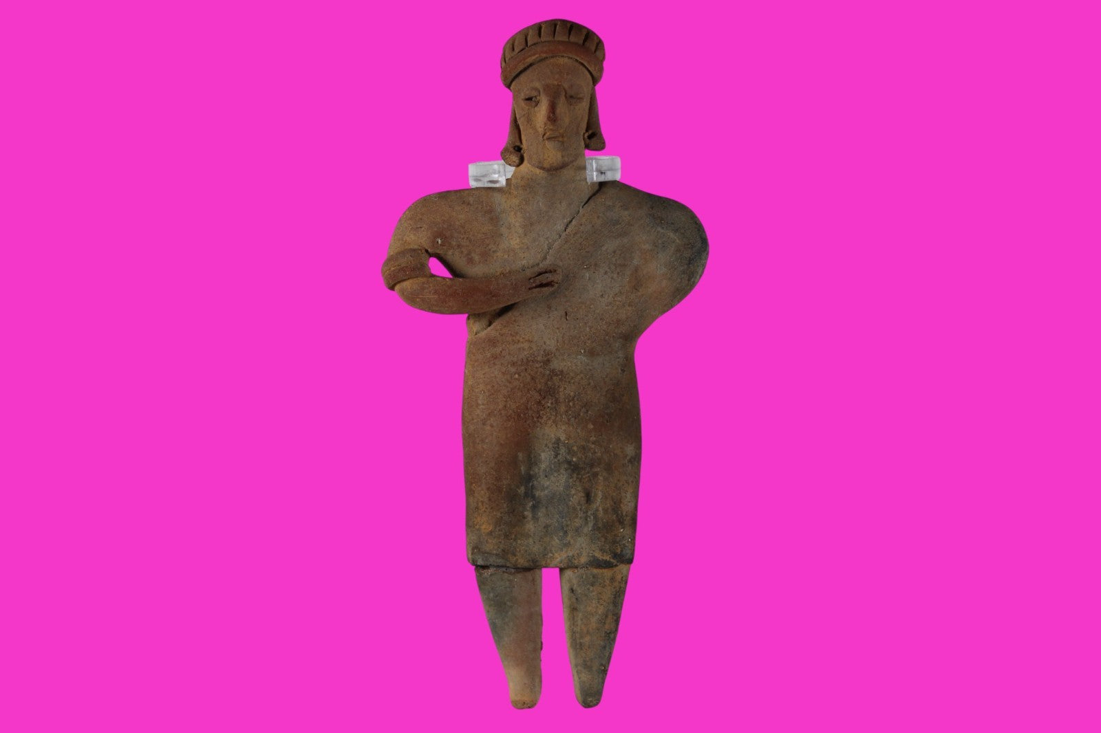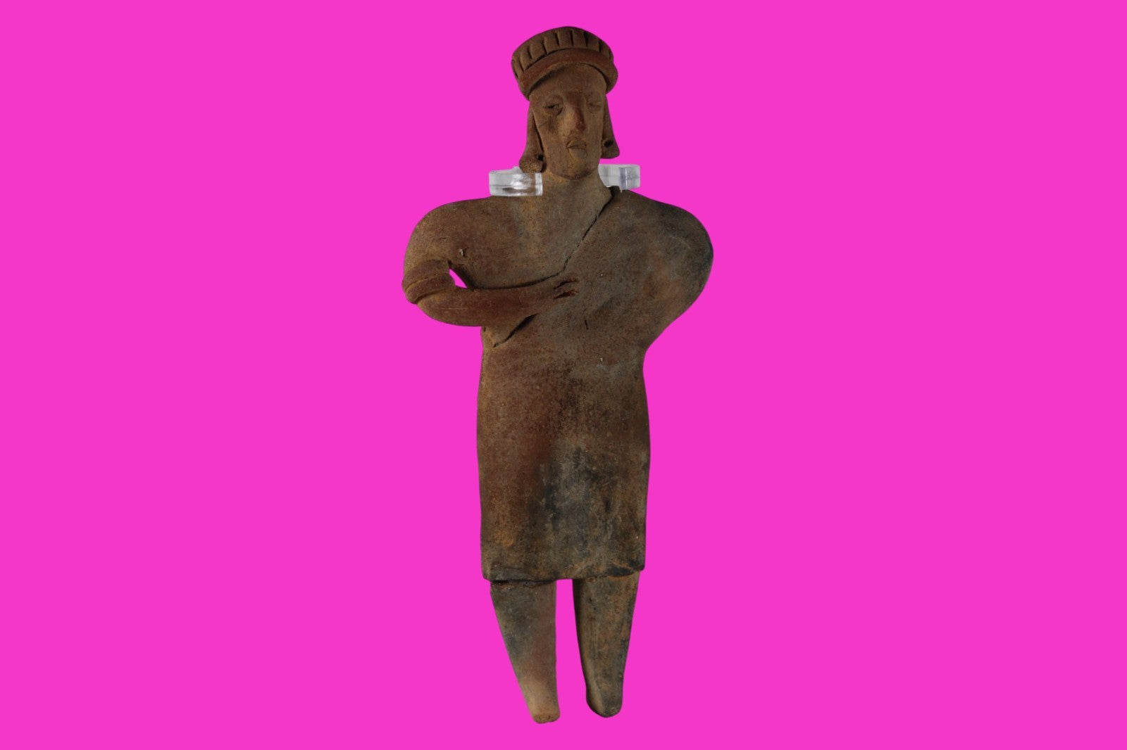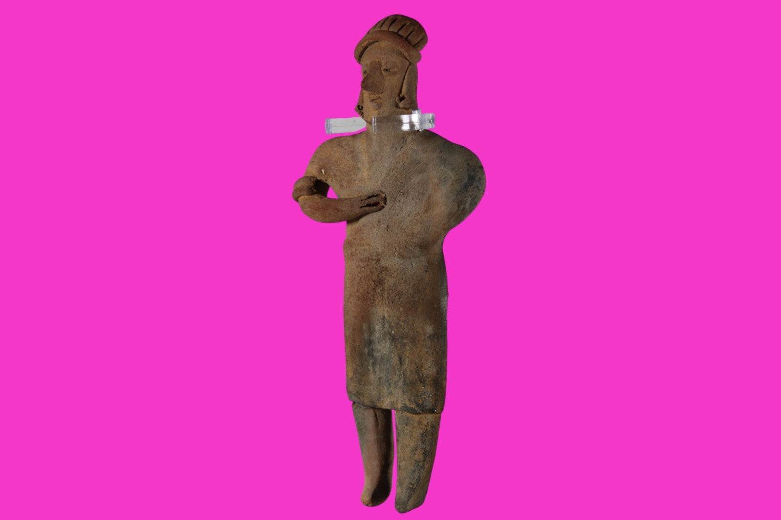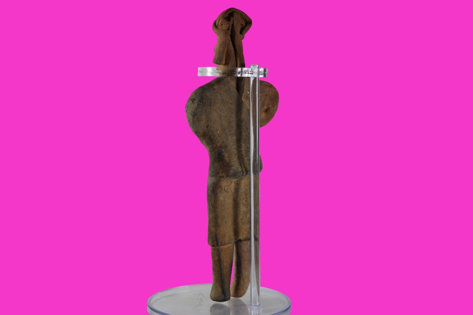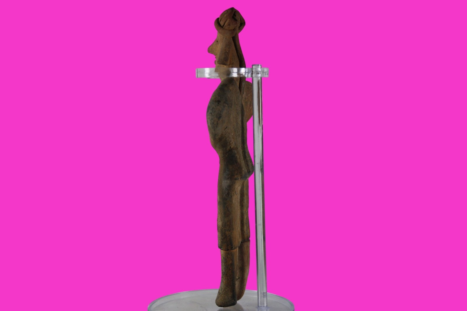 Dimensions: 7 ¼ inches tall, 3 ½ inches wide, weighs 148 grams. History: The deceased were lowered tied to boards through long shafts into tombs where workers arranged the bodies in their final resting places, often alongside previously interred family members. Tomb figures were placed with the fallen to provide companionship, guidance, and protection in the afterlife. Description: Large shaft tomb figure wearing a headwrap with the right arm in a sling. Left leg reattached. Overall Outstanding condition.Provenance: Ex. Private Nevada collection. Ex. Dr. David Harner collection, Arkansas, 1950’s -1960’s.Ex. Arte Primitivo Fine Art Gallery 2025. Acquired by The Artifact City Collection in 2025.