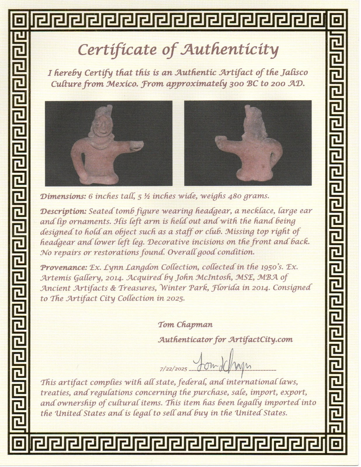 Dimensions: 6 inches tall, 5 ½ inches wide, weighs 480 grams. Description: Seated tomb figure wearing headgear, a necklace, large ear and lip ornaments. His left arm is held out and with the hand being designed to hold an object such as a staff or club. Missing top right of headgear and lower left leg. Decorative incisions on the front and back. No repairs or restorations found. Overall good condition. Provenance: Ex. Lynn Langdon Collection, collected in the 1950’s. Ex. Artemis Gallery, 2014. Acquired by John McIntosh, MSE, MBA of Ancient Artifacts & Treasures, Winter Park, Florida in 2014. Consigned to The Artifact City Collection in 2025.