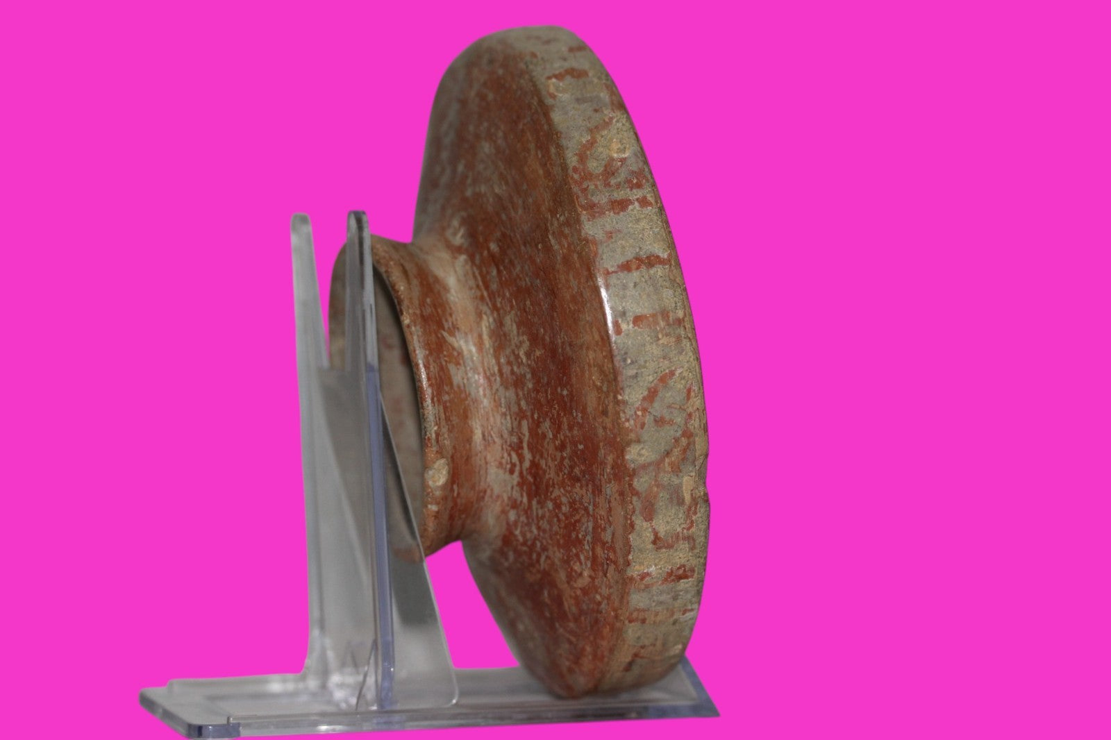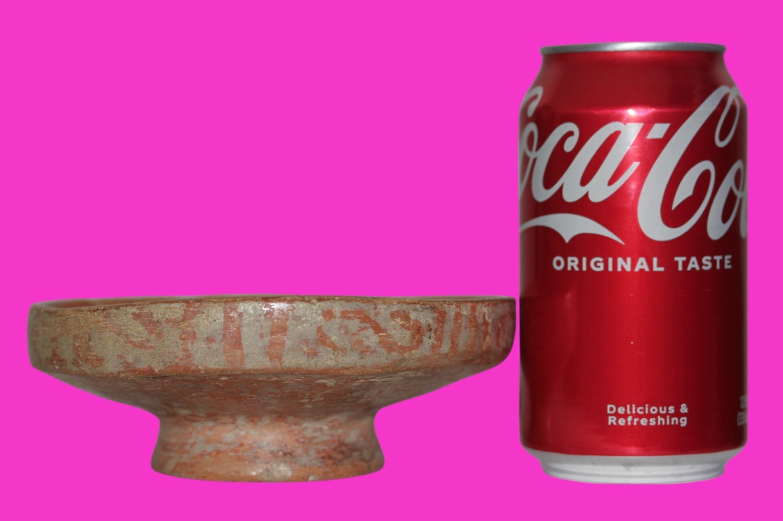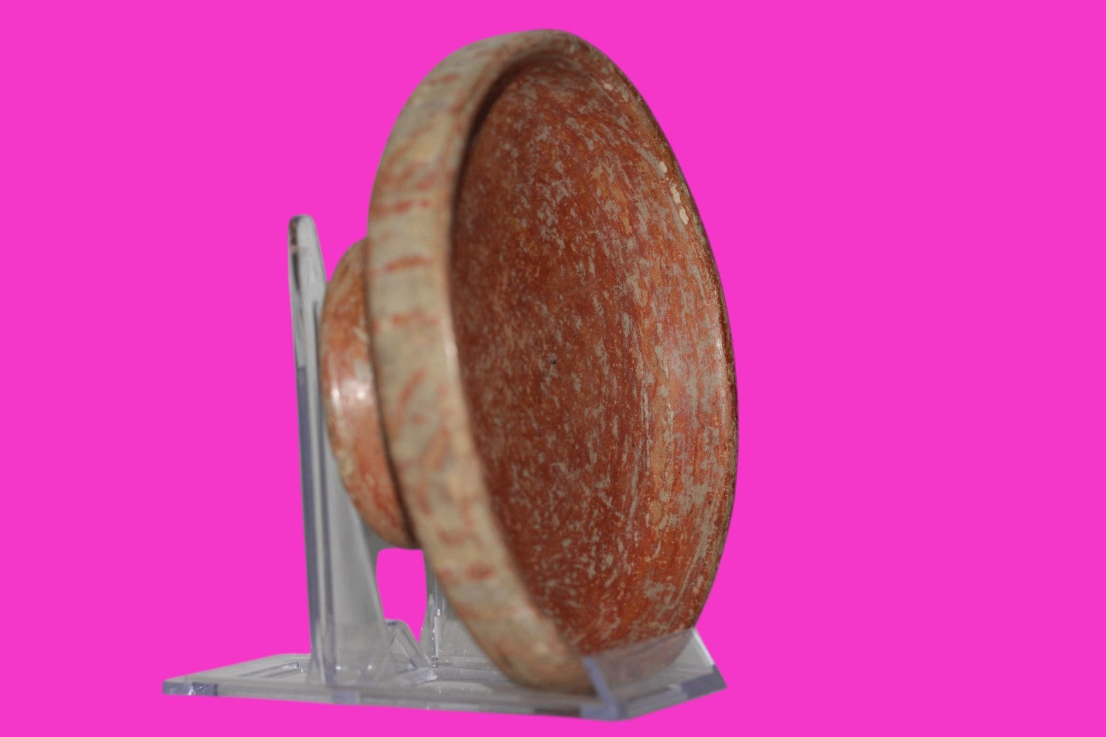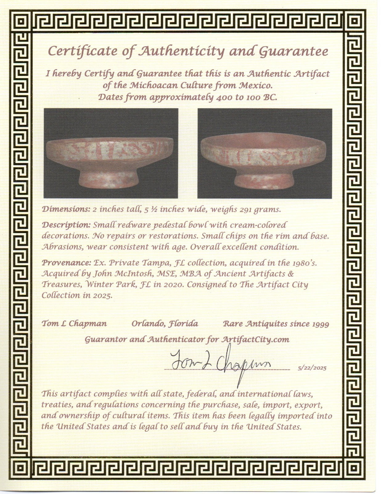 Dimensions: 2 inches tall, 5 ½ inches wide, weighs 291 grams. Description: Small redware pedestal bowl with cream-colored decorations. No repairs or restorations. Small chips on the rim and base. Abrasions, wear consistent with age. Overall excellent condition. Provenance: Ex. Private Tampa, FL collection, acquired in the 1980’s. Acquired by John McIntosh, MSE, MBA of Ancient Artifacts & Treasures, Winter Park, FL in 2020. Consigned to The Artifact City Collection in 2025.