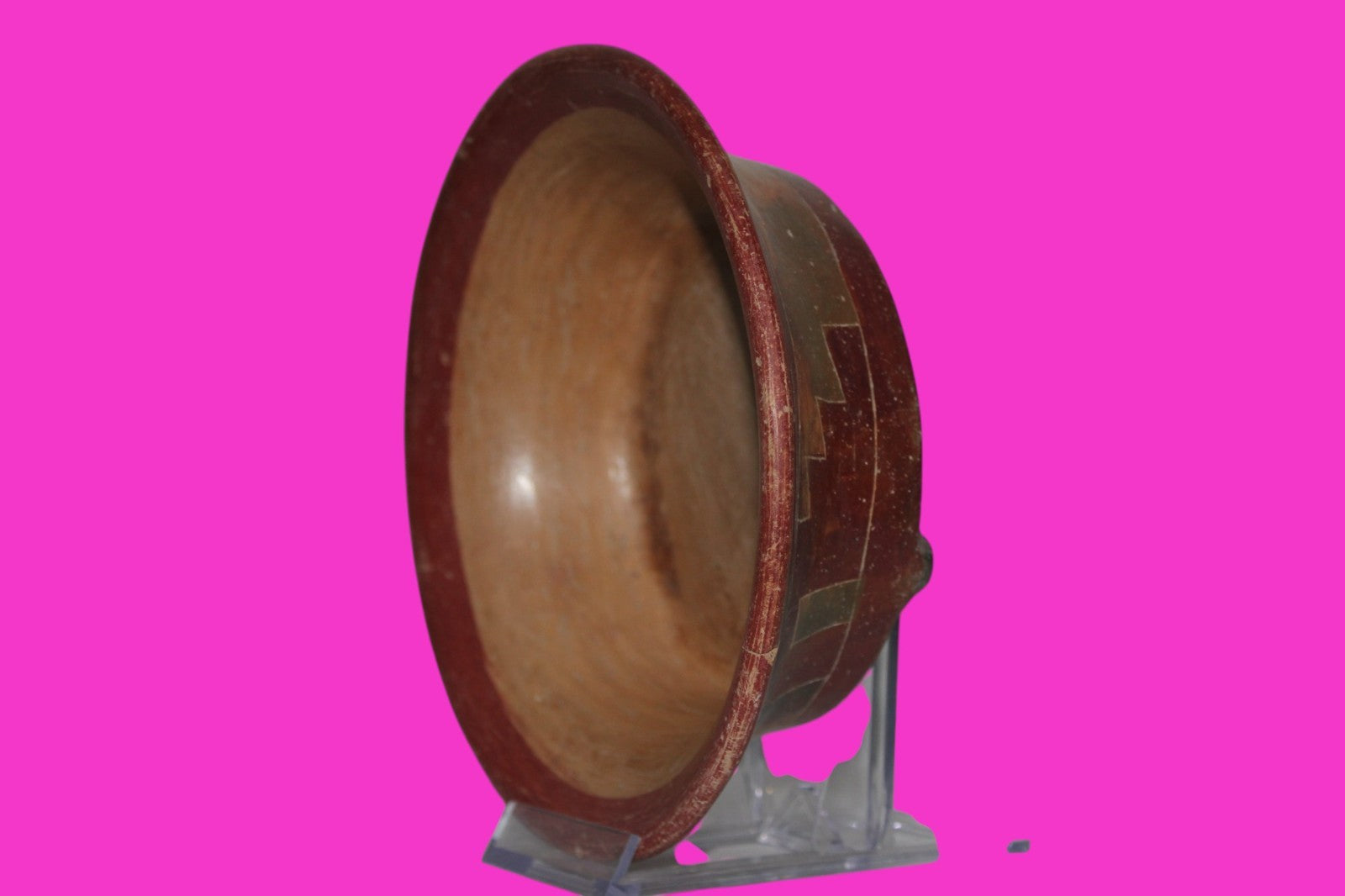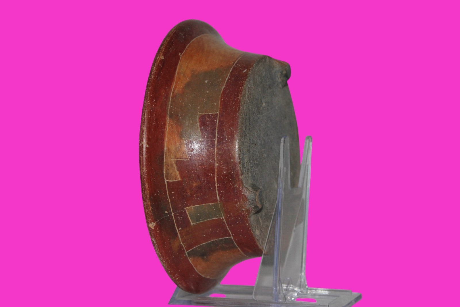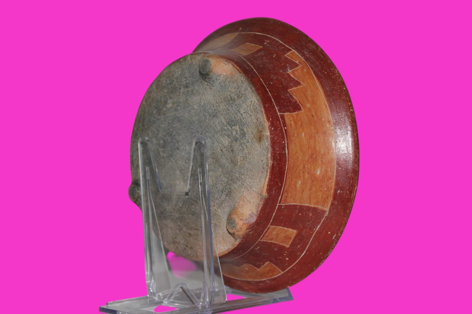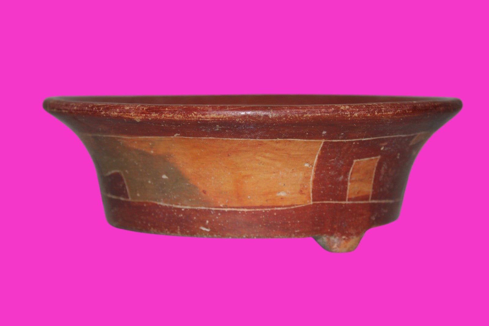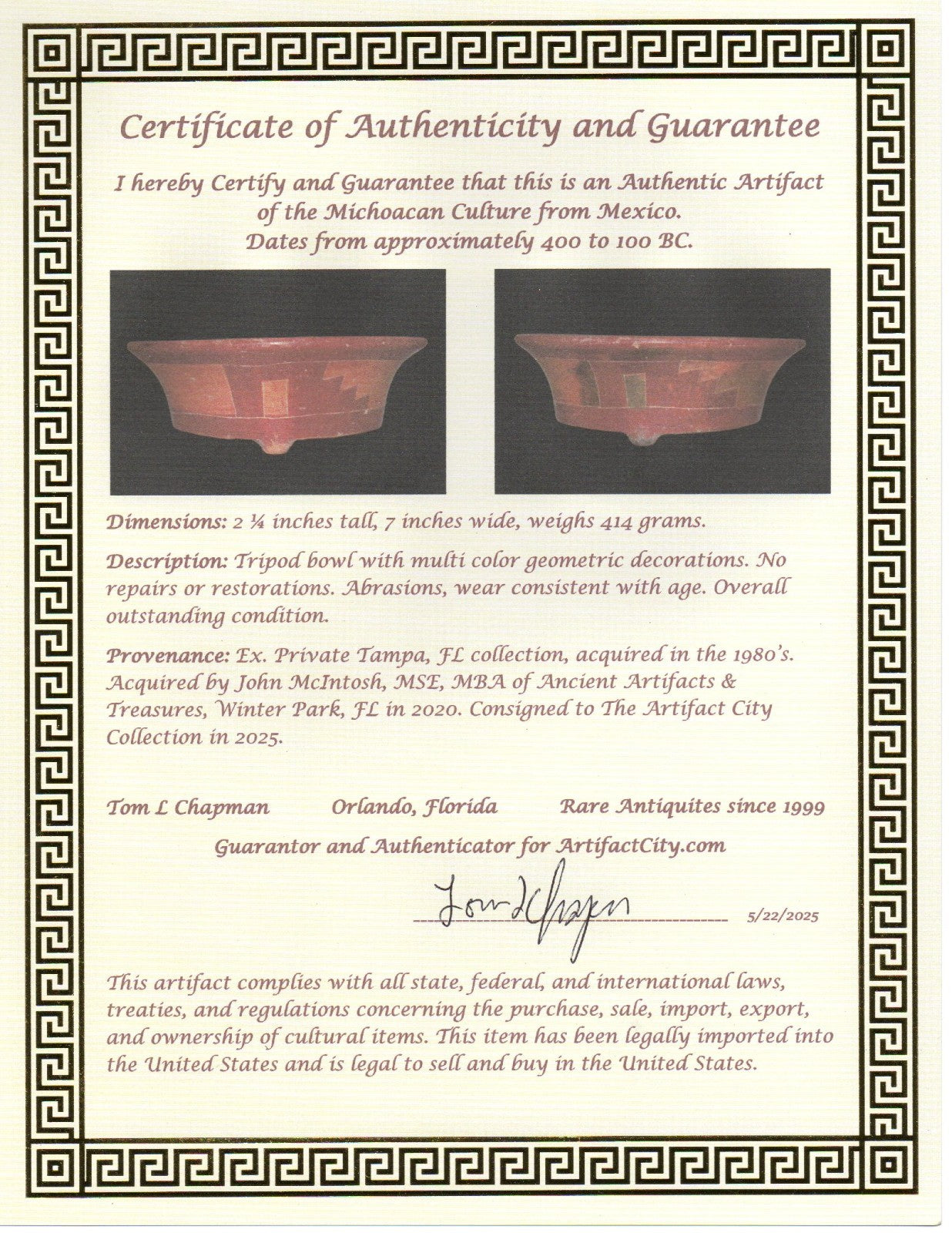 Dimensions: 2 ¼ inches tall, 7 inches wide, weighs 414 grams. Description: Tripod bowl with multi color geometric decorations. No repairs or restorations. Abrasions, wear consistent with age. Overall outstanding condition. Provenance: Ex. Private Tampa, FL collection, acquired in the 1980’s. Acquired by John McIntosh, MSE, MBA of Ancient Artifacts & Treasures, Winter Park, FL in 2020. Consigned to The Artifact City Collection in 2025.