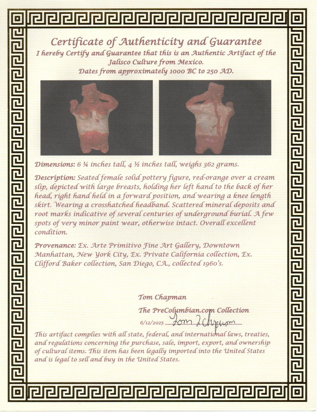 Dimensions: 6 ¼ inches tall, 4 ½ inches tall, weighs 362 grams.Description: Seated female solid pottery figure, red-orange over a cream slip, depicted with large breasts, holding her left hand to the back of her head, right hand held in a forward position, and wearing a knee length skirt. Wearing a crosshatched headband. Scattered mineral deposits and root marks indicative of several centuries of underground burial. A few spots of very minor paint wear, otherwise intact. Overall excellent condition.Provenance: Ex. Arte Primitivo Fine Art Gallery, Downtown Manhattan, New York City, Ex. Private California collection, Ex. Clifford Baker collection, San Diego, CA., collected 1960’s.